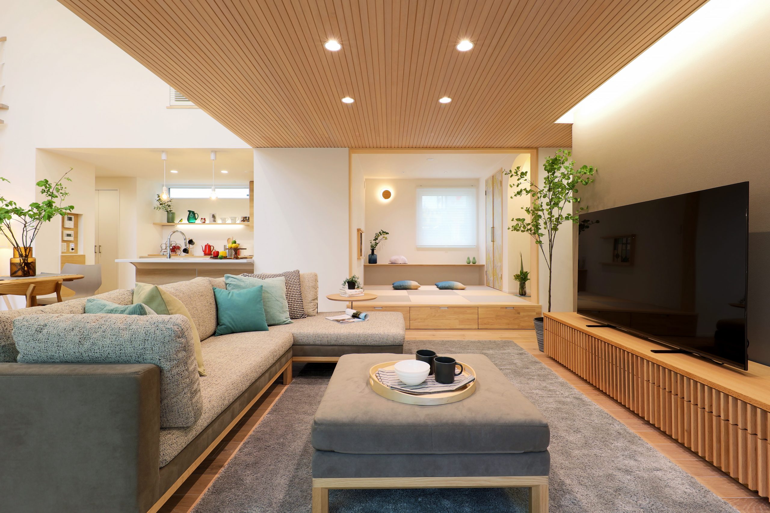 ◎吹き抜けのダイニングと、あえて天井高を下げたリビングをワンフロアに。天井のダイナミックな高低差で落ち着きのあるリビング空間に。