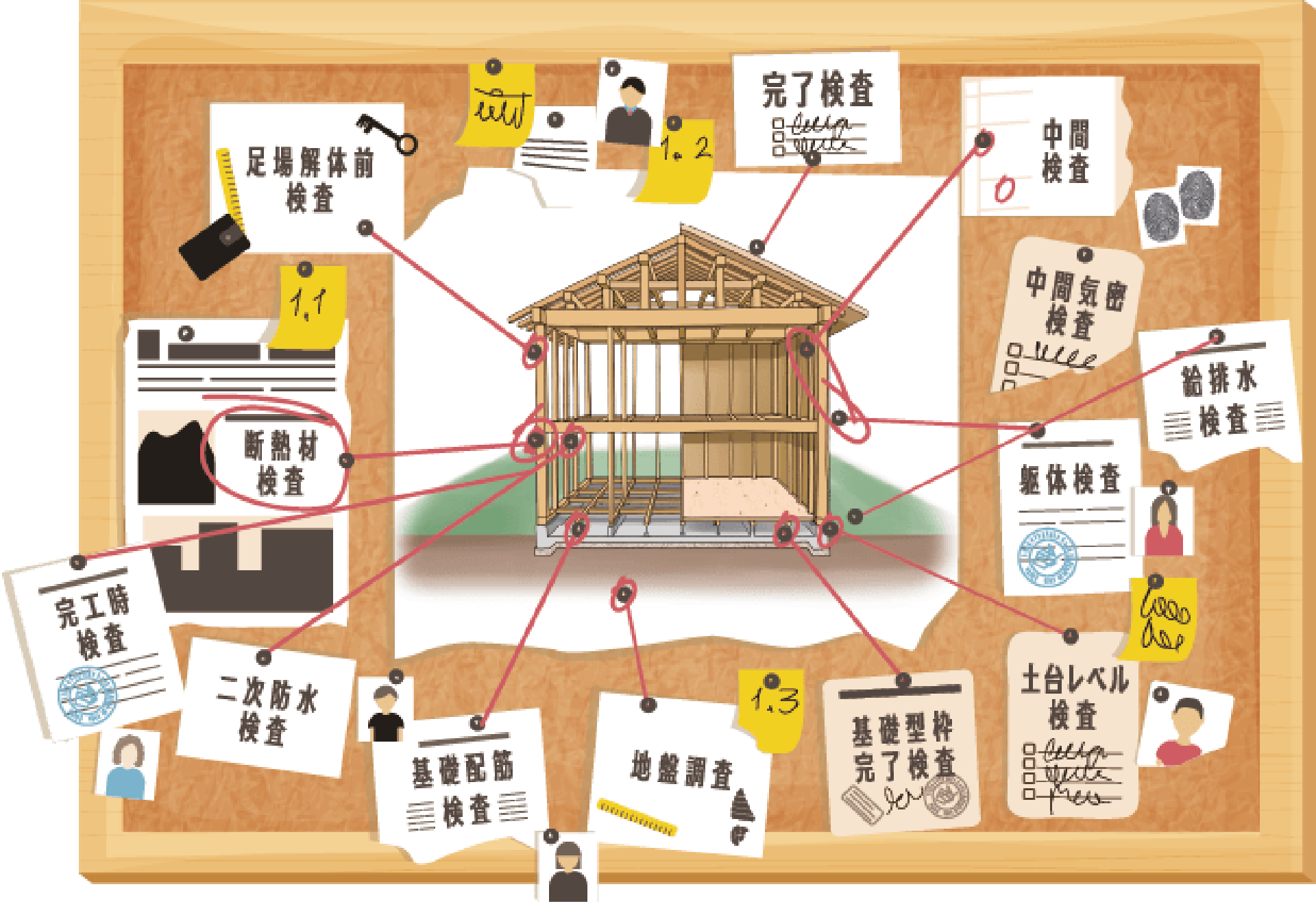 着工からお引き渡しまでに、13の厳しいチェック項目を設け、第三者機関と共に厳正なる調査・検査を行い、お客様に安心安全な住宅を提供しています。