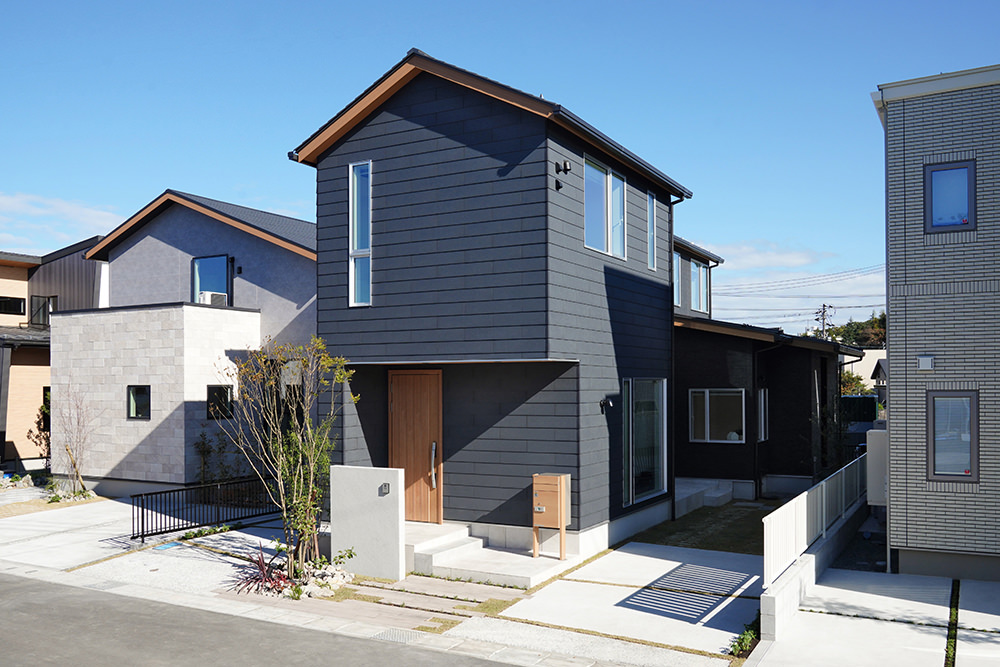 シンプルでアクセントの効いた外観がお洒落な佇まい。玄関から続く広い土間は手洗いと収納を備え、テラスへの繋がりで中庭との一体感も感じられます。お風呂・トイレ・洗面台の水回りは、家の形をした下がり壁で仕切られており、来客時でも生活感を感じさせず、家族が気兼ねなく使う事ができます。