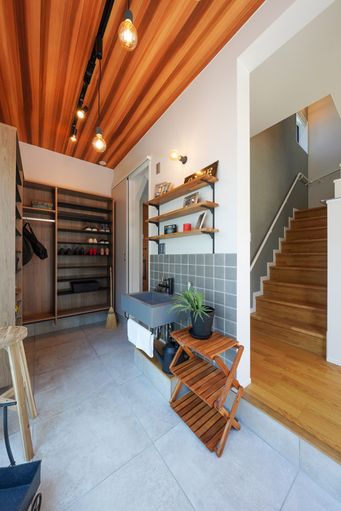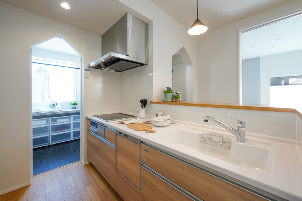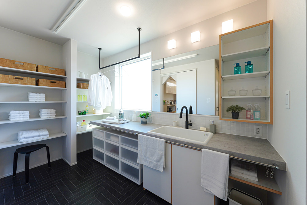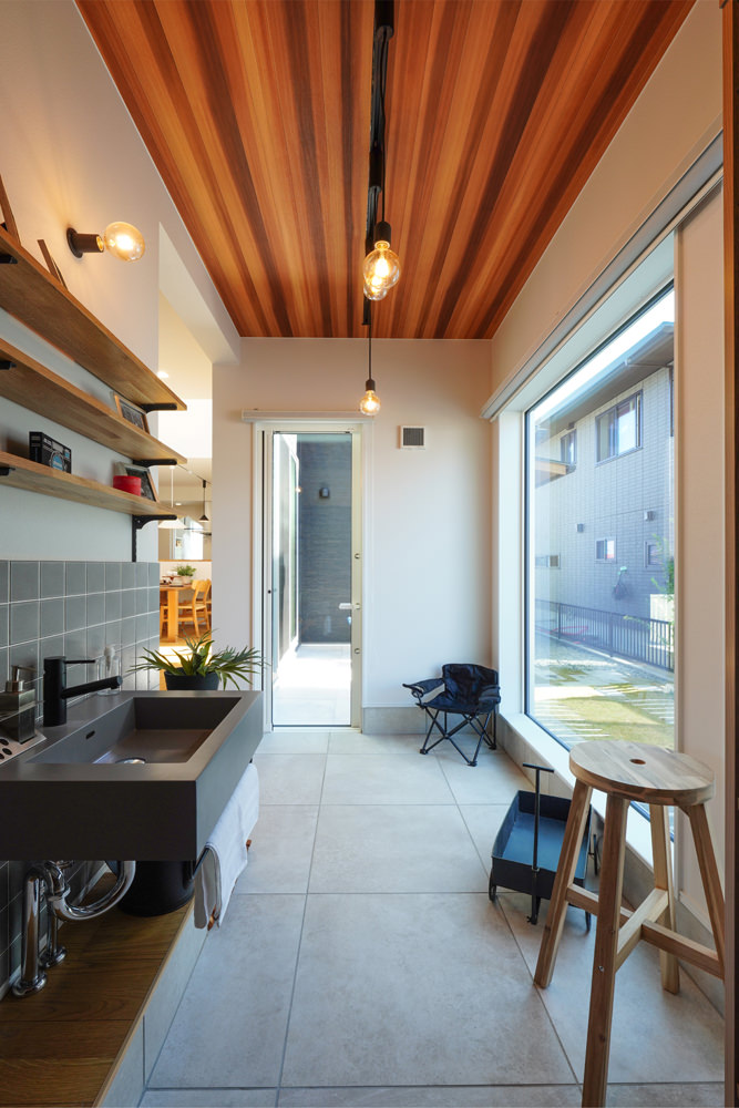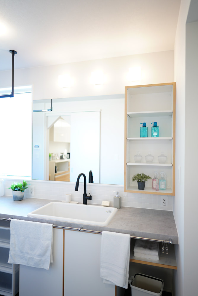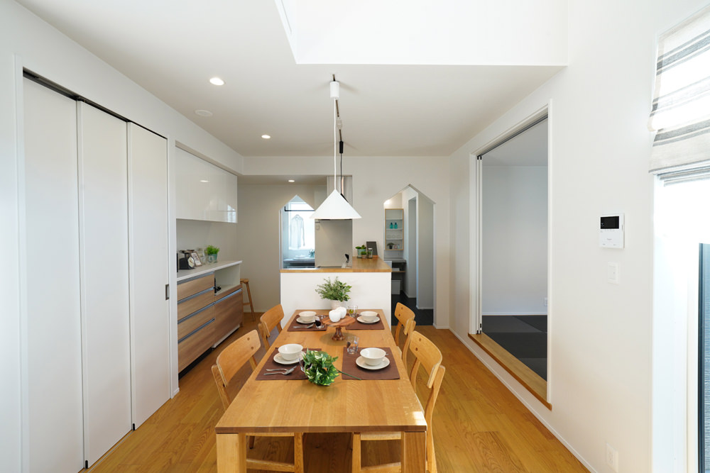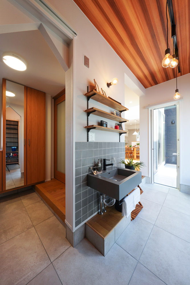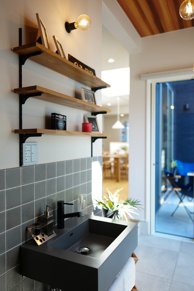 シンプルでアクセントの効いた外観がお洒落な佇まい。玄関から続く広い土間は手洗いと収納を備え、テラスへの繋がりで中庭との一体感も感じられます。お風呂・トイレ・洗面台の水回りは、家の形をした下がり壁で仕切られており、来客時でも生活感を感じさせず、家族が気兼ねなく使う事ができます。
