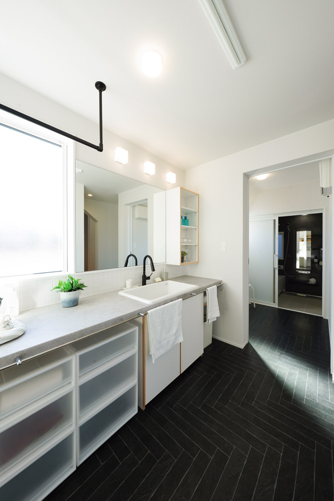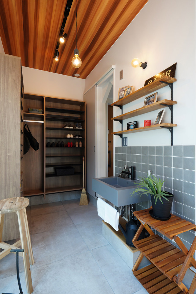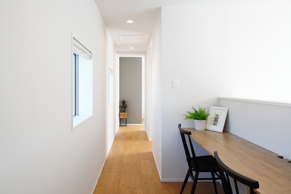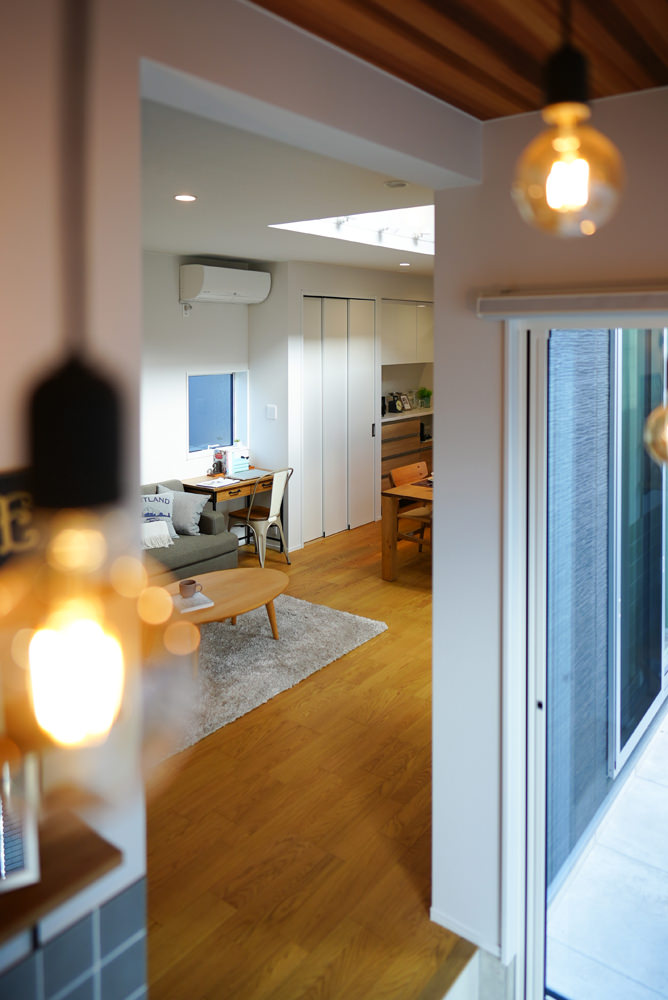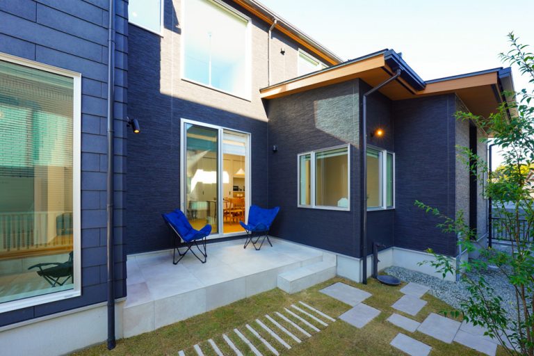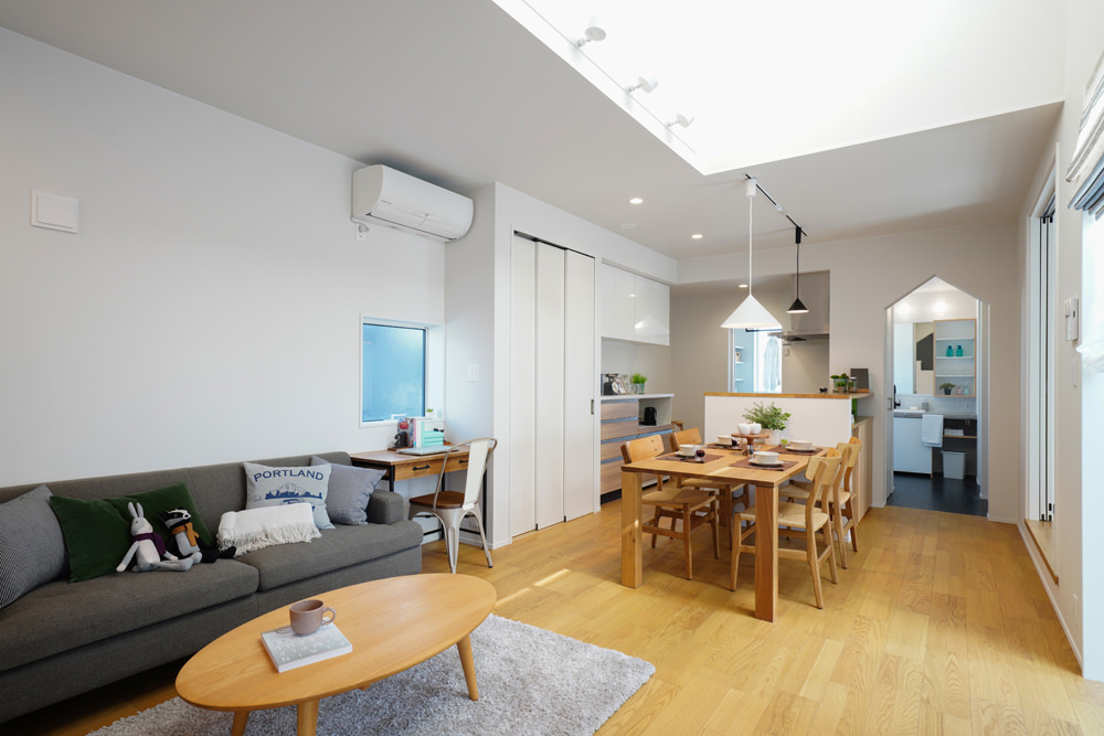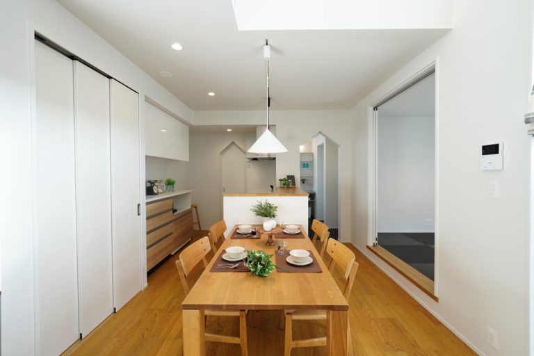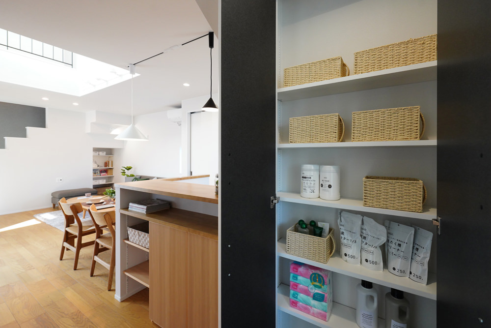 シンプルでアクセントの効いた外観がお洒落な佇まい。玄関から続く広い土間は手洗いと収納を備え、テラスへの繋がりで中庭との一体感も感じられます。お風呂・トイレ・洗面台の水回りは、家の形をした下がり壁で仕切られており、来客時でも生活感を感じさせず、家族が気兼ねなく使う事ができます。