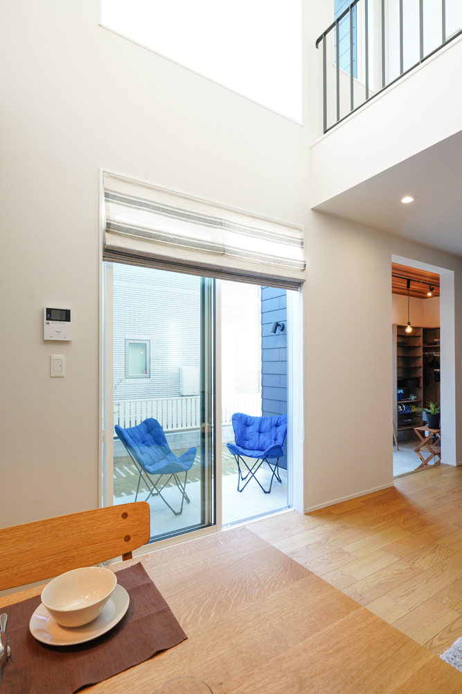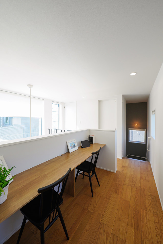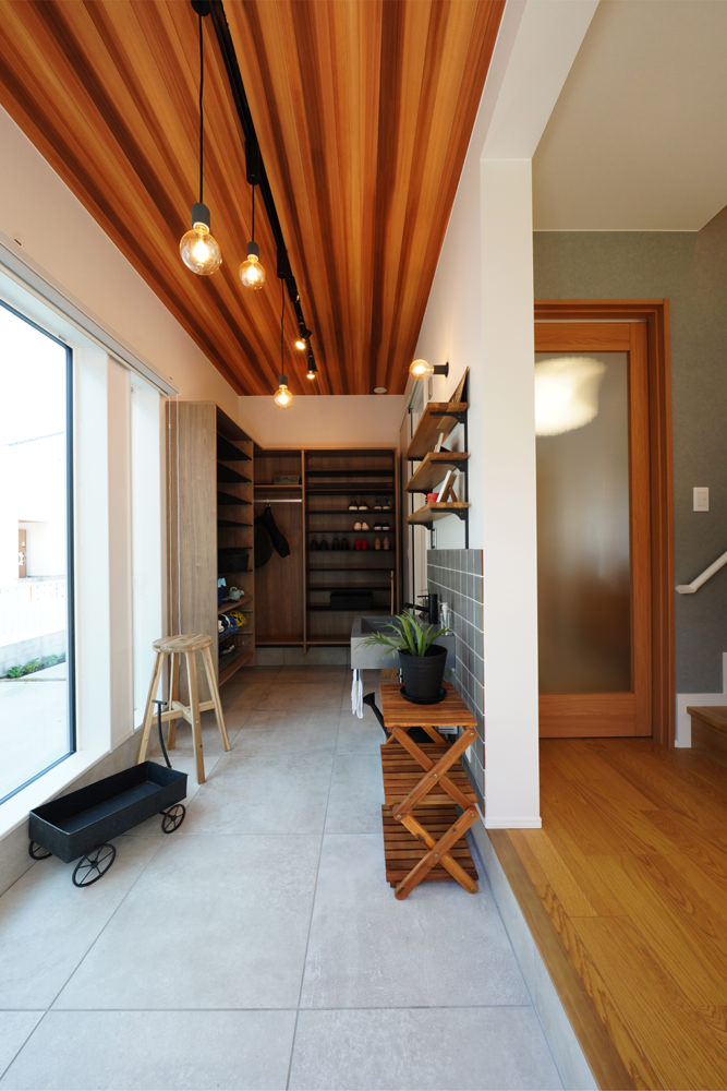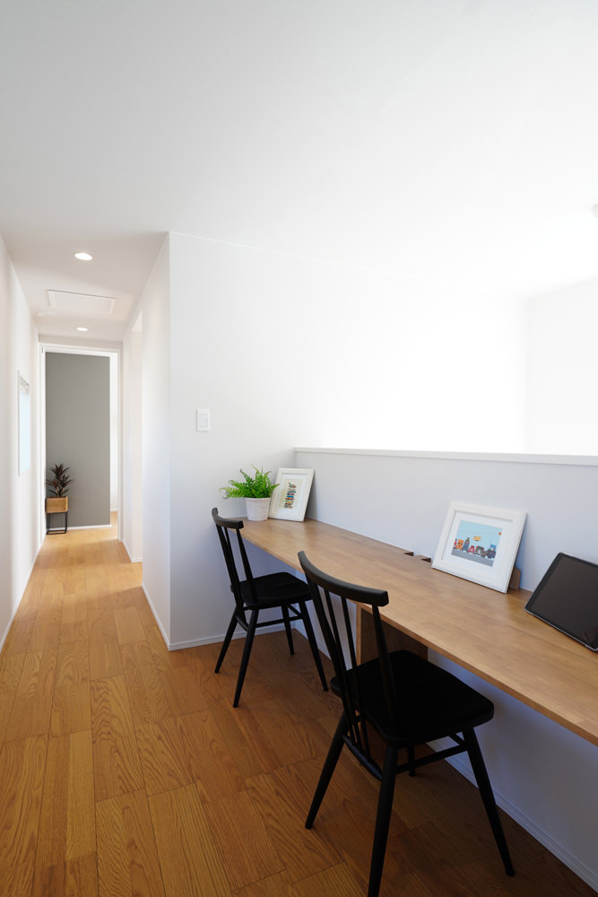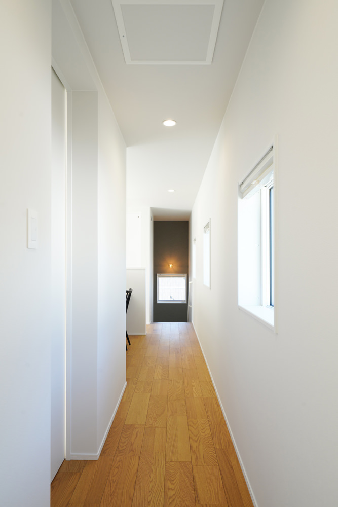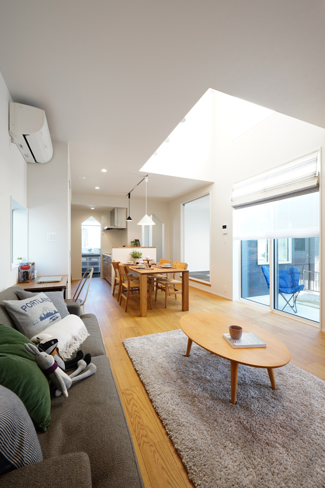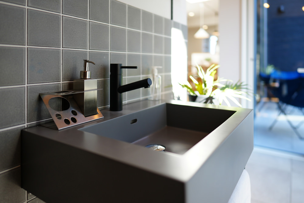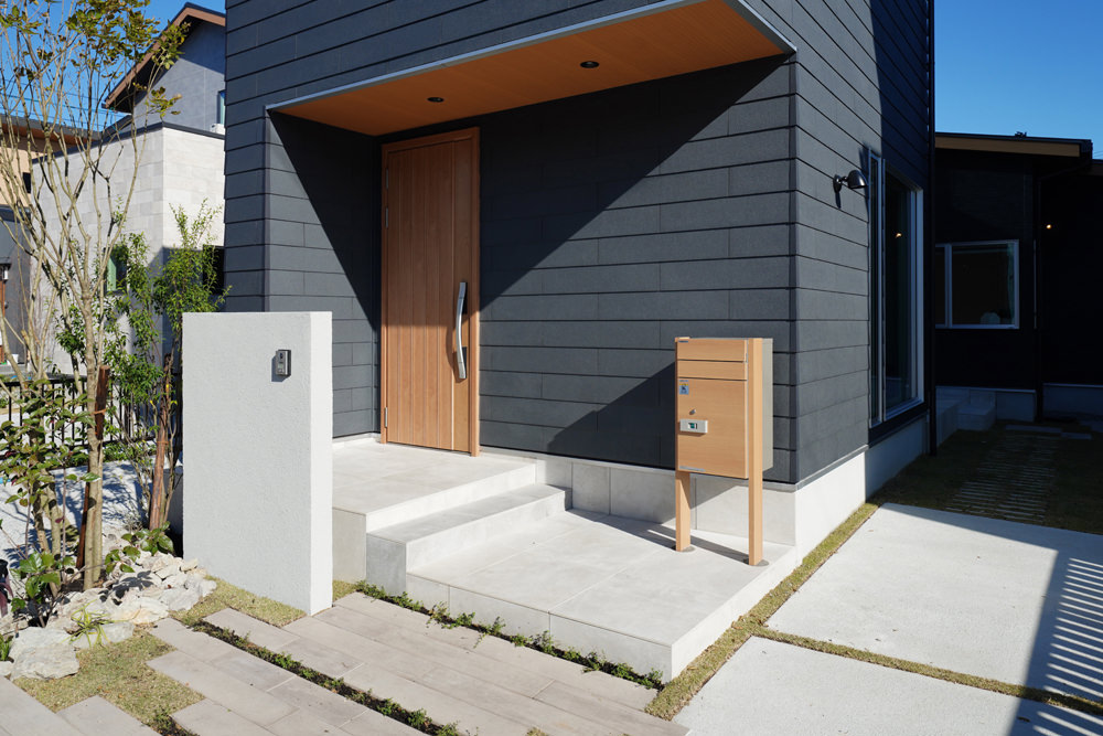 シンプルでアクセントの効いた外観がお洒落な佇まい。玄関から続く広い土間は手洗いと収納を備え、テラスへの繋がりで中庭との一体感も感じられます。お風呂・トイレ・洗面台の水回りは、家の形をした下がり壁で仕切られており、来客時でも生活感を感じさせず、家族が気兼ねなく使う事ができます。