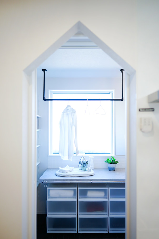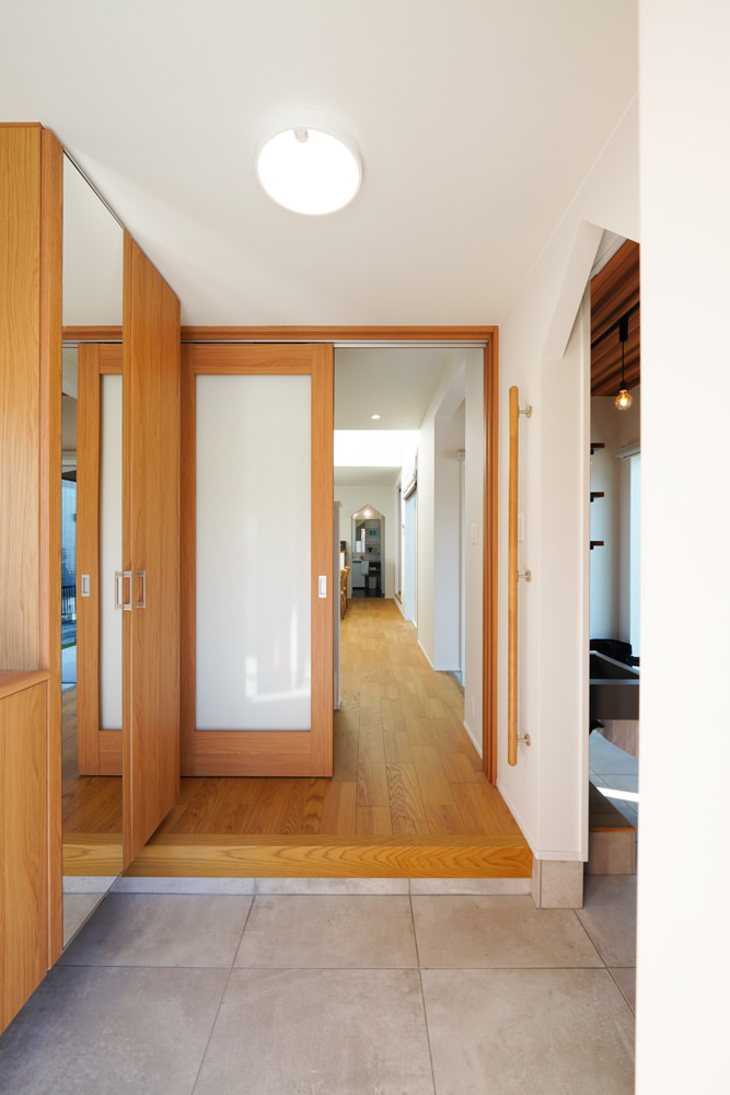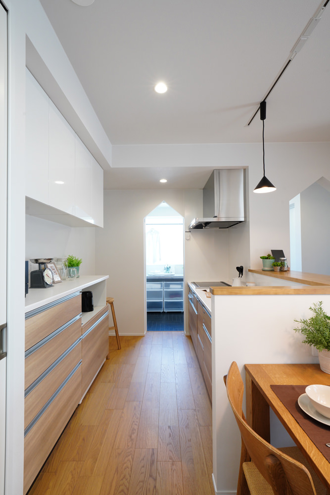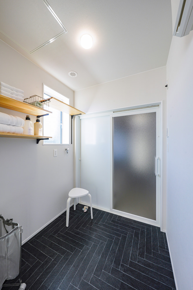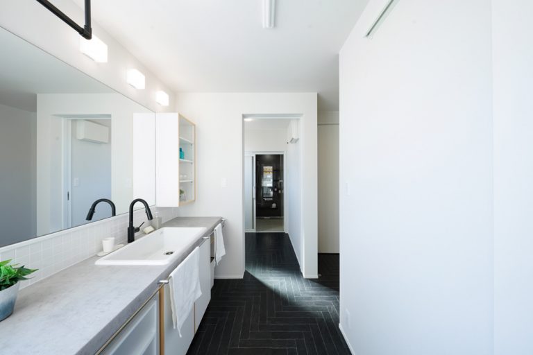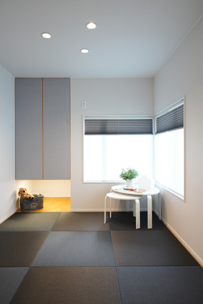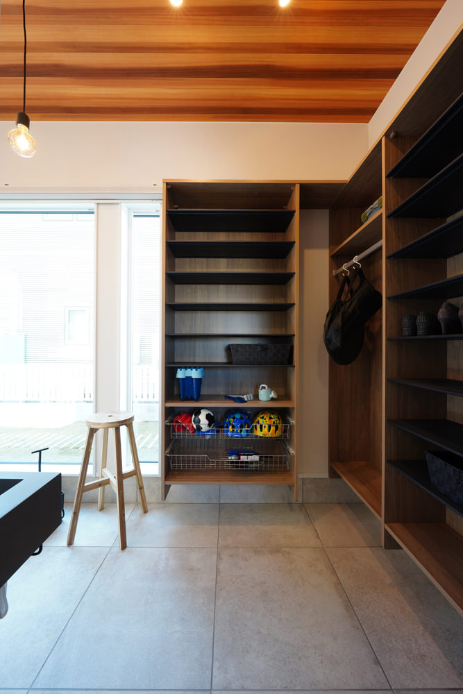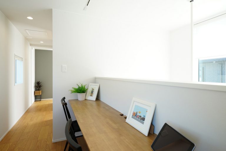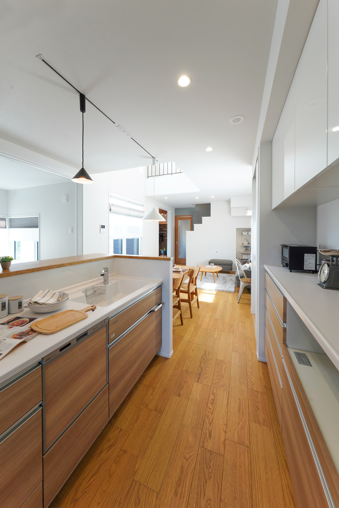 シンプルでアクセントの効いた外観がお洒落な佇まい。玄関から続く広い土間は手洗いと収納を備え、テラスへの繋がりで中庭との一体感も感じられます。お風呂・トイレ・洗面台の水回りは、家の形をした下がり壁で仕切られており、来客時でも生活感を感じさせず、家族が気兼ねなく使う事ができます。