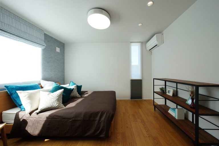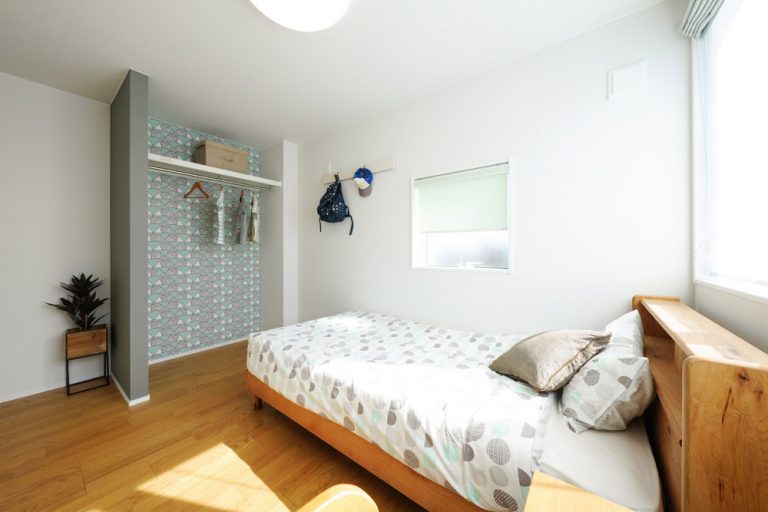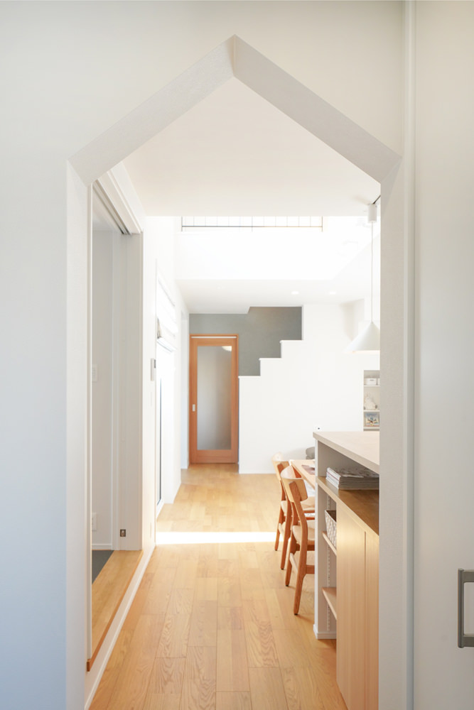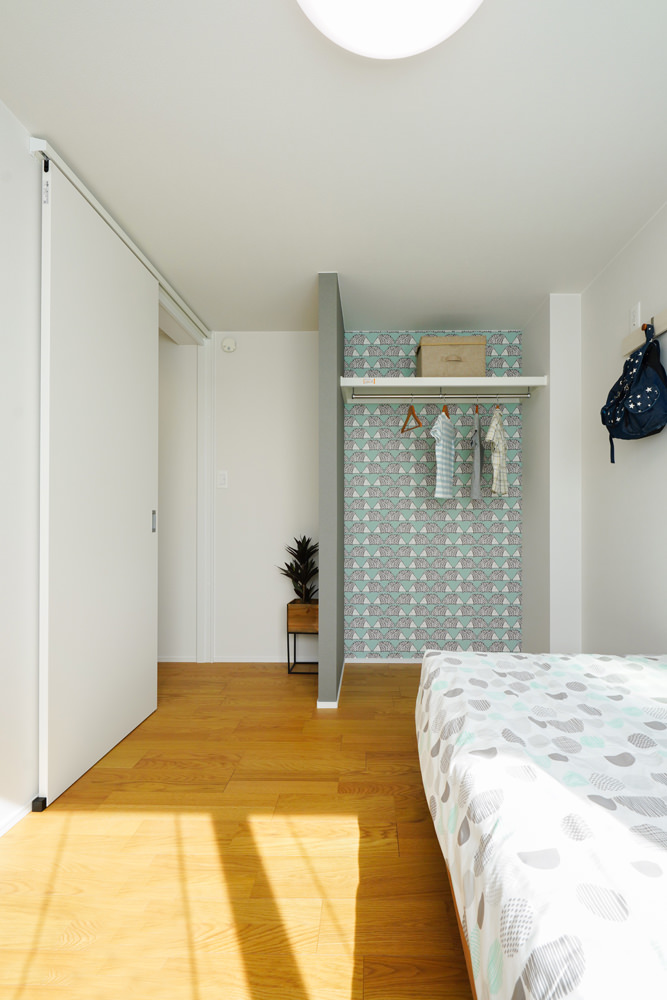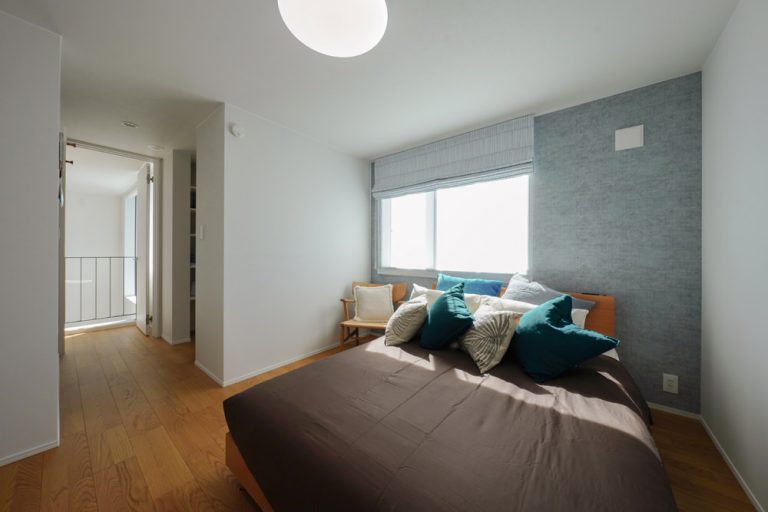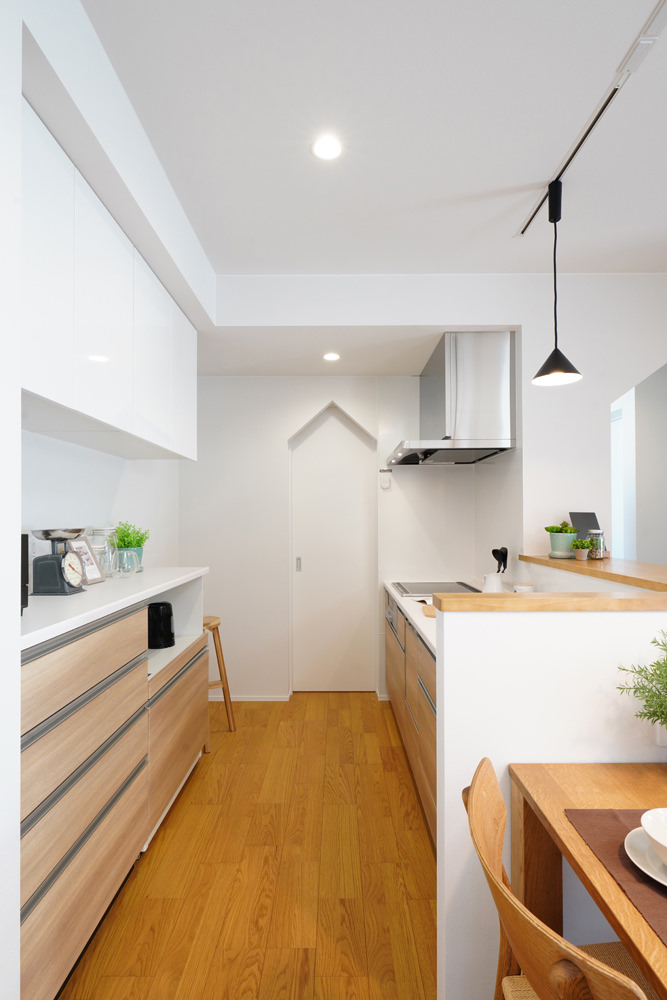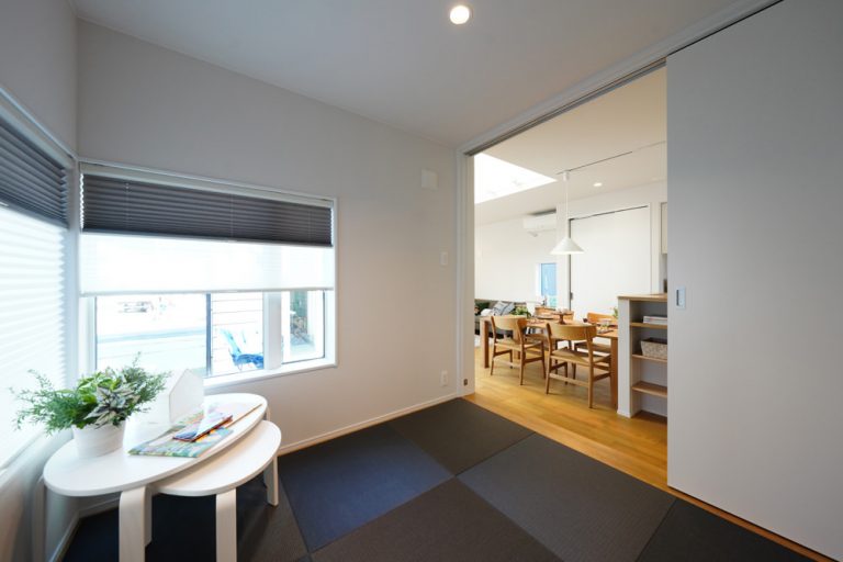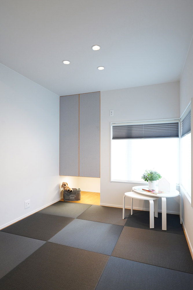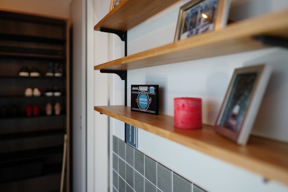 シンプルでアクセントの効いた外観がお洒落な佇まい。玄関から続く広い土間は手洗いと収納を備え、テラスへの繋がりで中庭との一体感も感じられます。お風呂・トイレ・洗面台の水回りは、家の形をした下がり壁で仕切られており、来客時でも生活感を感じさせず、家族が気兼ねなく使う事ができます。