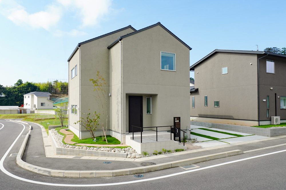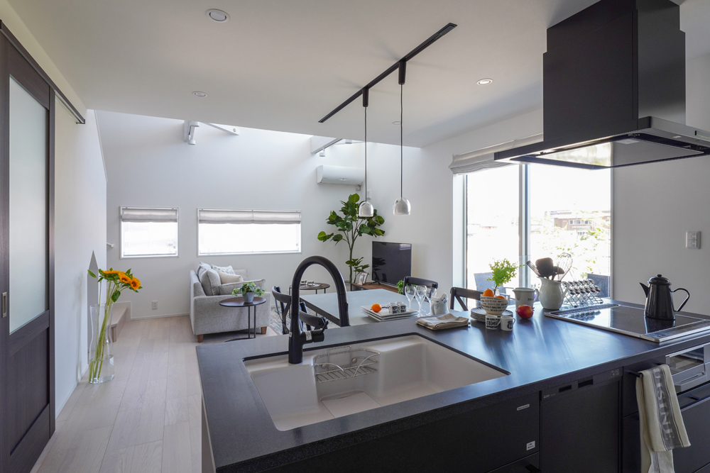随所に散りばめられた緑と調和した、閑静な街並みにそよぐ風のような佇まいの外観。玄関へ入ると家族が増えても安心の嬉しい収納4箇所を集約。1階リビングにゆったりとしたダイニングテーブルを置けば、アイランドキッチンからリビングへの広がりを演出します。キッチンは建具とともにブラック系で統一。オーク床のホワイト色や白壁とのコントラストで洗練された空間へ。さらにLDKから水回りへは回遊導線でスムースに。その快適さは住むほどに実感できます。