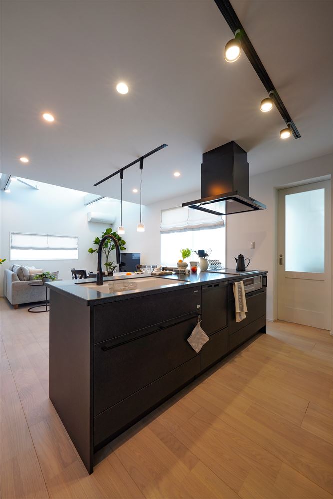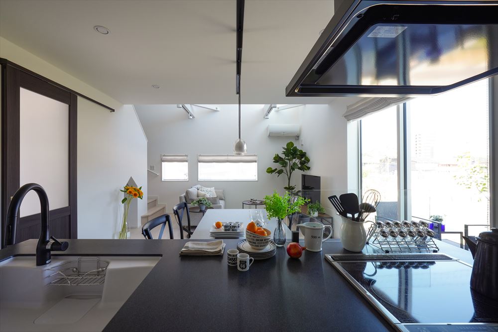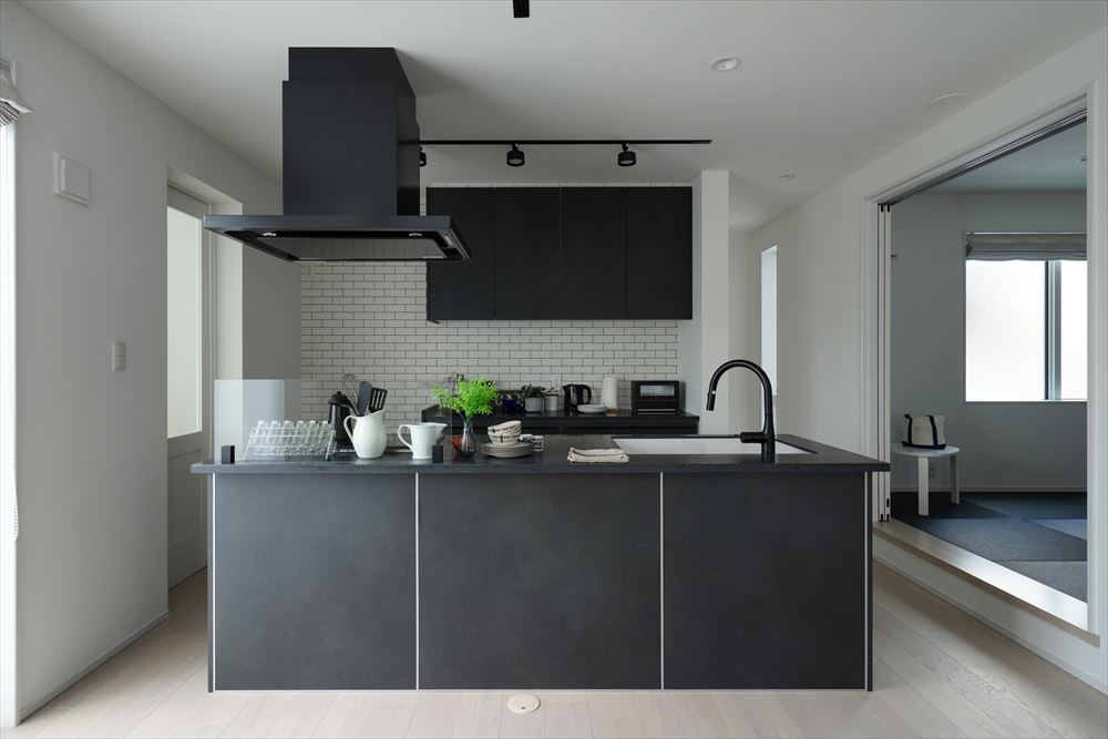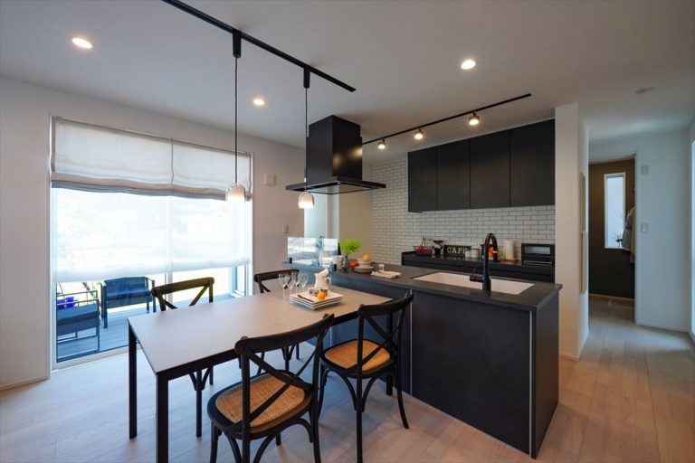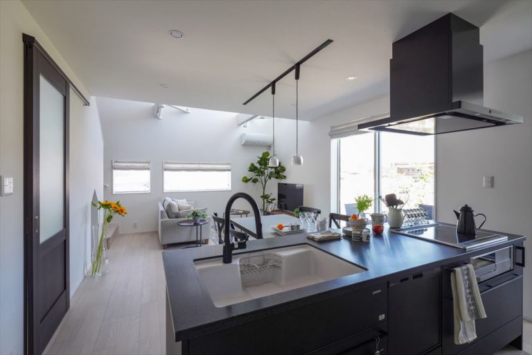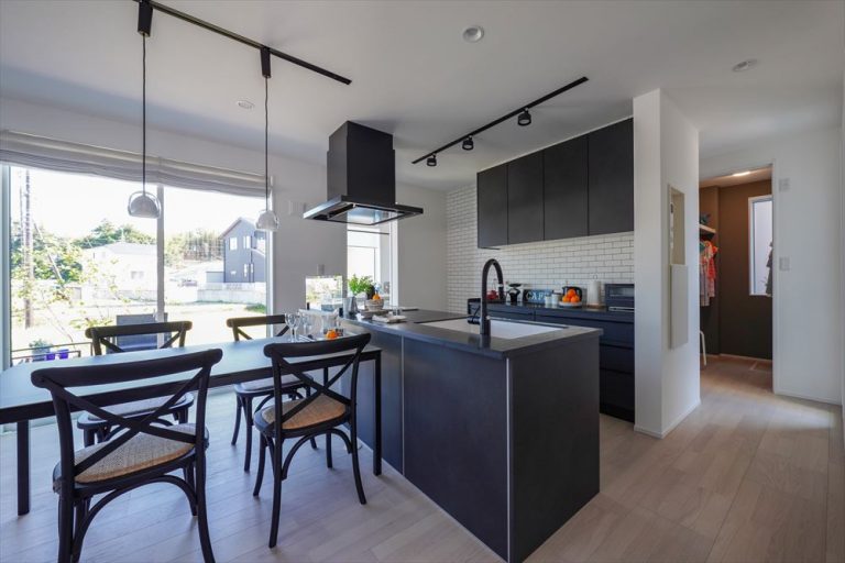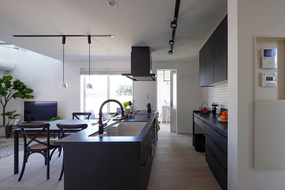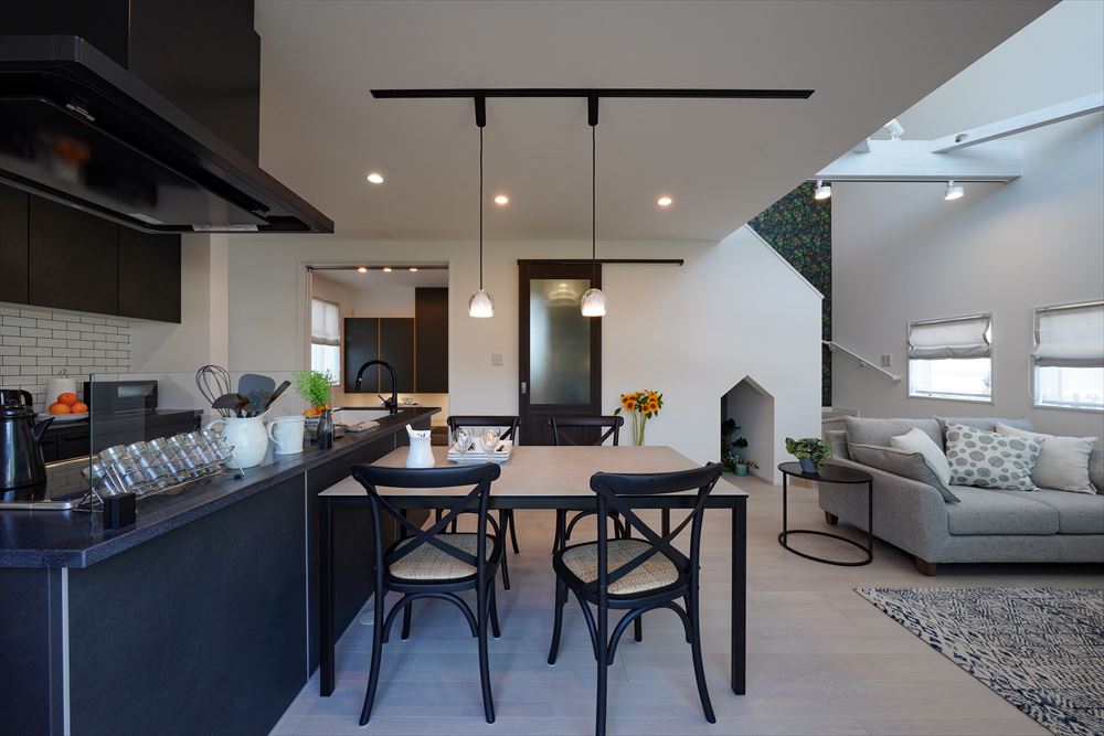 随所に散りばめられた緑と調和した、閑静な街並みにそよぐ風のような佇まいの外観。玄関へ入ると家族が増えても安心の嬉しい収納4箇所を集約。1階リビングにゆったりとしたダイニングテーブルを置けば、アイランドキッチンからリビングへの広がりを演出します。キッチンは建具とともにブラック系で統一。オーク床のホワイト色や白壁とのコントラストで洗練された空間へ。さらにLDKから水回りへは回遊導線でスムースに。その快適さは住むほどに実感できます。