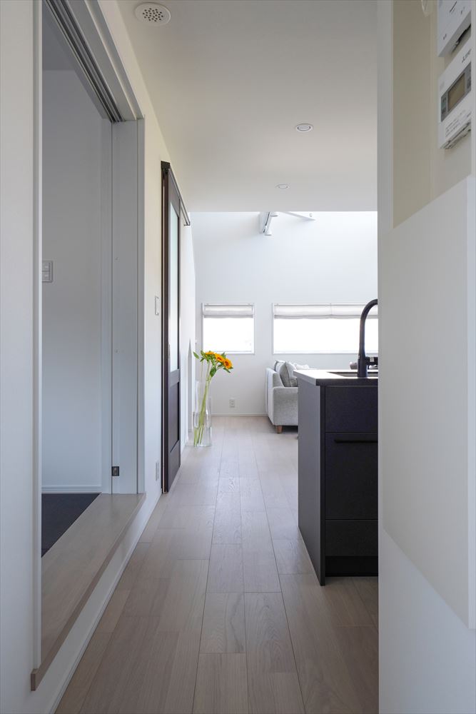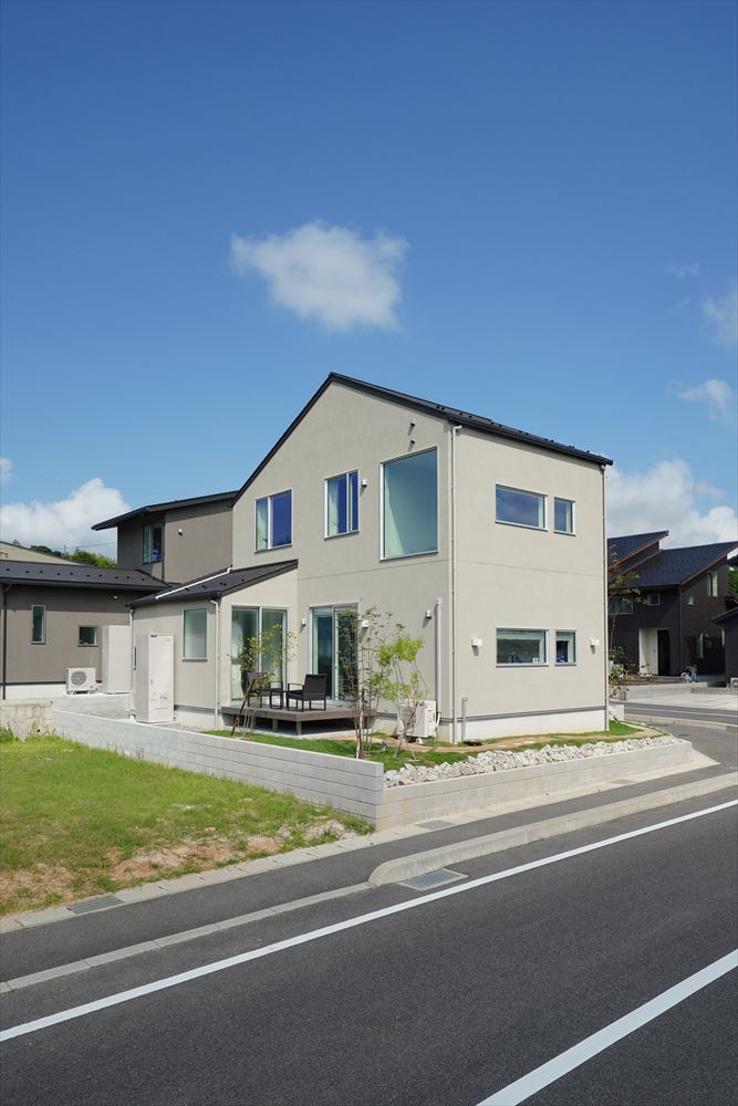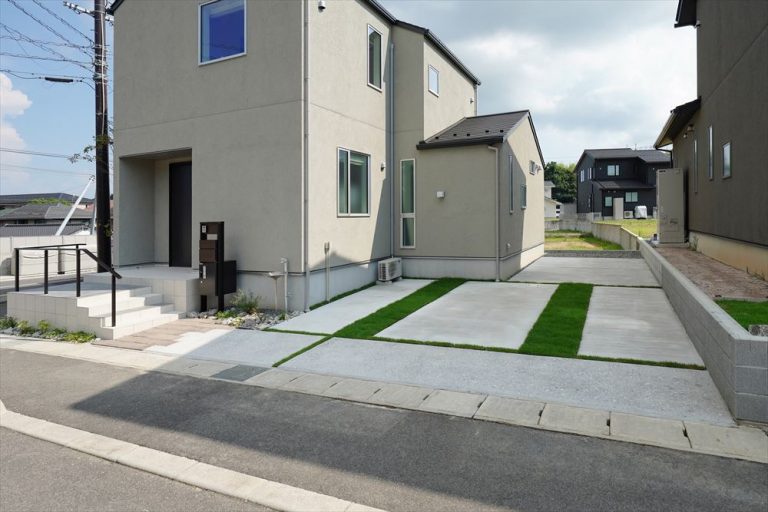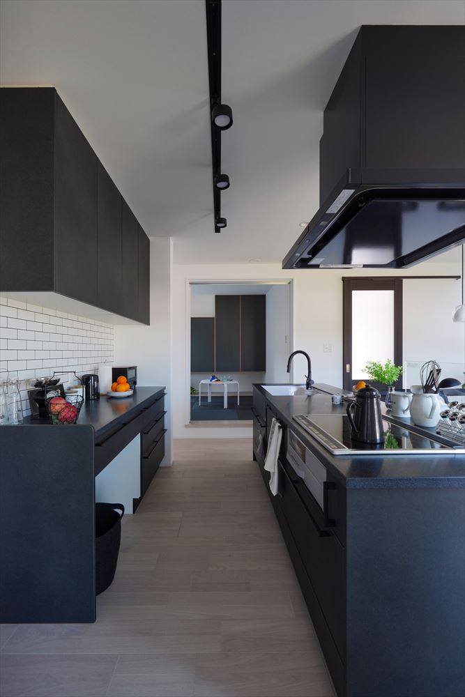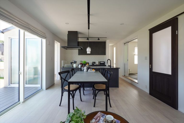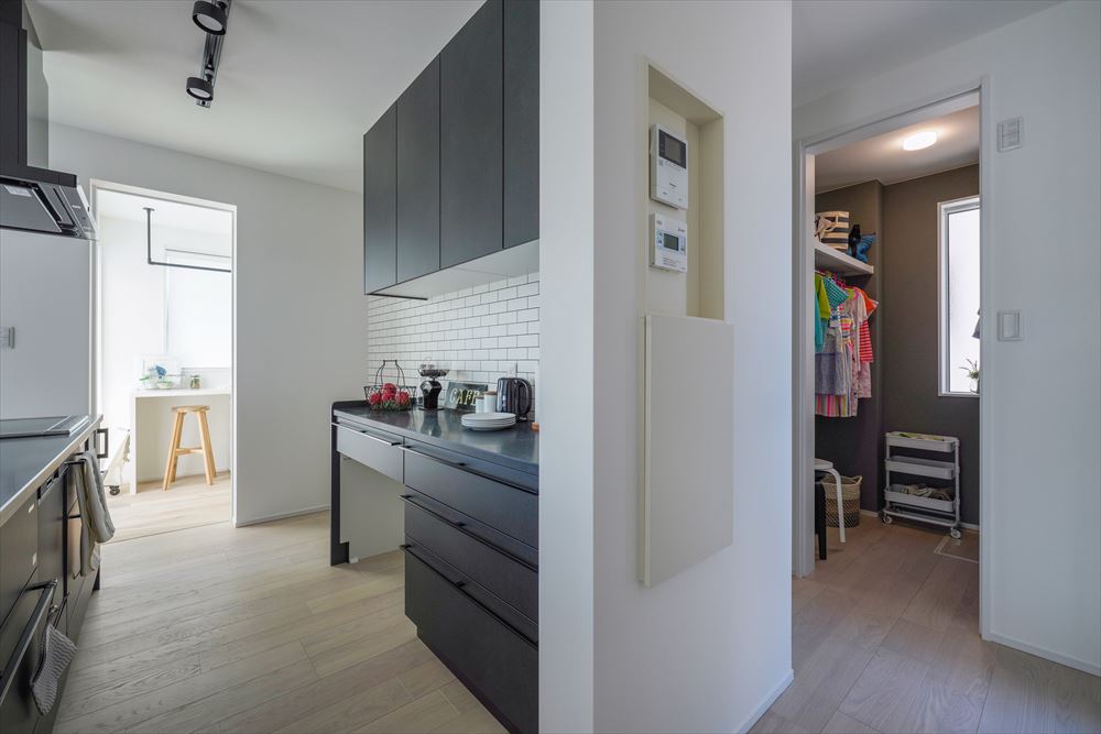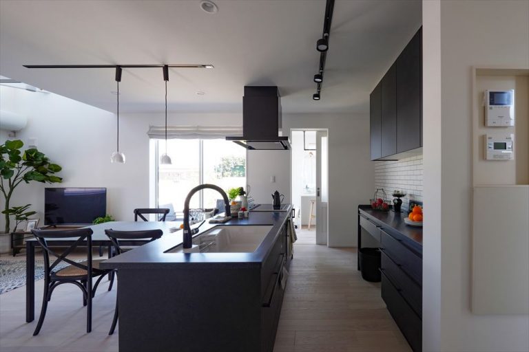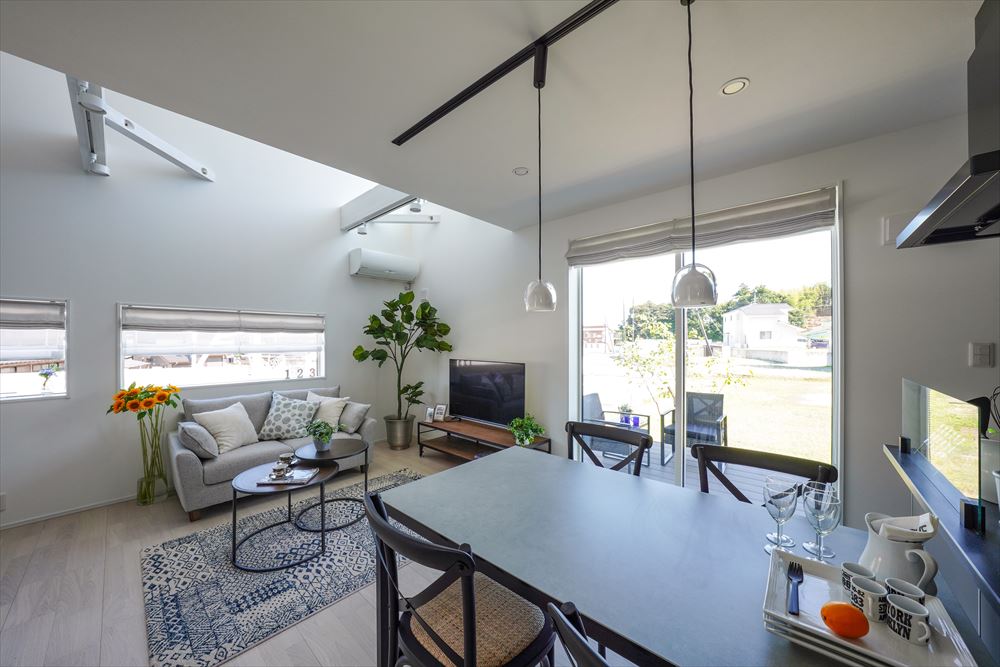 随所に散りばめられた緑と調和した、閑静な街並みにそよぐ風のような佇まいの外観。玄関へ入ると家族が増えても安心の嬉しい収納4箇所を集約。1階リビングにゆったりとしたダイニングテーブルを置けば、アイランドキッチンからリビングへの広がりを演出します。キッチンは建具とともにブラック系で統一。オーク床のホワイト色や白壁とのコントラストで洗練された空間へ。さらにLDKから水回りへは回遊導線でスムースに。その快適さは住むほどに実感できます。