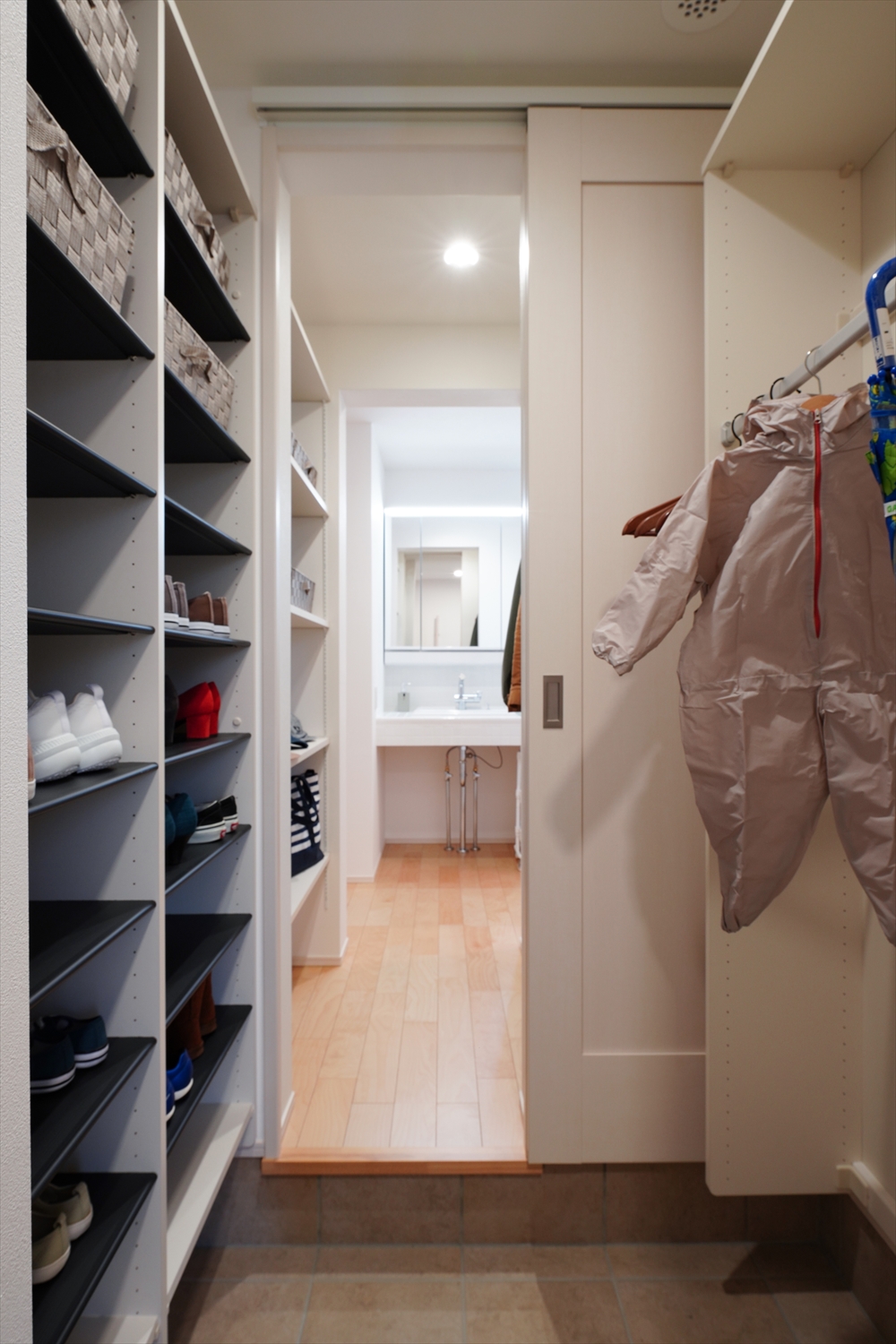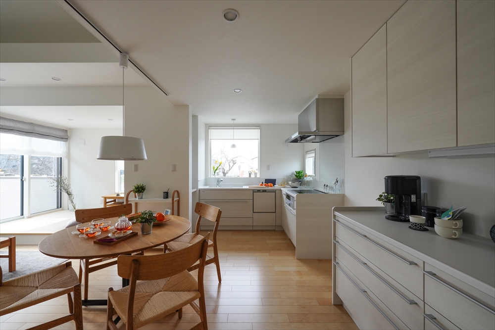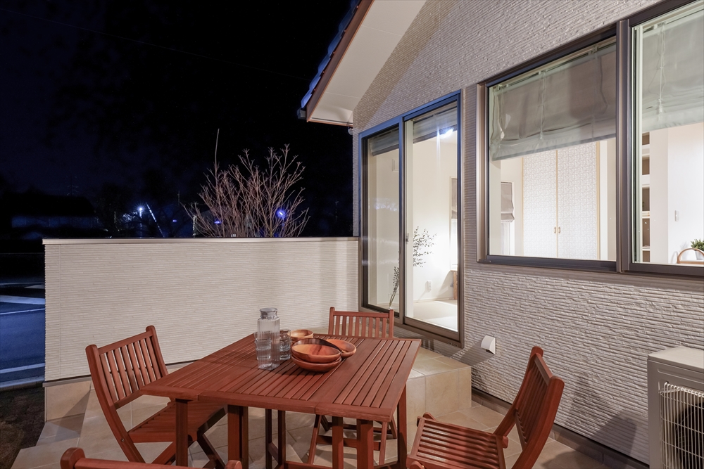 自然豊かな玉湯町に、自然を愛でる暮らしを叶えた春爛漫のお家が完成しました。最大の特徴はL型キッチンやタイルテラスからゆったりと望めるラグジュアリーな花見。保育園から響いてくる子どもたちの楽しそうな声が湯町ならではのほのぼのとしたムードを演出します。並木通りの桜は四季を奏で、まるで自宅と桜並木との境界線が消えたかのような一体感も感じられます。玄関からのリビングと水回りへの動線は2WAYに。お客様をまっすぐリビングに招きながら目立たせずに収納スペースもたっぷり確保。2階には洋室2つに加え大容量の小屋裏収納で季節物などもしっかり収められます。洗練された空間と家族の温もりを紡ぎあわせたお家です。