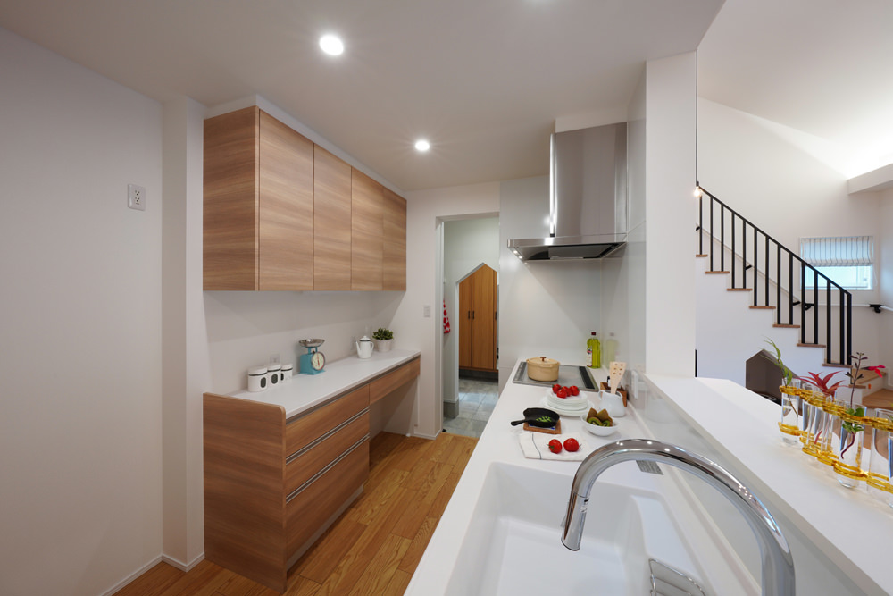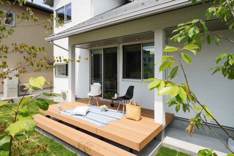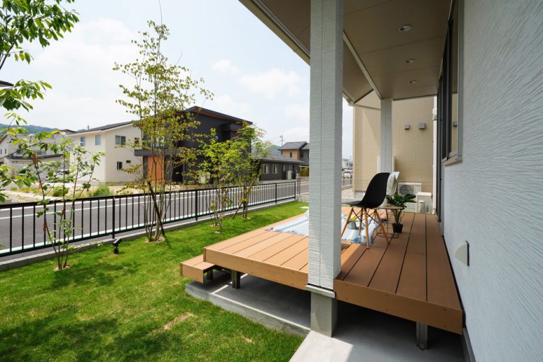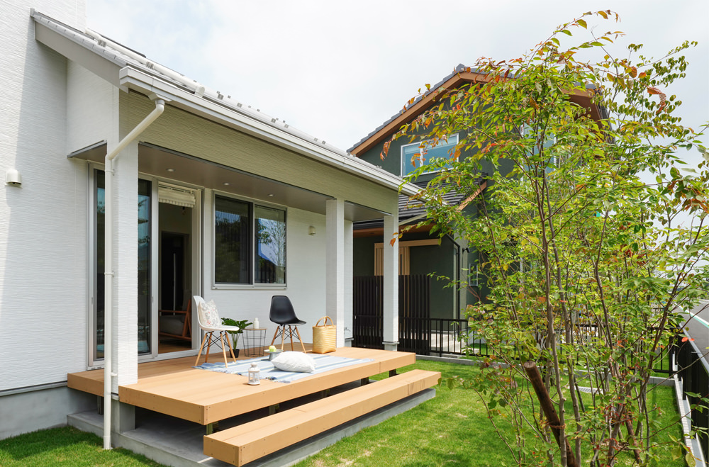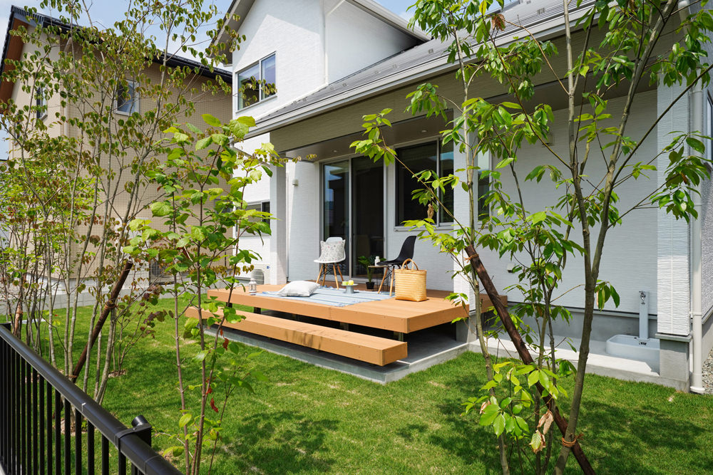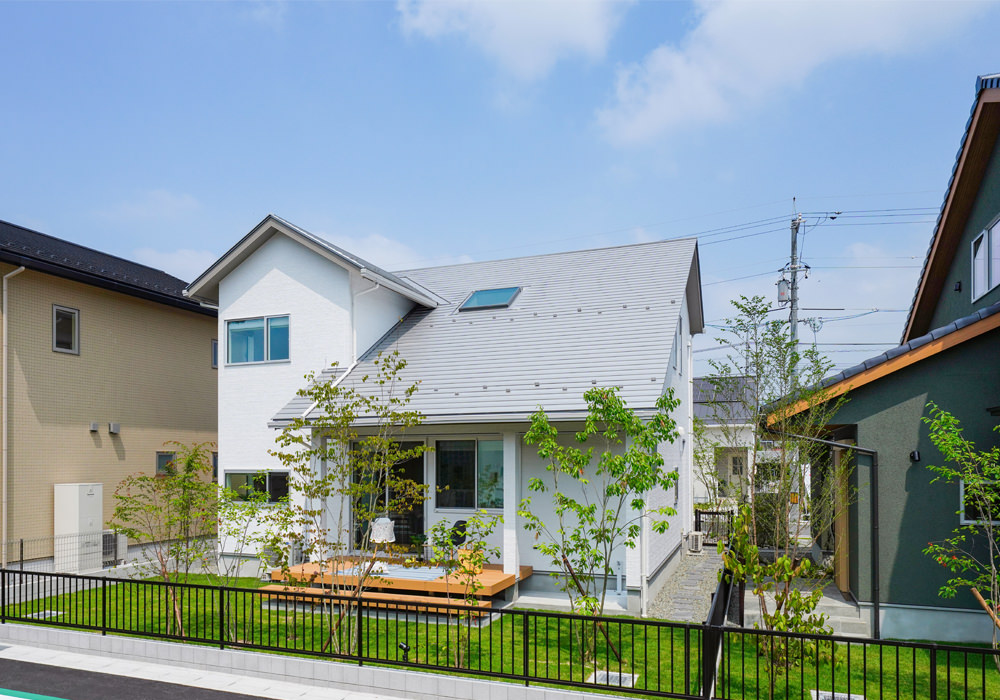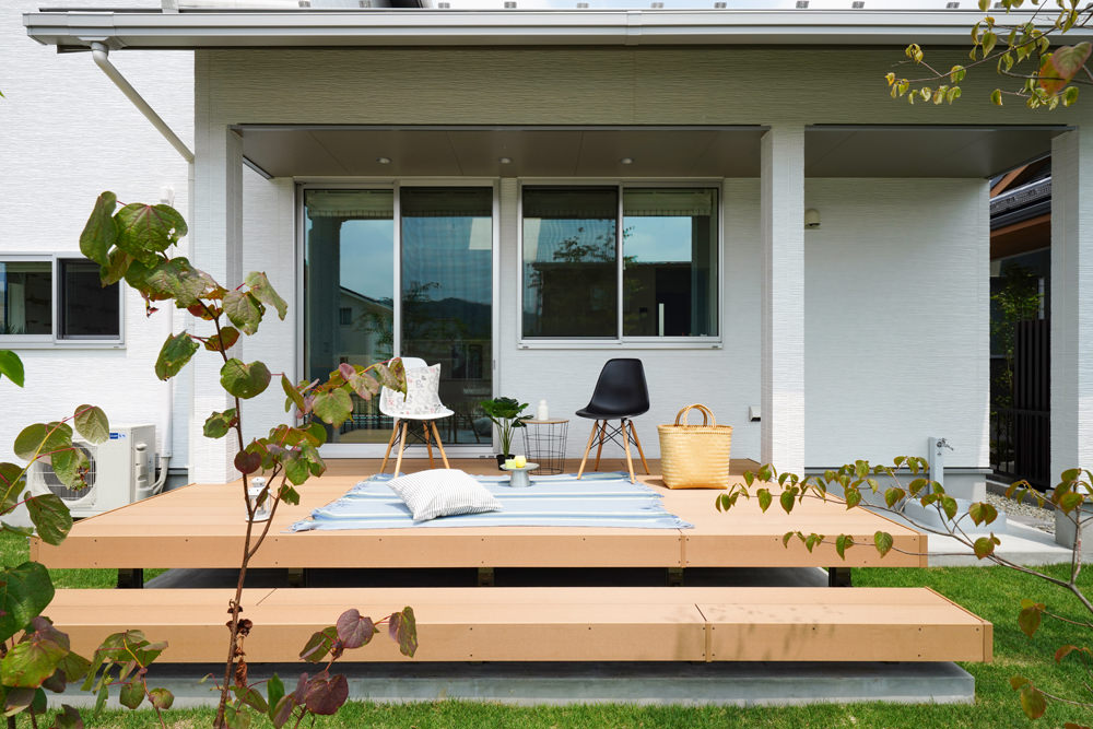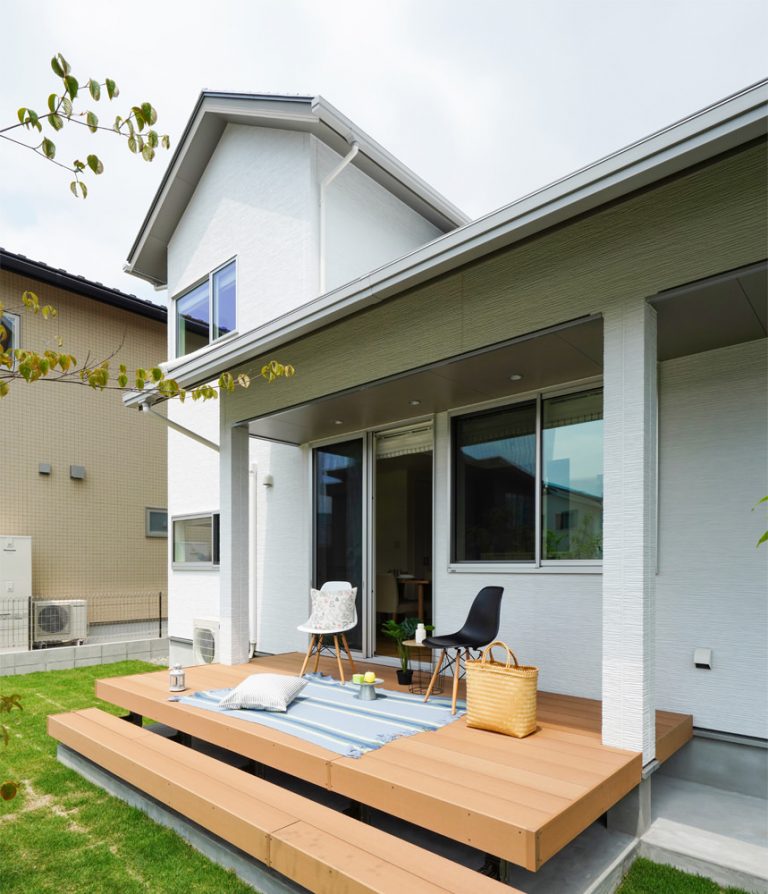 白基調の配色がシンプル好きを誘う爽かな外観。玄関からキッチンへ直接繋がる家事ラク動線と1F/2Fの大容量収納が嬉しいポイント。リビングから掃出し窓越しに繋がる大きいウッドデッキと広めの庭がアウトドア派の家族にピッタリです。ライフスタイルに応じて変化するスマートな機能性が多いところも見所ポイントです。