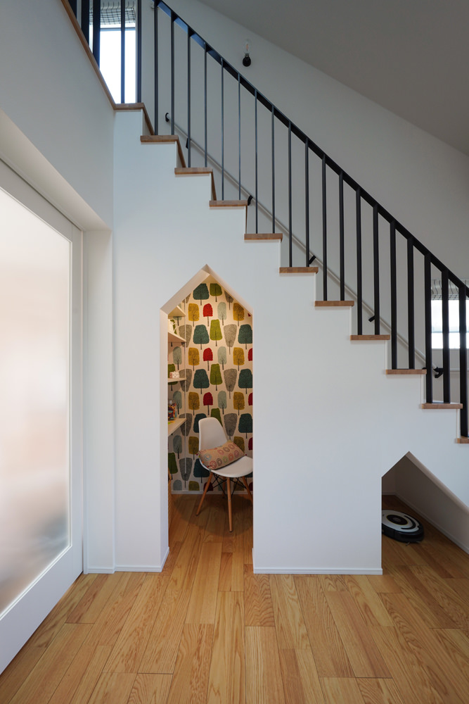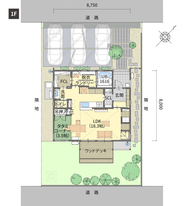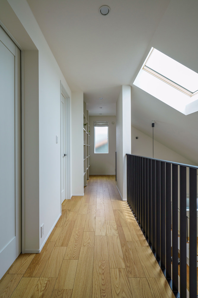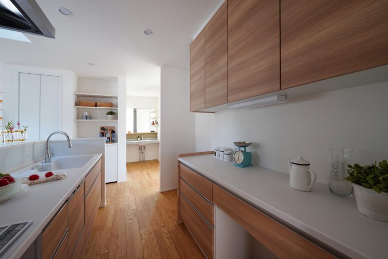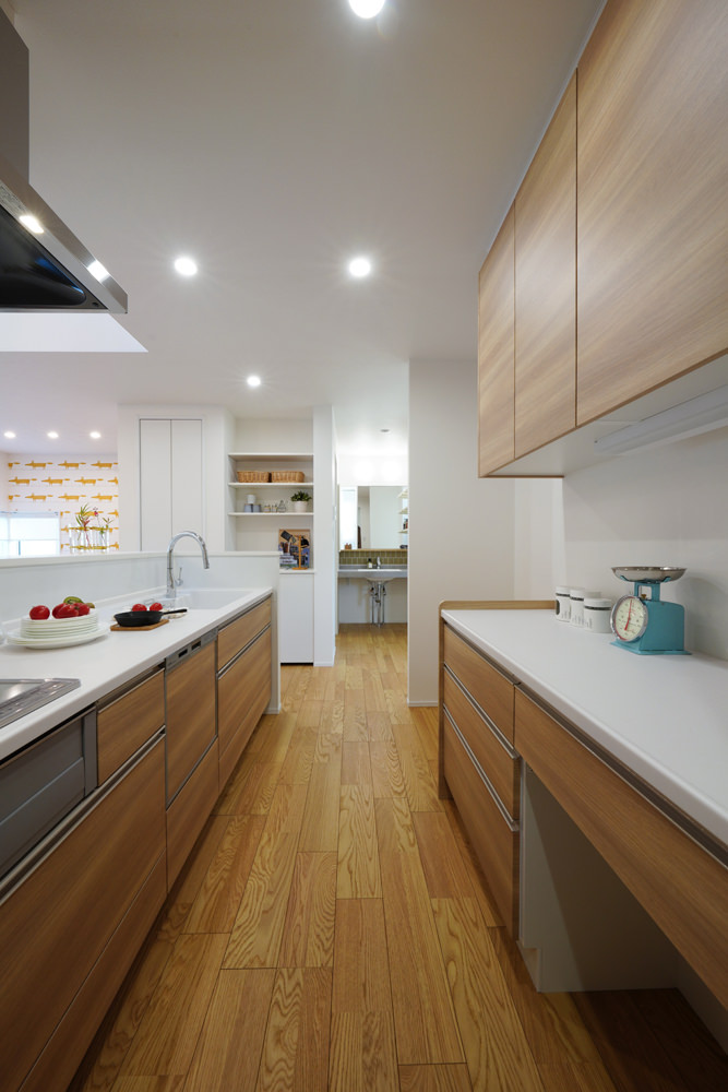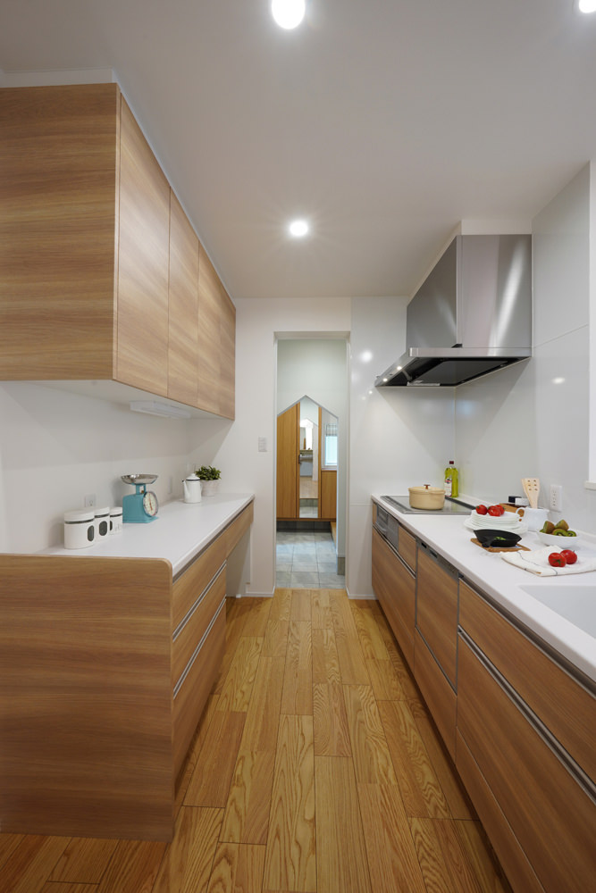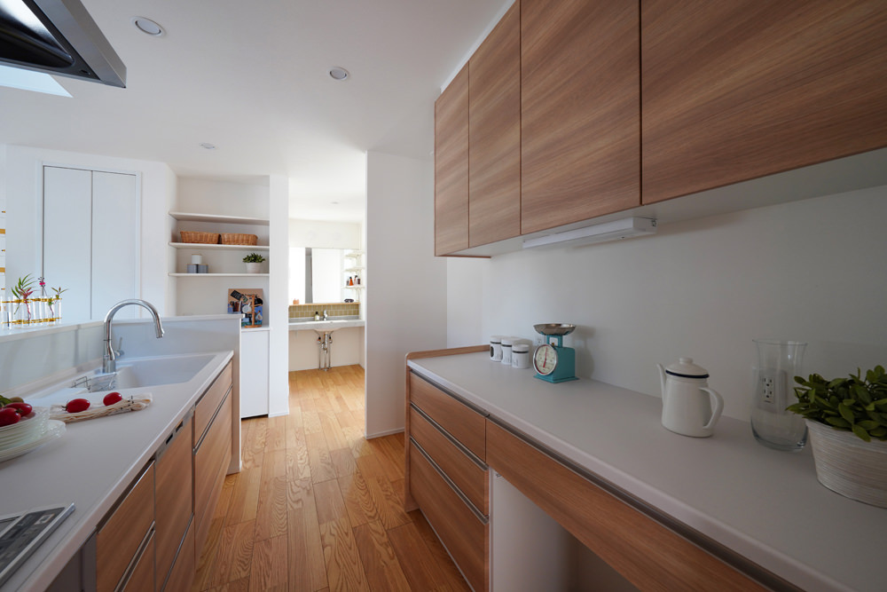 白基調の配色がシンプル好きを誘う爽かな外観。玄関からキッチンへ直接繋がる家事ラク動線と1F/2Fの大容量収納が嬉しいポイント。リビングから掃出し窓越しに繋がる大きいウッドデッキと広めの庭がアウトドア派の家族にピッタリです。ライフスタイルに応じて変化するスマートな機能性が多いところも見所ポイントです。