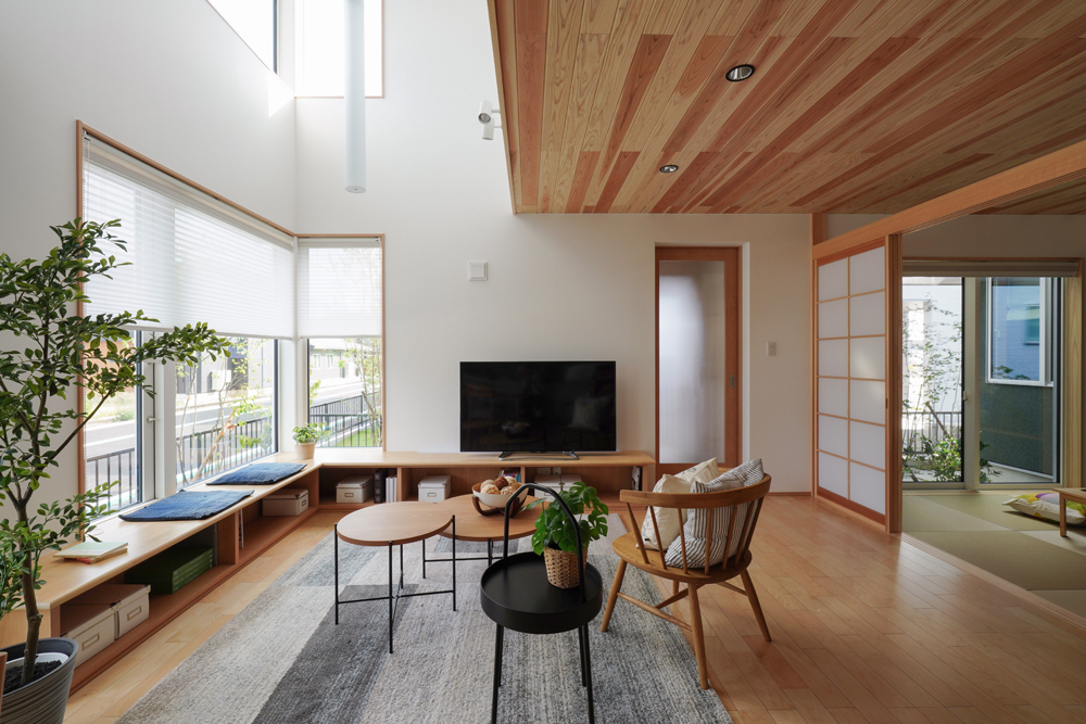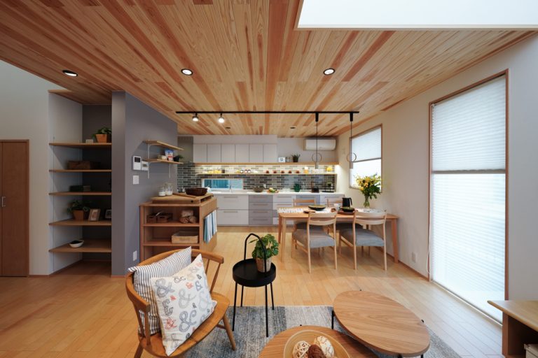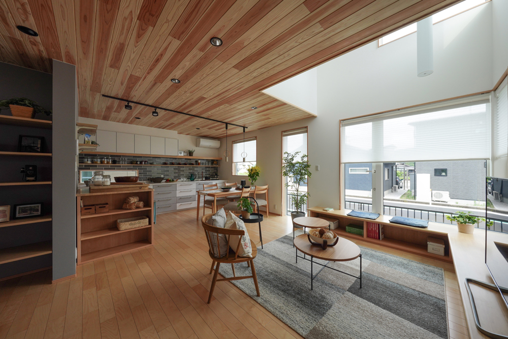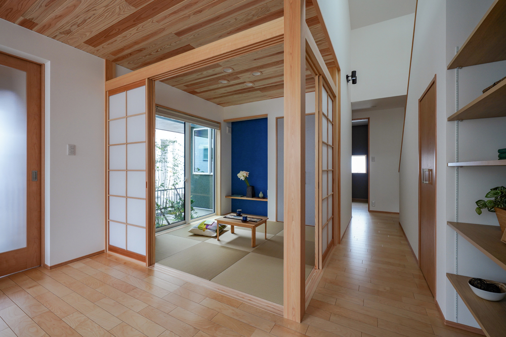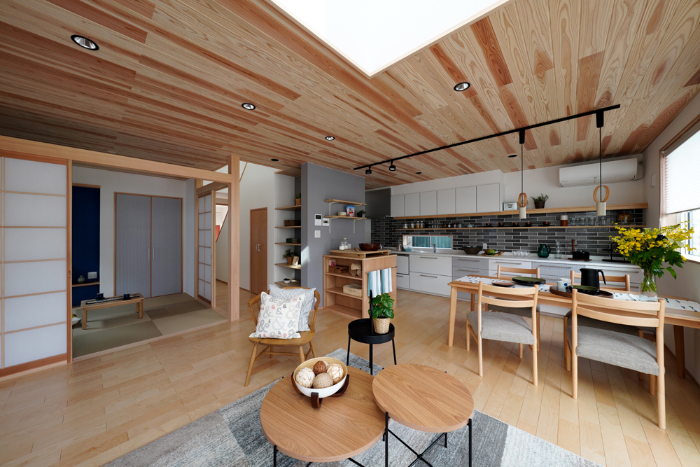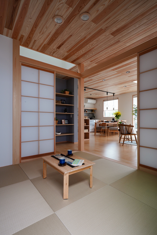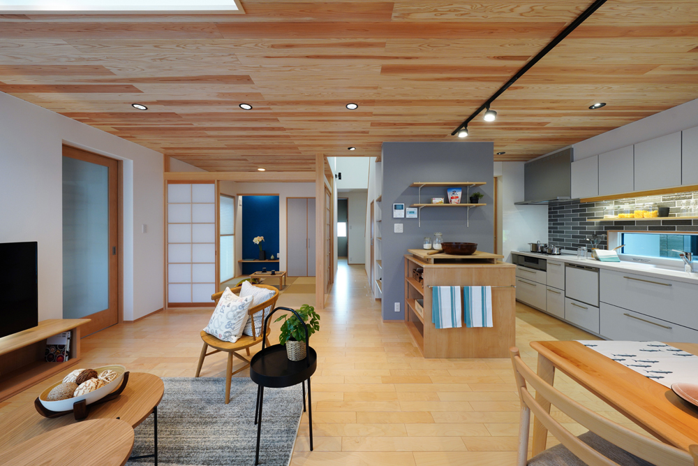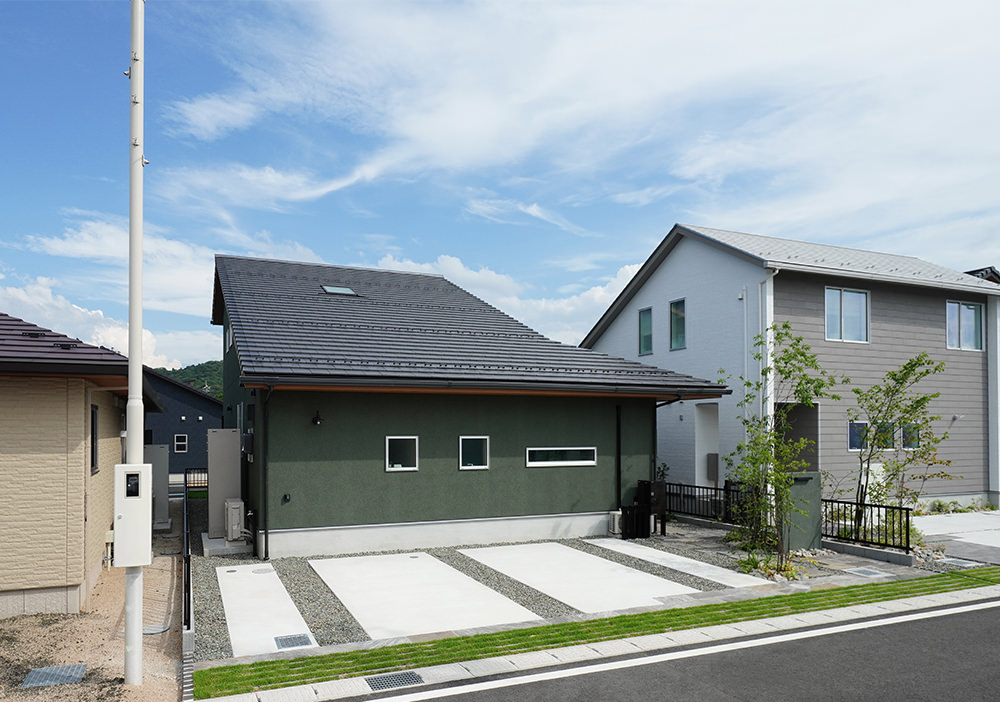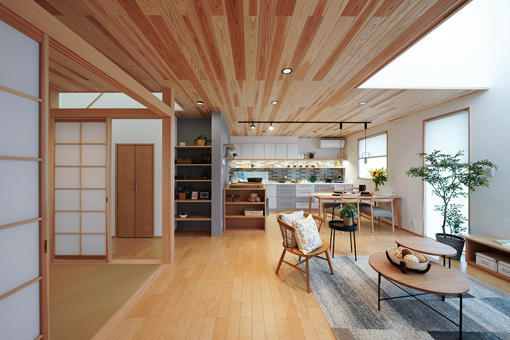 平板瓦屋根+ダークトーン外壁+木目色の組合せが和テイストを感じさせるとてもお洒落な外観。吹抜けがある開放的なLDKに隣接する和室の造作建具が暮らしに和モダンのアクセントをもたらせてくれます。1F水廻りの側に主寝室があるのがポイント。今も未来もずっと暮らしやすい平屋のような動線と間取りが特徴の家です。