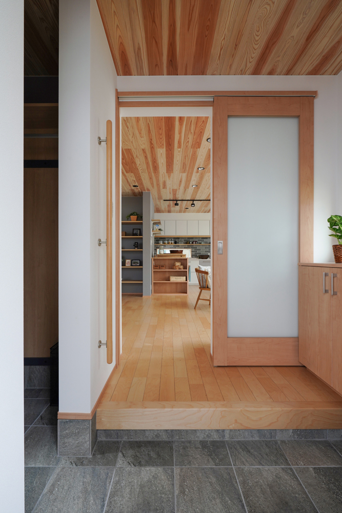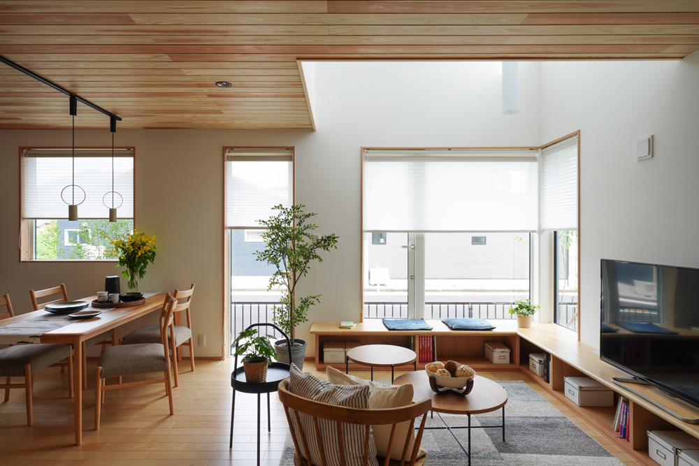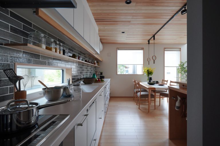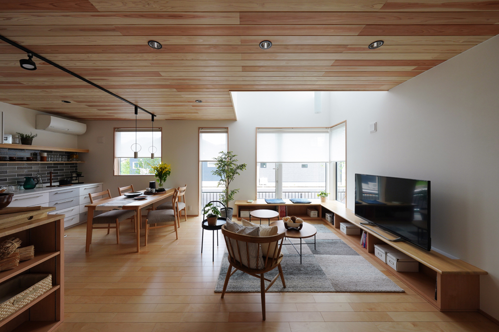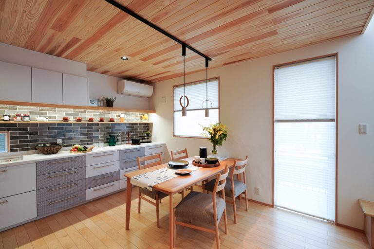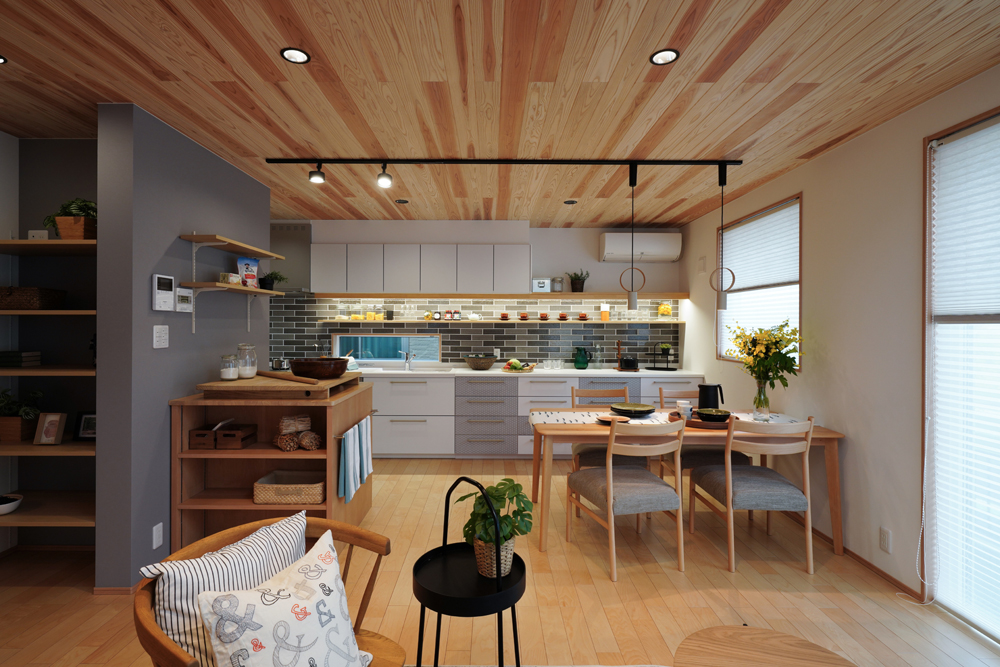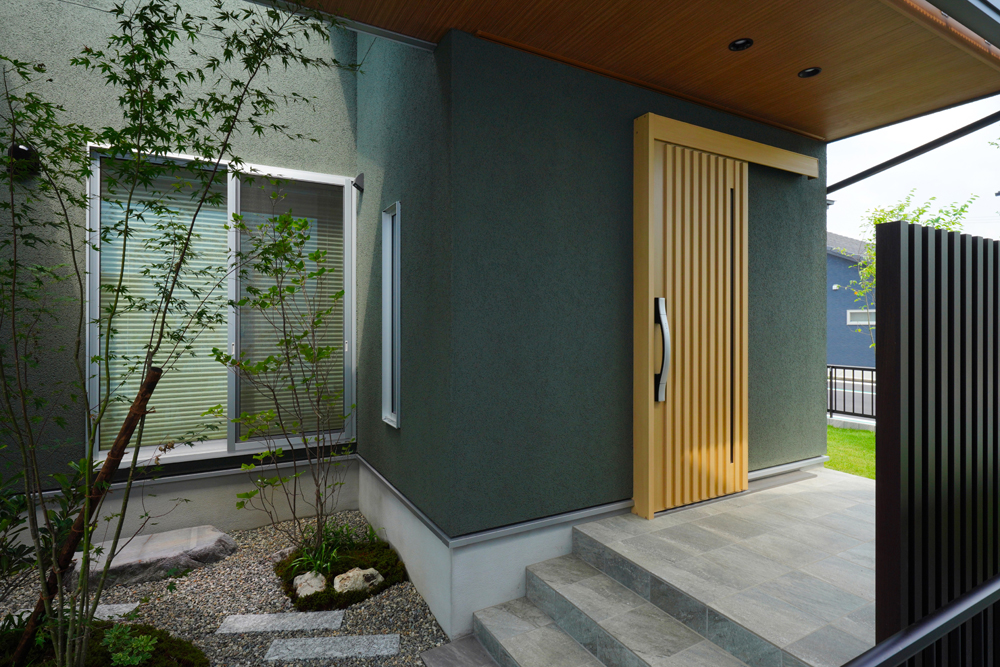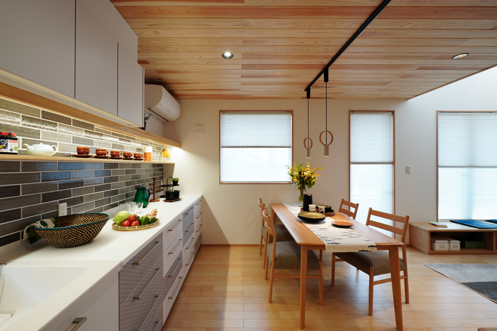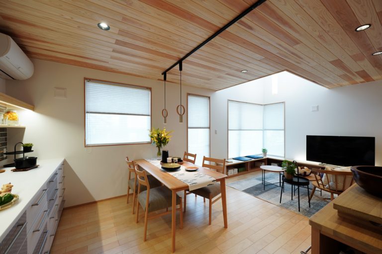 平板瓦屋根+ダークトーン外壁+木目色の組合せが和テイストを感じさせるとてもお洒落な外観。吹抜けがある開放的なLDKに隣接する和室の造作建具が暮らしに和モダンのアクセントをもたらせてくれます。1F水廻りの側に主寝室があるのがポイント。今も未来もずっと暮らしやすい平屋のような動線と間取りが特徴の家です。