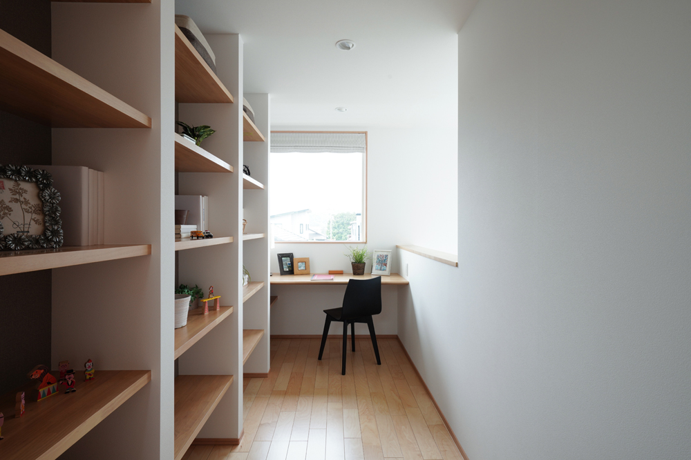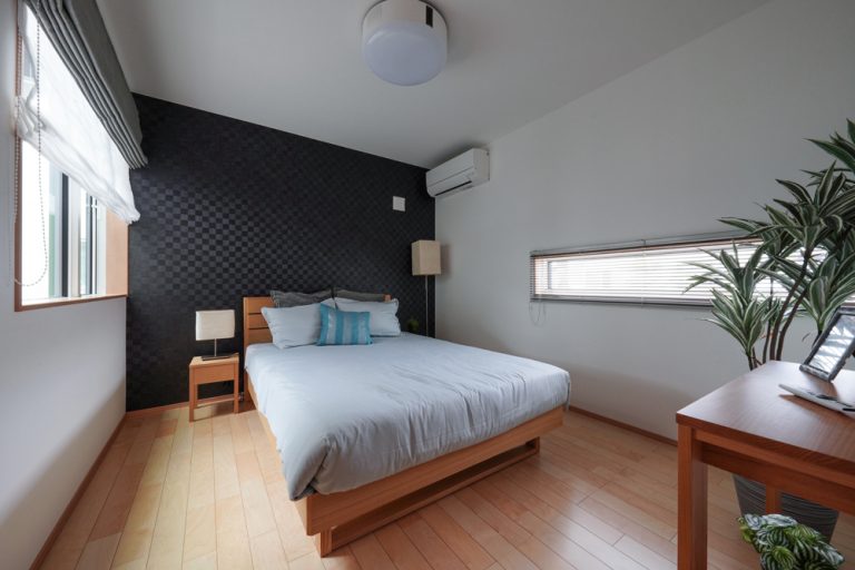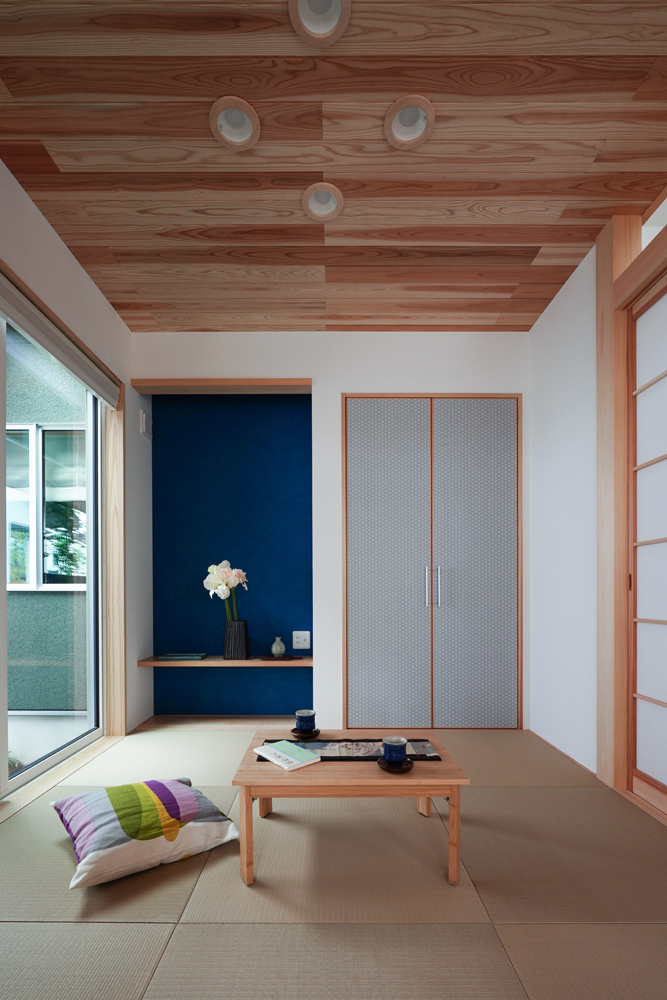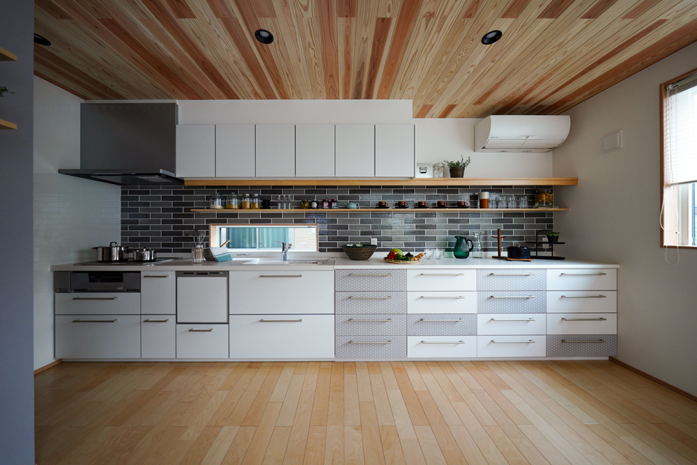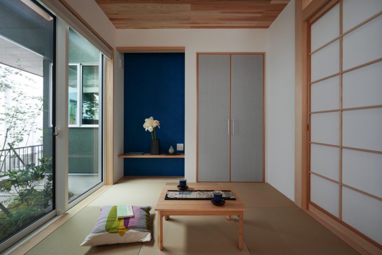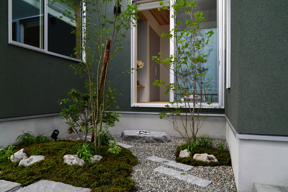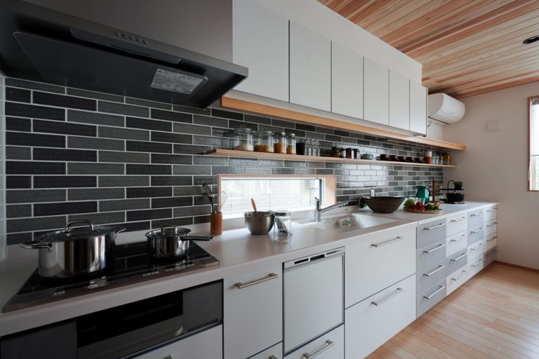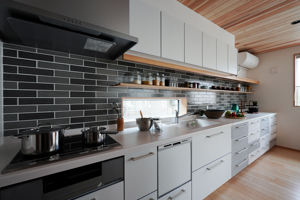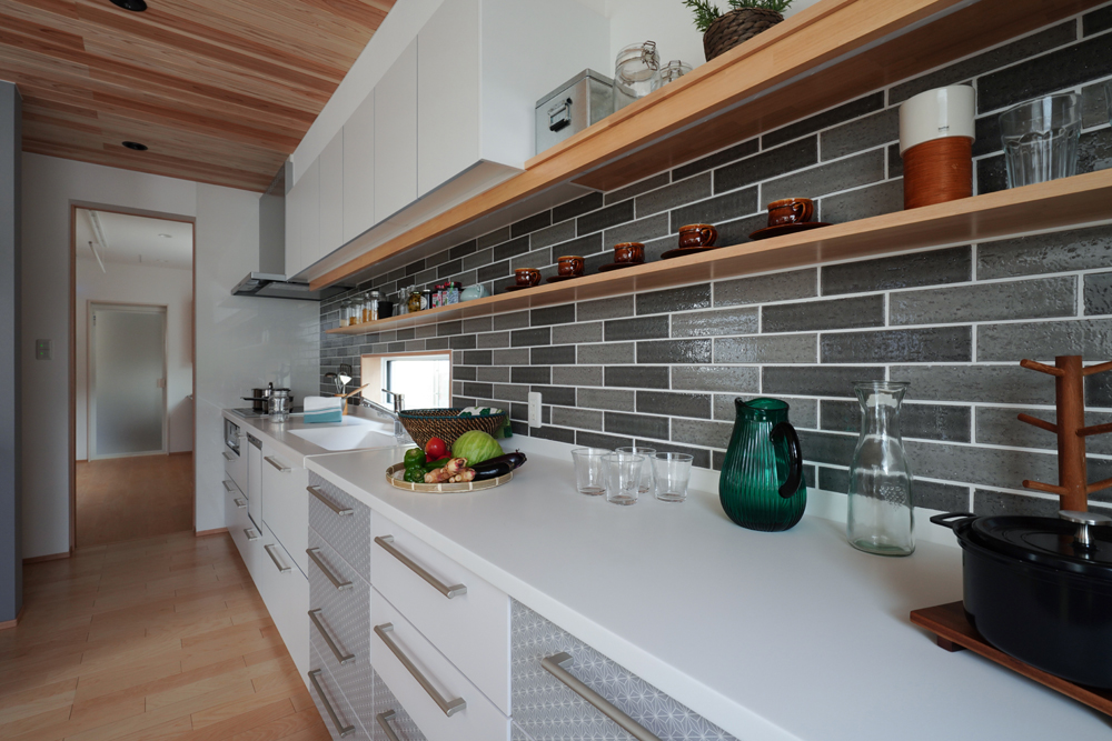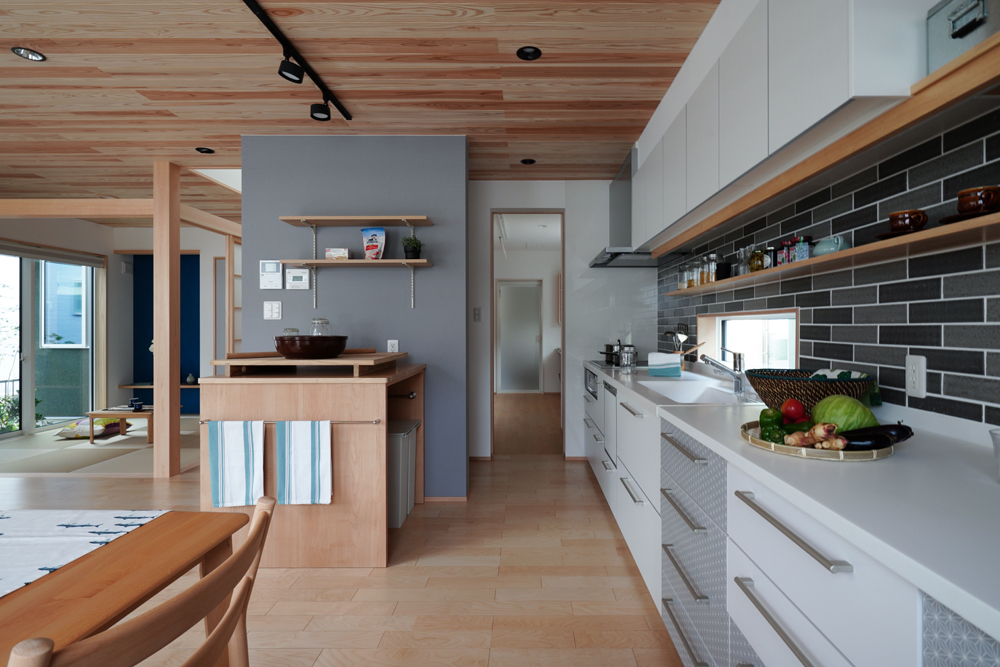 平板瓦屋根+ダークトーン外壁+木目色の組合せが和テイストを感じさせるとてもお洒落な外観。吹抜けがある開放的なLDKに隣接する和室の造作建具が暮らしに和モダンのアクセントをもたらせてくれます。1F水廻りの側に主寝室があるのがポイント。今も未来もずっと暮らしやすい平屋のような動線と間取りが特徴の家です。