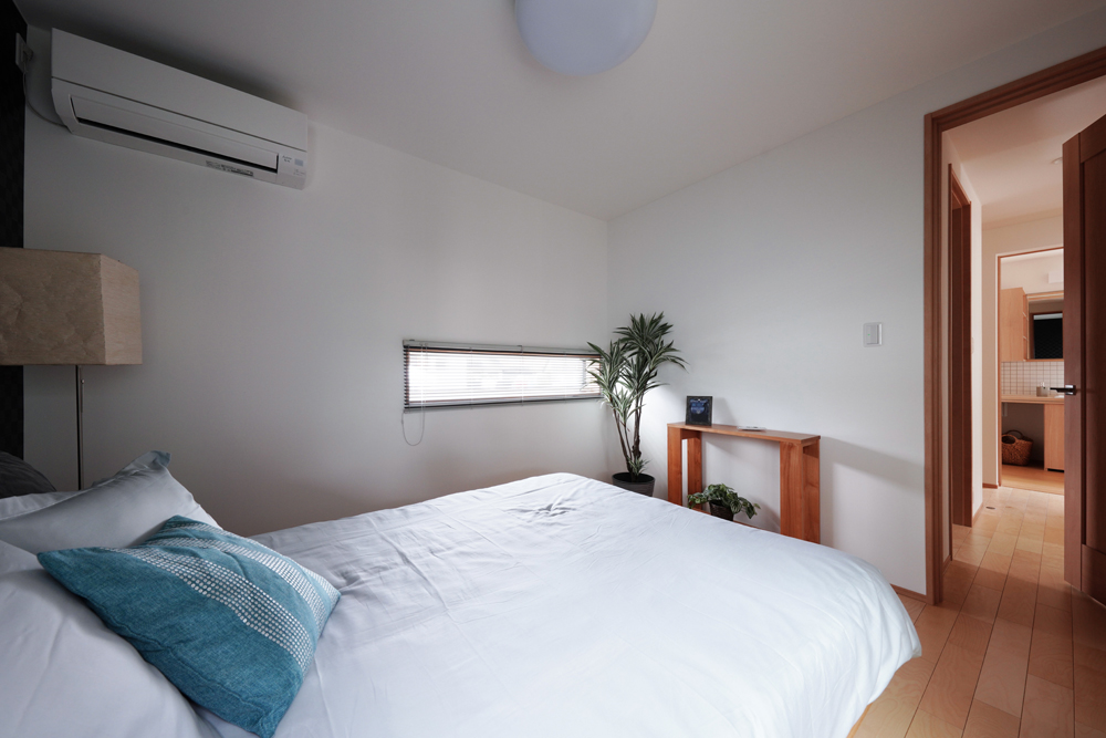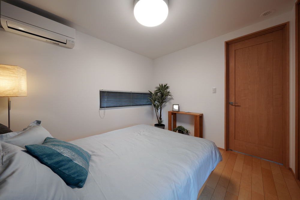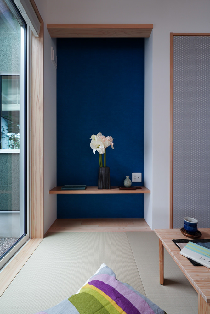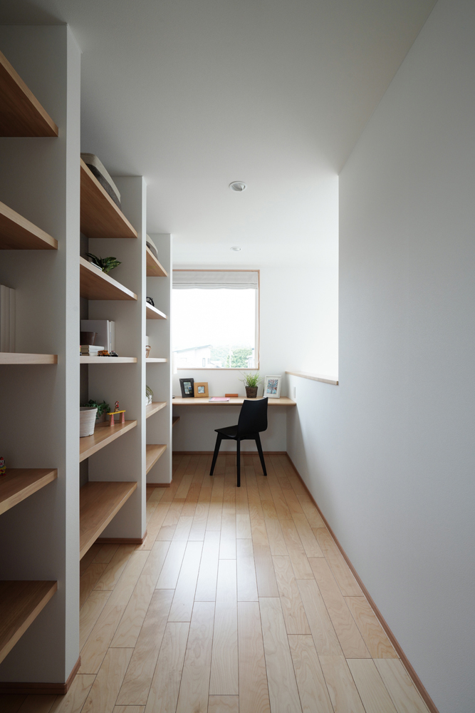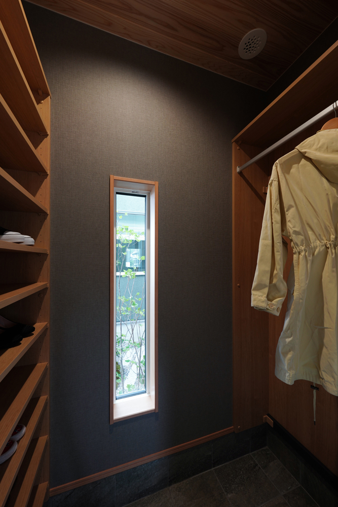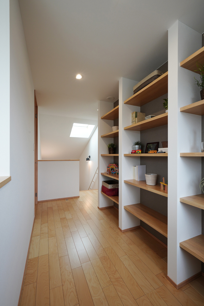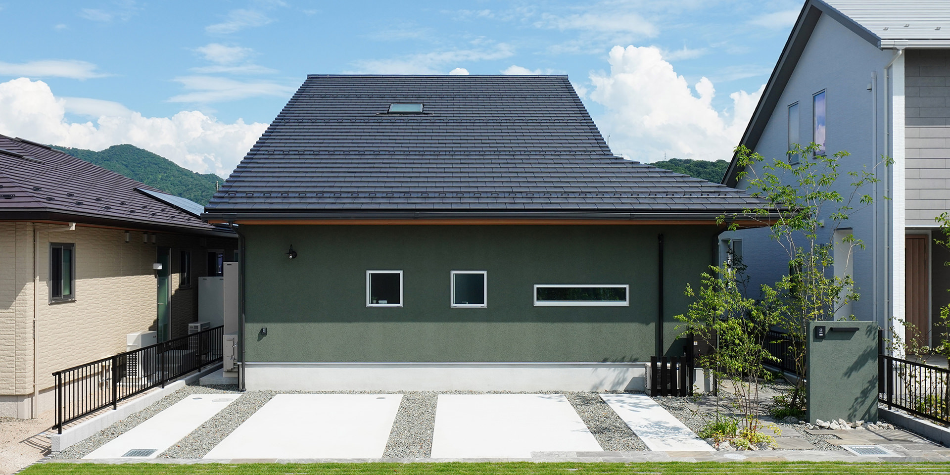 平板瓦屋根+ダークトーン外壁+木目色の組合せが和テイストを感じさせるとてもお洒落な外観。吹抜けがある開放的なLDKに隣接する和室の造作建具が暮らしに和モダンのアクセントをもたらせてくれます。1F水廻りの側に主寝室があるのがポイント。今も未来もずっと暮らしやすい平屋のような動線と間取りが特徴の家です。