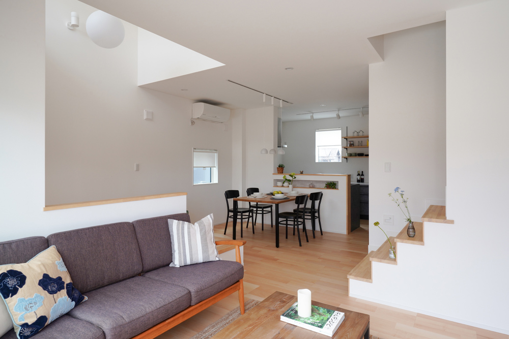 室内は白を基調としており、清潔感と明るさが広がります。玄関のシューズクローゼットから洗面脱衣に繋がる動線は、お子様のおられるご家庭には嬉しいポイントです。吹き抜けの空間は開放的で、豊かな自然光が差し込みます。