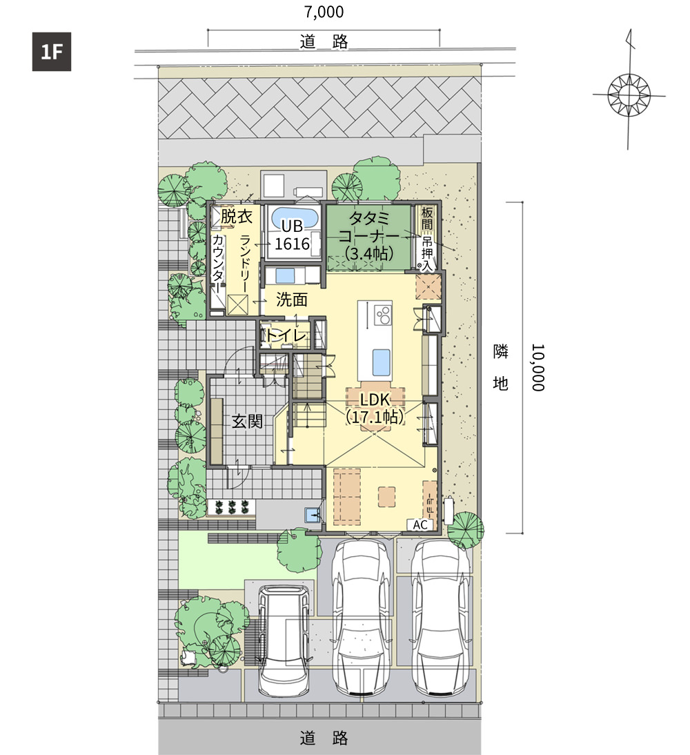 車が3台停めれるスペースがあり、家の周りには植栽がたくさんあるので自然を身近に感じられます。
