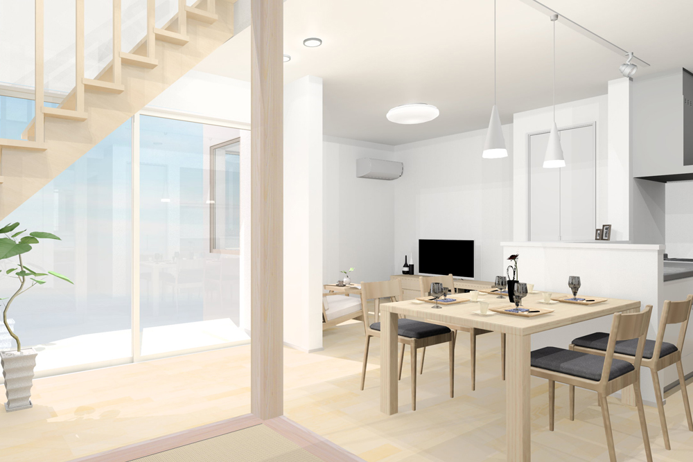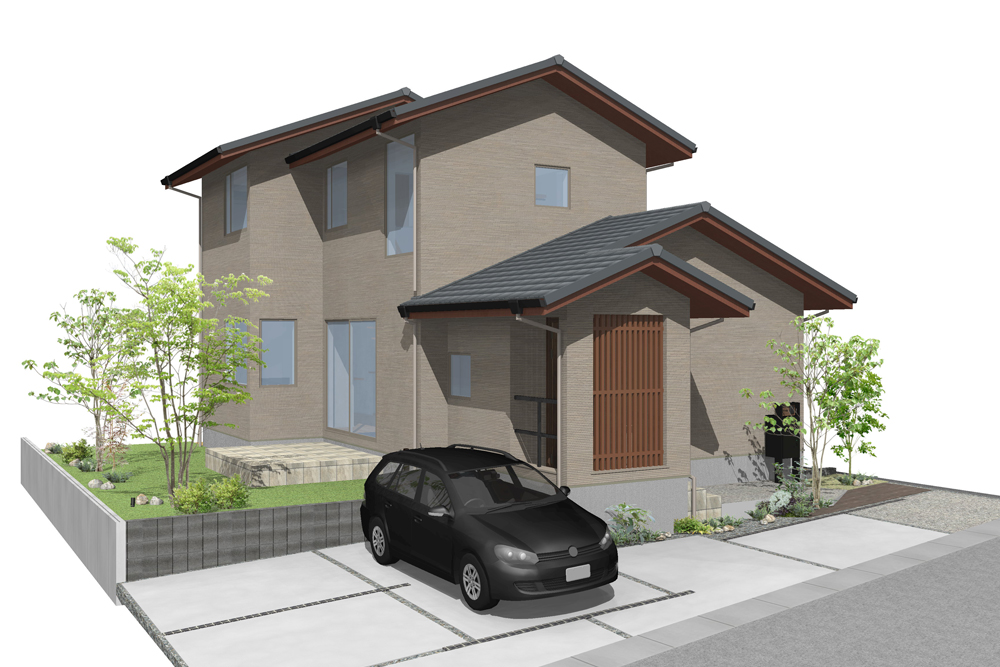 閑静なグリーンテラスを見渡す高台に、和のテイストをまとったモダンな住まいが誕生しました。植栽のアプローチを通り抜け軽やかにステップを上がると木目格子から柔らかな日差しがふっと差し込みます。1Fは茶室をイメージした和室を中心にレイアウトし、LDKと一体化することで家族の”一緒”を感じさせてくれるくつろぎの大空間が実現しました。和室の南に面した大開口の窓や吹き抜け、さらに階段にスケルトンタイプを採用することで季節の光と影を五感で感じられます。伝統的な和風とゆったりとした回遊動線、タイルテラスや北欧テイストなどを融合したハイクオリティなひらぎの流”新しい日本の伝統”を提案します。