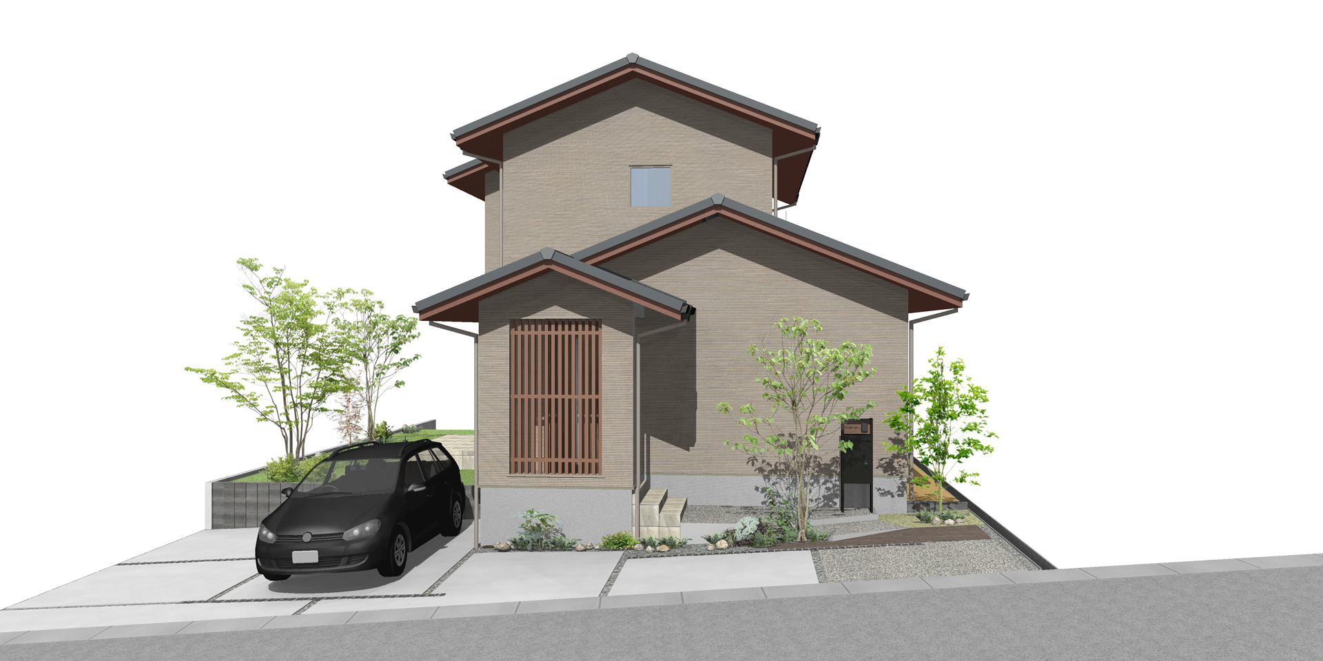 閑静なグリーンテラスを見渡す高台に、和のテイストをまとったモダンな住まいが誕生しました。植栽のアプローチを通り抜け軽やかにステップを上がると木目格子から柔らかな日差しがふっと差し込みます。1Fは茶室をイメージした和室を中心にレイアウトし、LDKと一体化することで家族の”一緒”を感じさせてくれるくつろぎの大空間が実現しました。和室の南に面した大開口の窓や吹き抜け、さらに階段にスケルトンタイプを採用することで季節の光と影を五感で感じられます。伝統的な和風とゆったりとした回遊動線、タイルテラスや北欧テイストなどを融合したハイクオリティなひらぎの流”新しい日本の伝統”を提案します。