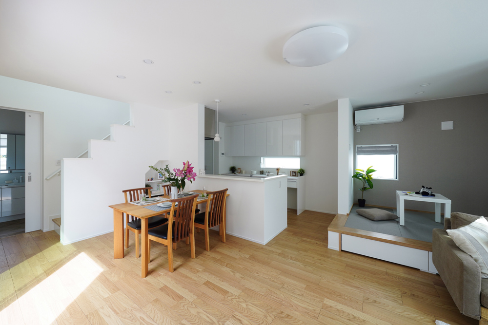 シンプルな白壁の住宅は、玄関のおかげで外から見えにくいタイルテラスを完備。BBQもできるプライベート空間を演出してくれます。室内はナチュラルホワイトで統一され、リビングやダイニングに大きい窓や吹抜けを配置しているので明るく開放的。水廻りを家の奥に集結させ、ランドリーを広く取ったので、廊下やホールに洗濯物が来ることが無く、日々の生活空間を快適に維持する事ができます。タタミコーナーが小上がりで建具のないスペースになっているので、ちょっと横になりながらテレビを見れるのもお勧めポイント。