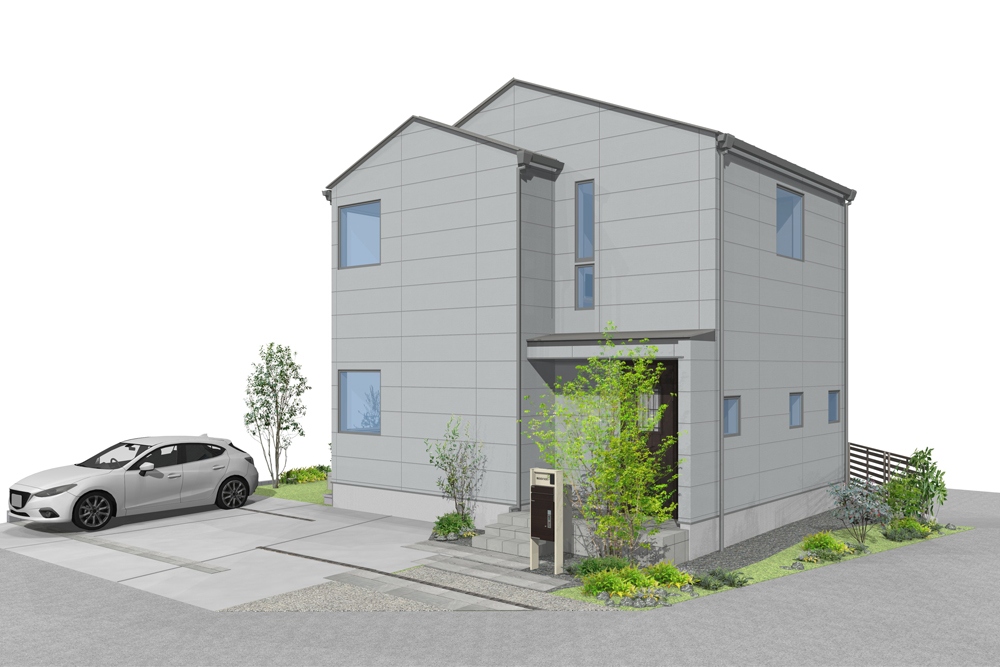 玄関ポーチの緑が映えるライトグレーを使用したお家です。