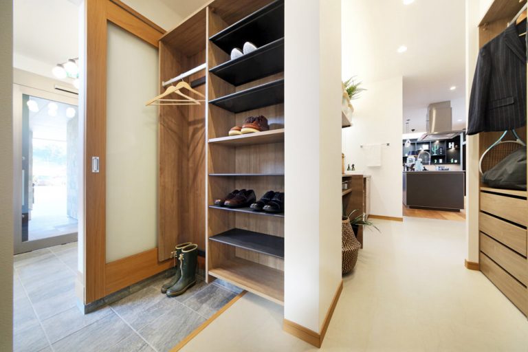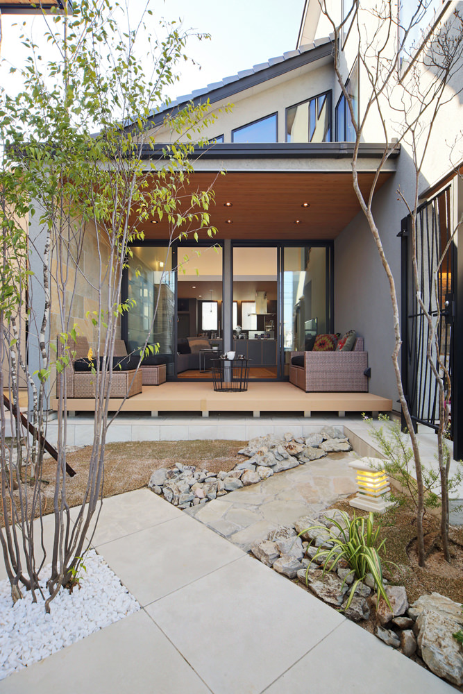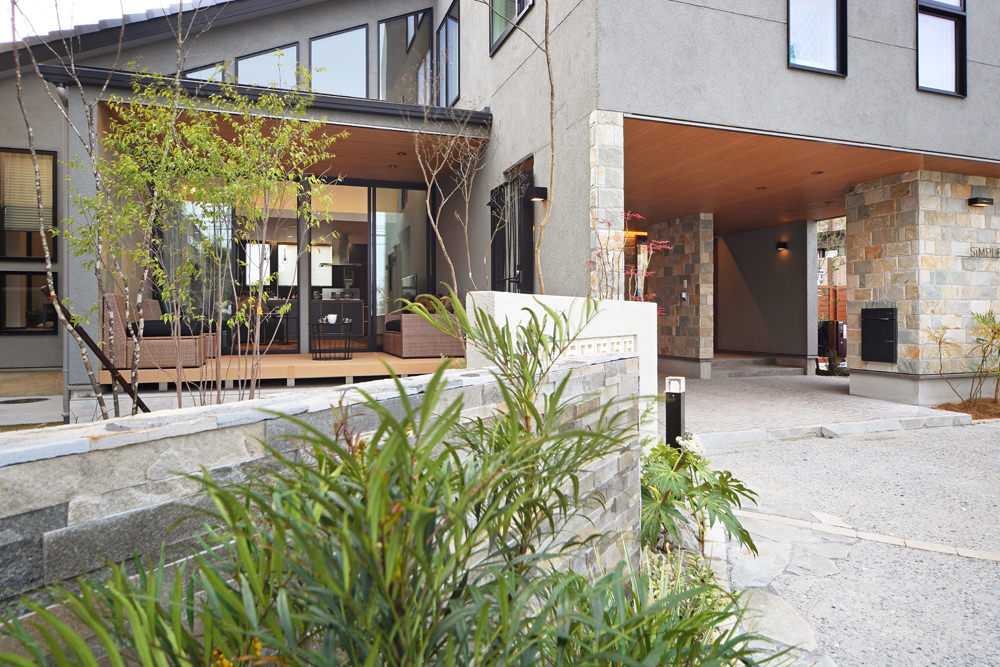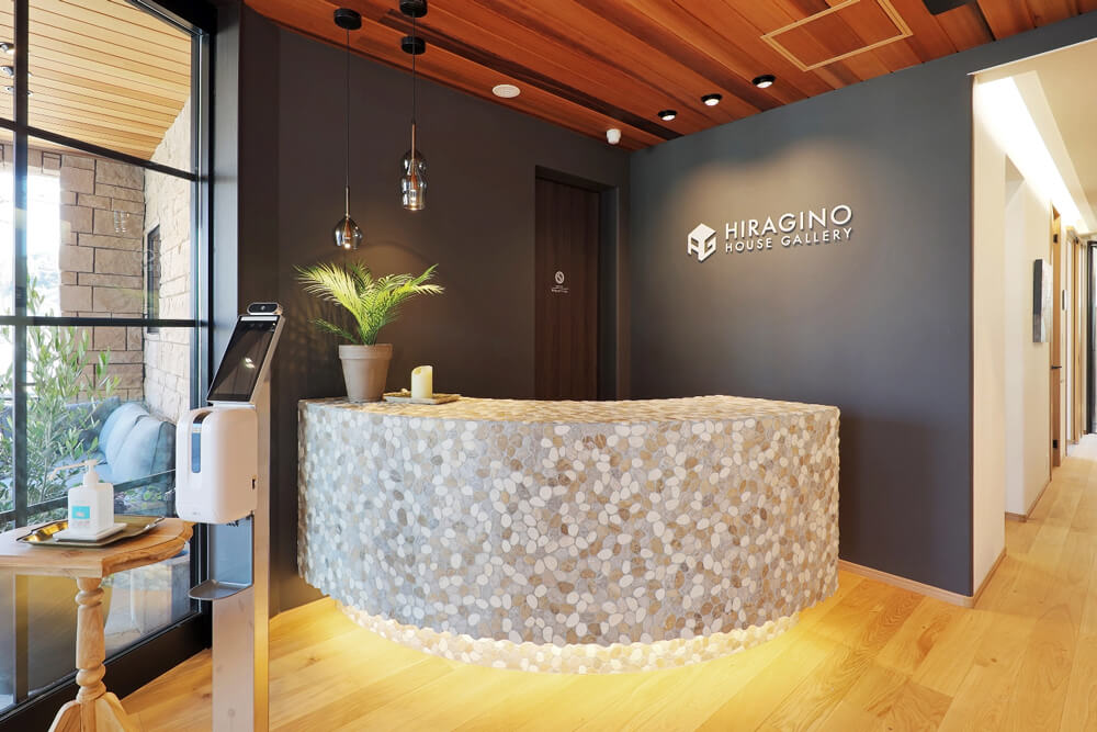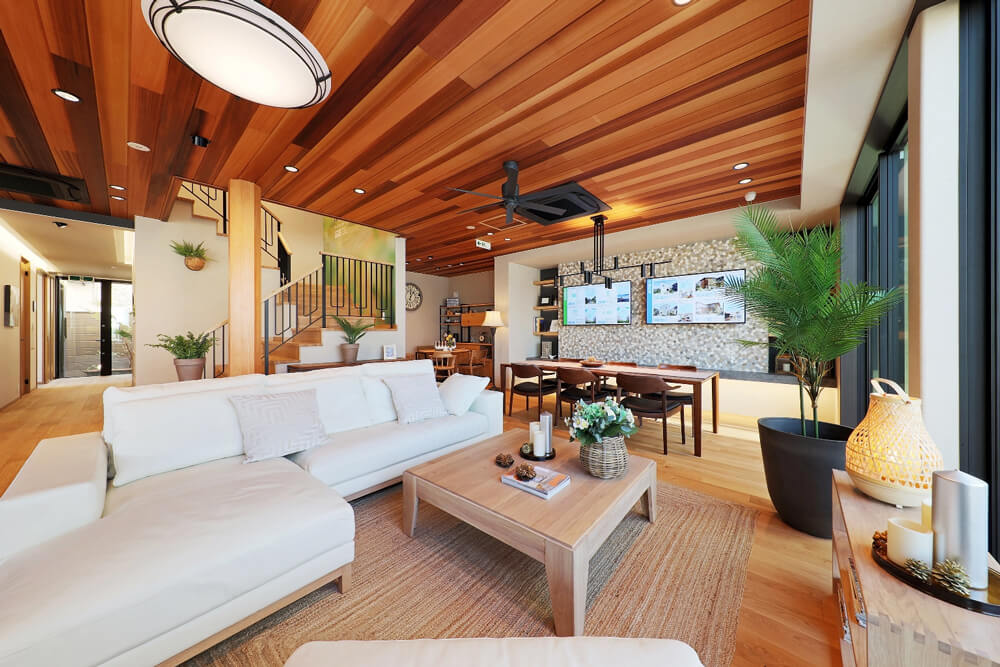 アジアンリゾートをイメージした玄関回りからお出迎え。無垢板と擬石をあしらった外観デザインの松江ハウスギャラリーは、各コーナーに多彩な種類の外観パーツや床材・建具などリアルなサンプルを多数展示。実際に部材の機能や触り心地を体感できます。