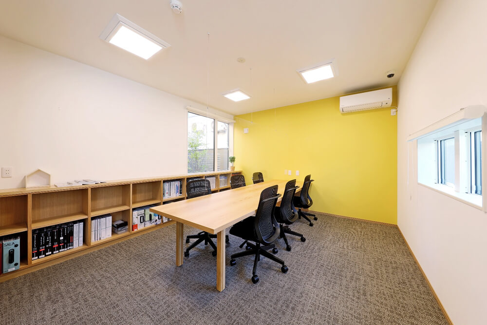 - ゲストルームには、約3mの長いテーブルを設置して、ゆったり図面やカタログ、素材サンプルなどを広げながら打ち合わせができます。
