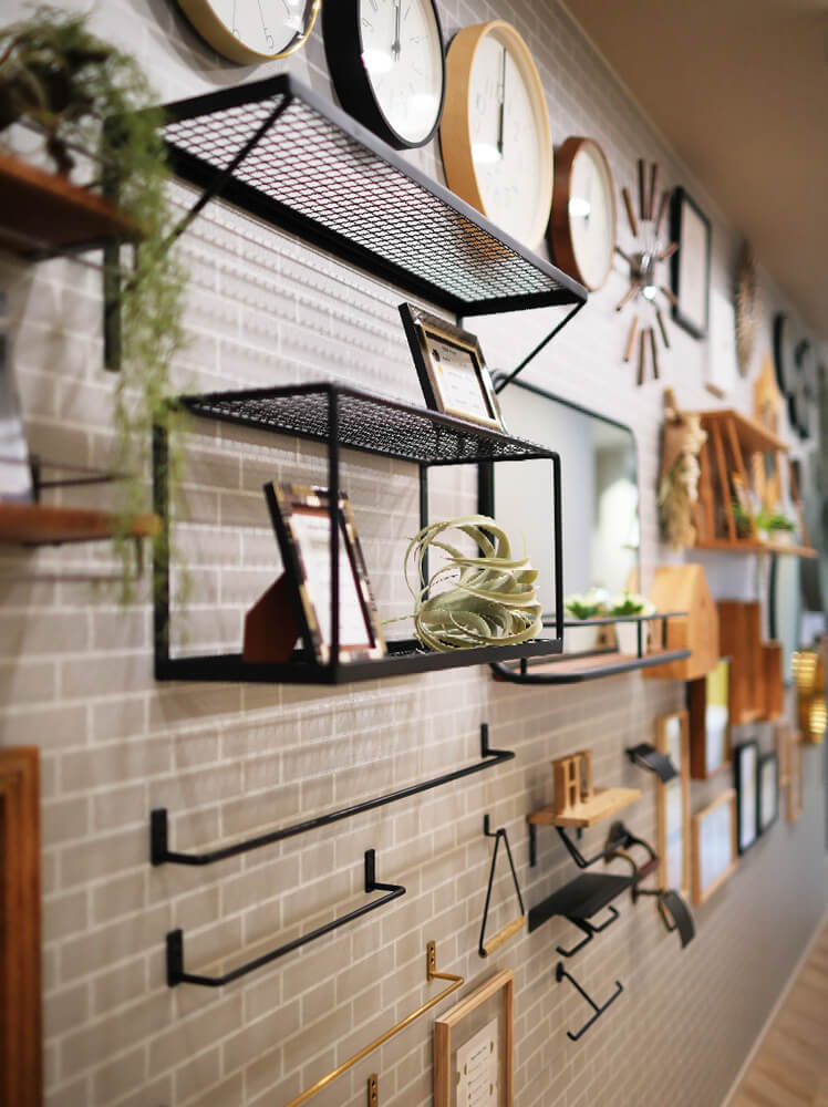 - 家族と過ごす大切な時間は、時を刻む時計もお洒落なインテリアとして使いたいもの。小物など置く棚などインテリア関連も展示していますので現物サンプルとしてご参考に。