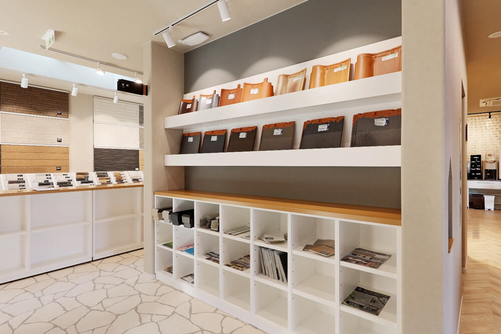 - 住まいの〝顔〟を決める屋根。標準の瓦や軒天の素材など、屋根関係のものが一堂に。様々な色・形状が揃い、写真では感じられない違いが分かります。