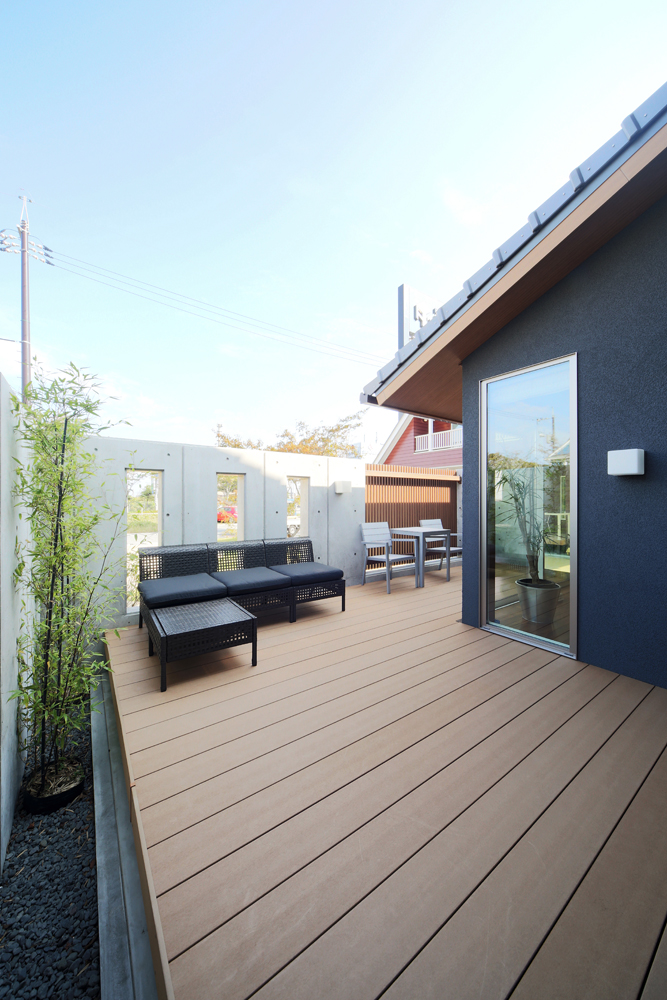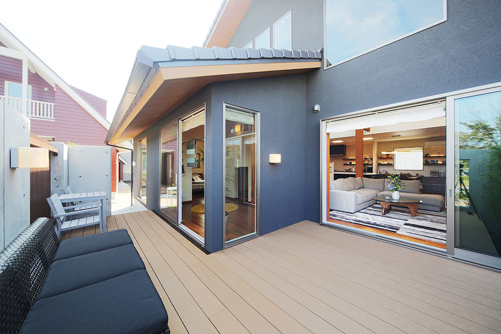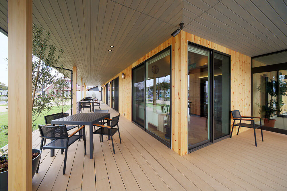 - 幅広く長いウッドデッキが設置され、気持ちいい季節にはカフェテラスで素敵な時間を過ごせるような日常を体験できます。お子様と芝生で遊べるのも魅力的ですね。