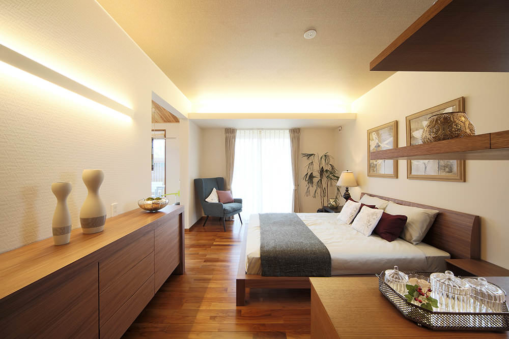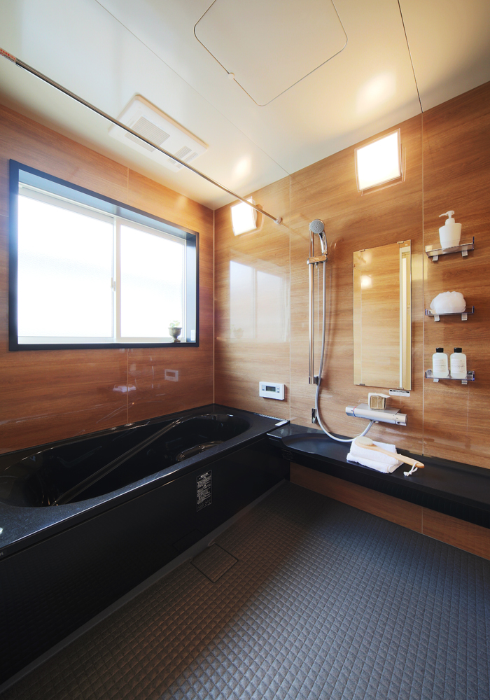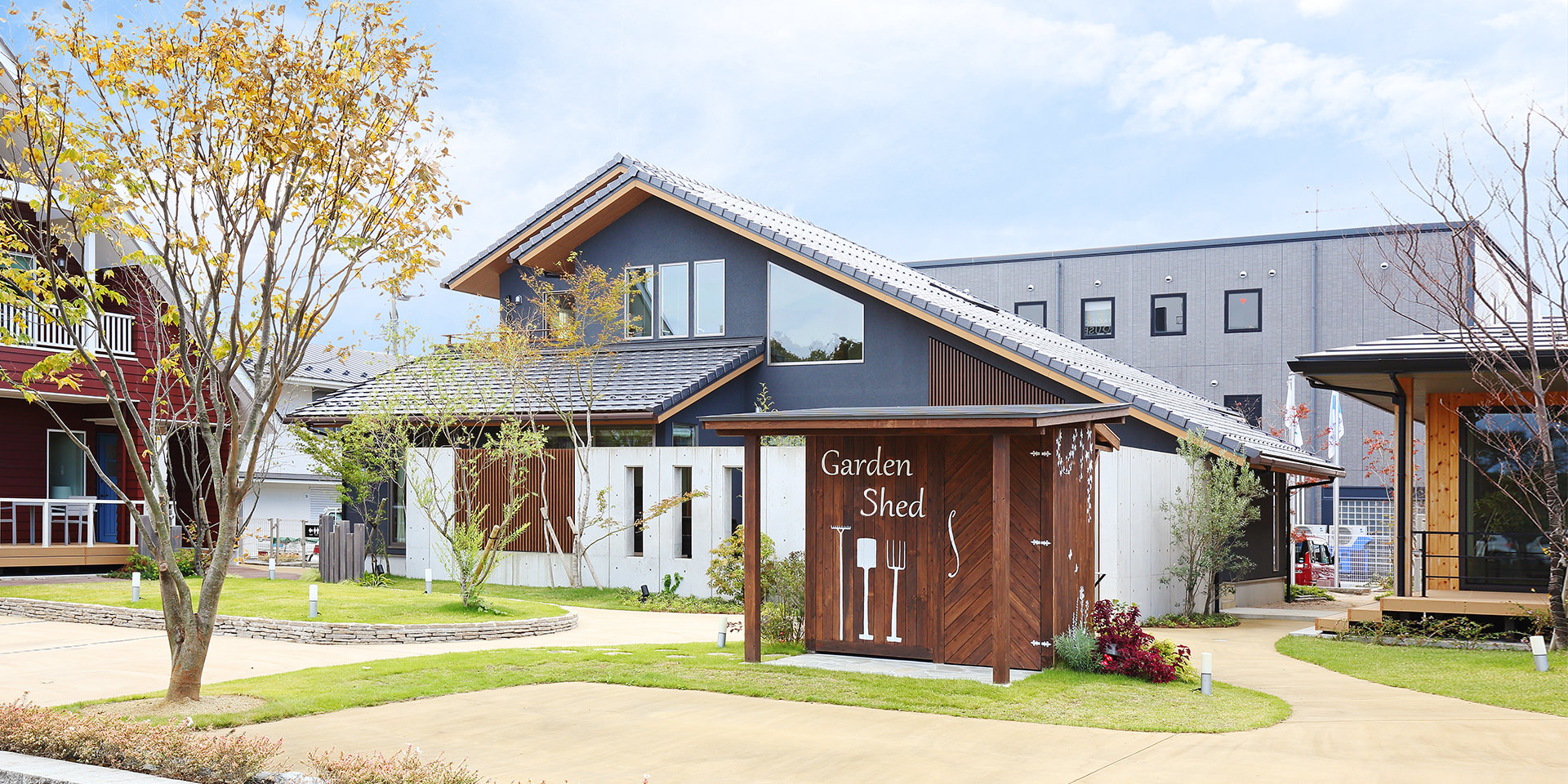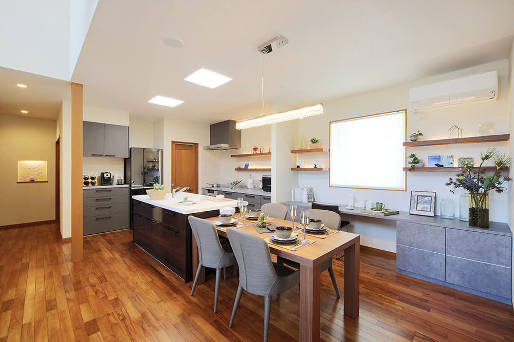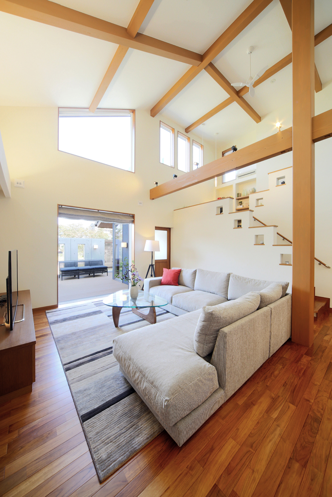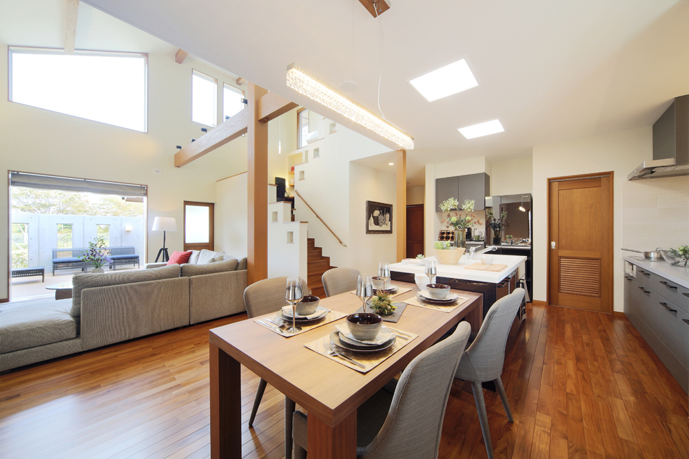 伸びやかな寄棟の屋根がバリ島に建つヴィラのような開放感で、家づくりというビッグイベントへと誘います。棟内には設備や部材など多彩なアイテムが充実。深い軒の下に設けたウッドテラスで寛いだ後、芝生の庭に降りて外観やエクステリアもゆったりとご覧ください。