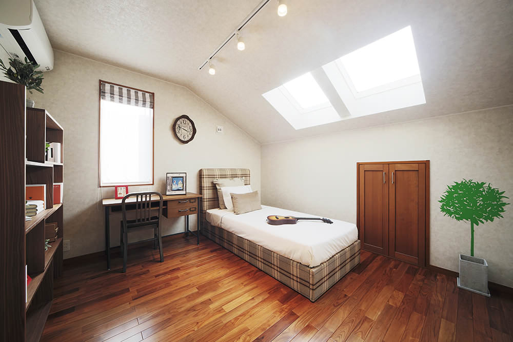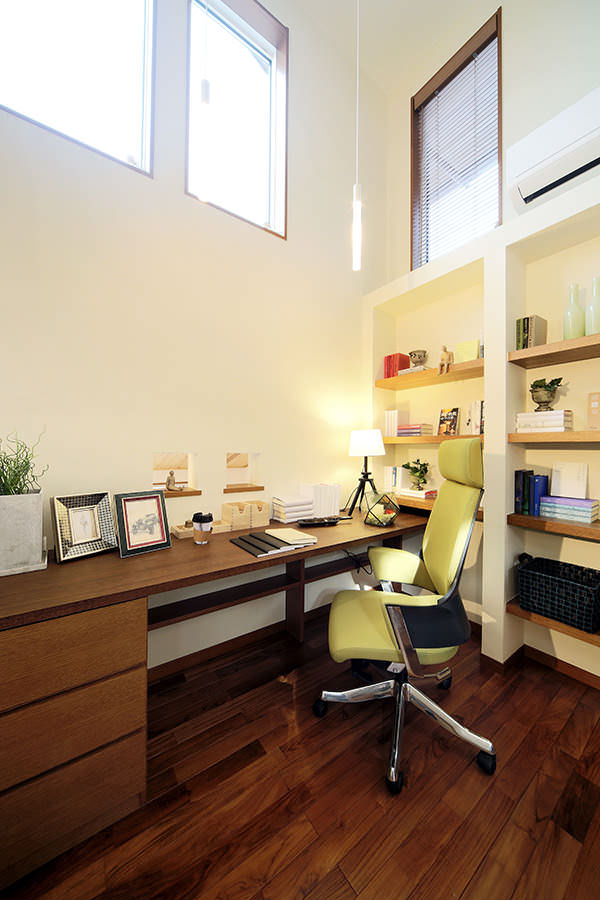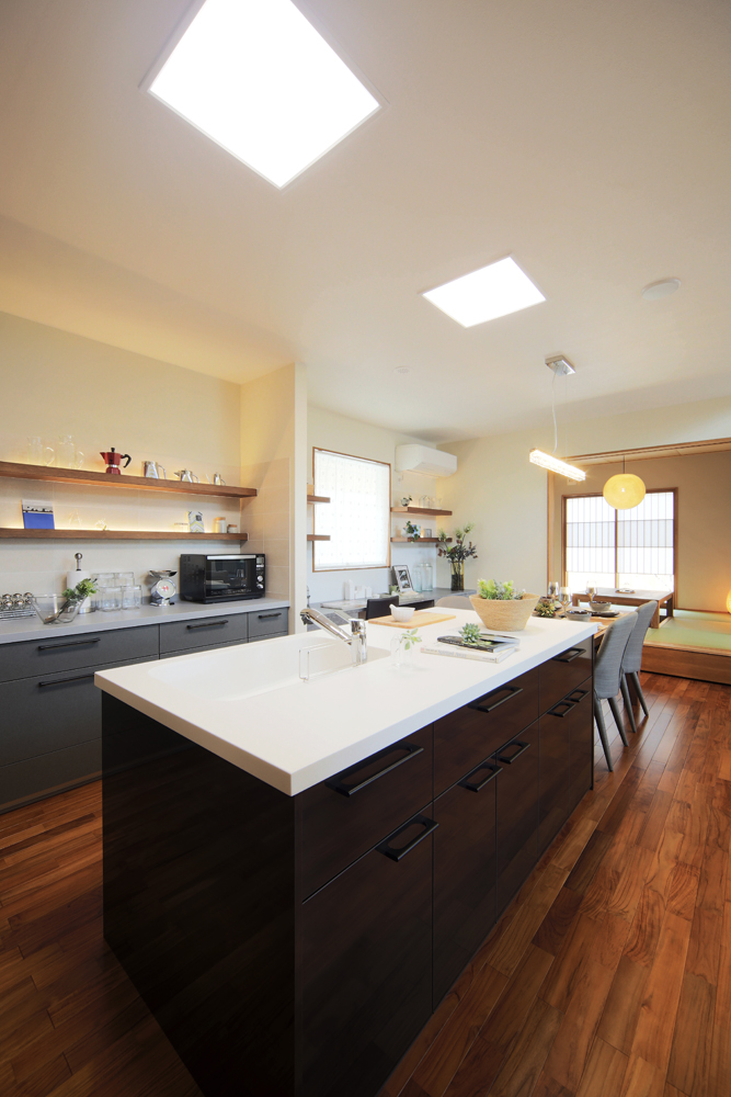 大きな勾配屋根の傾斜を活かした、吹き抜けのある大らかなリビングが、この家の中心。プライベートを尊重しながらも、家族の気配を感じながら安心して暮らせるよう、ダイニング、キッチン、和室を、各々リビングを取り囲むようにレイアウト。お母さんのためにサンルームを。お父さんのために中2階に書斎を。2Fにはホールや子ども部屋を配置。そして、主寝室には見せる収納ディスプレイシェルフを造り付け、ウォークインクローゼットやトランクルームなど、大容量の収納力も提案しています。こだわったのは家族全員の個室を確保しつつ、みんな一緒に居心地良く過ごせる快適な空間があること。家の中心部に設けた吹抜けから太陽の光がたっぷり降り注ぐ明るく開放的なモダン住宅です。