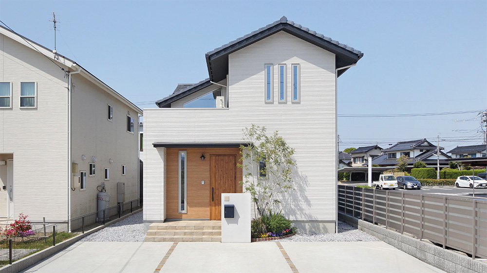 1 アシンメトリーな切妻屋根が印象的な外観。シンプルモダンな雰囲気に、木目調の玄関で温もりを加えました。
