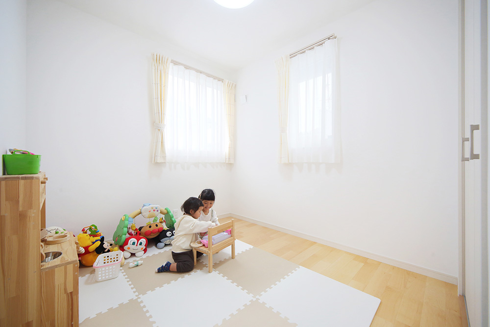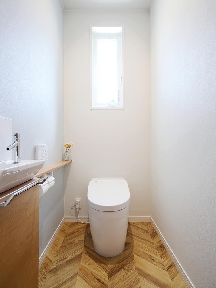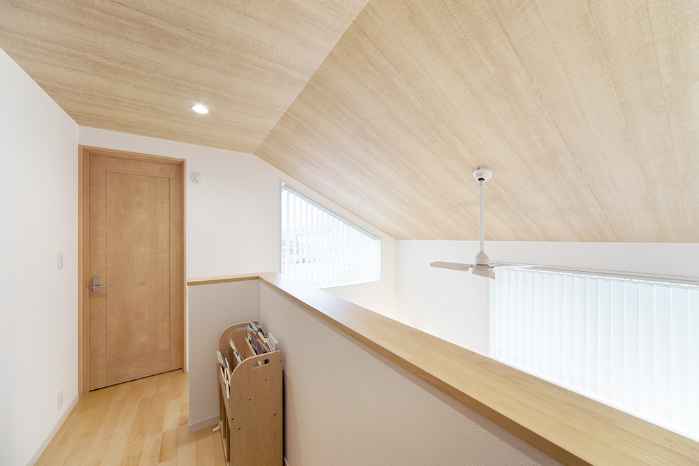 10 お客様が使うこともある1階のトイレは、内観同様白と木目調で統一したナチュラルテイストに。 11 天井には、木目調クロスを配して温もりを創出。勾配に沿った台形型の窓からの光が、2階ホールに降り注ぎます。 12 居心地が良すぎて閉じこまらないよう、子ども部屋はあえて狭めに。吹き抜けを通してつながりを感じられる設計です。