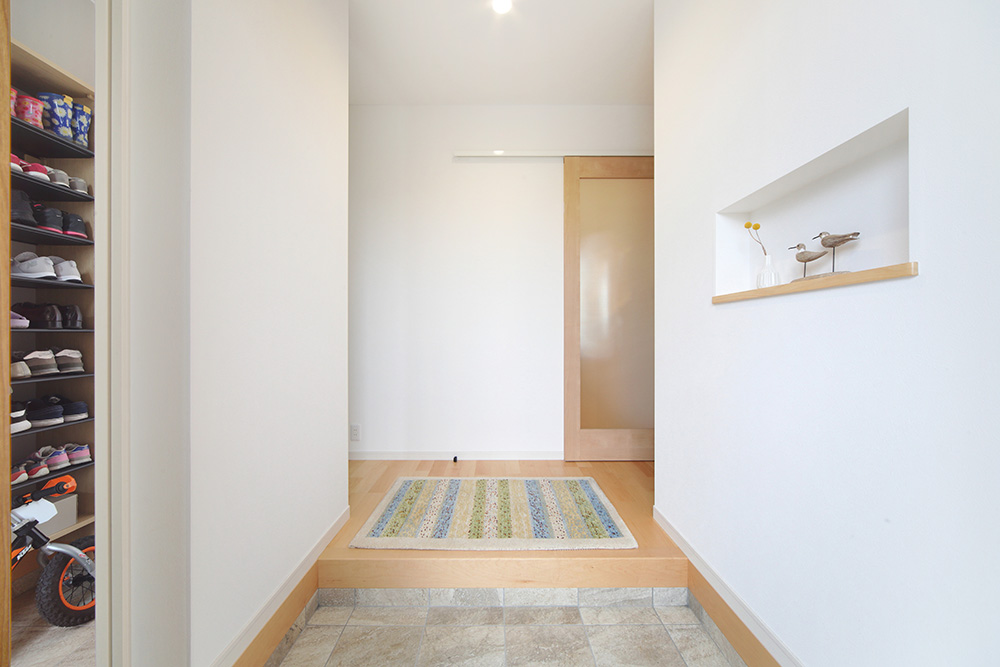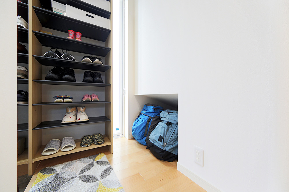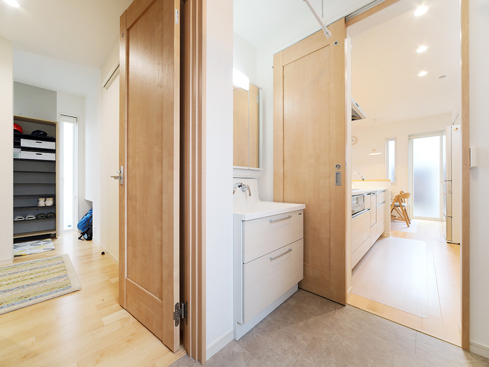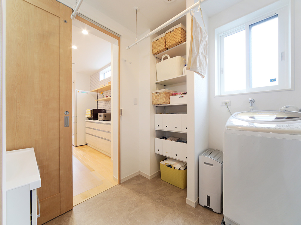 8 玄関ホールからは洗面脱衣室、キッチンに抜ける動線も確保。外遊びの後や、買い物帰りに重宝しそうです。 9 ランドリーの一角には、家族4人の普段着などを仕舞えるスペースを設置。家事時間が大幅に短縮しました。