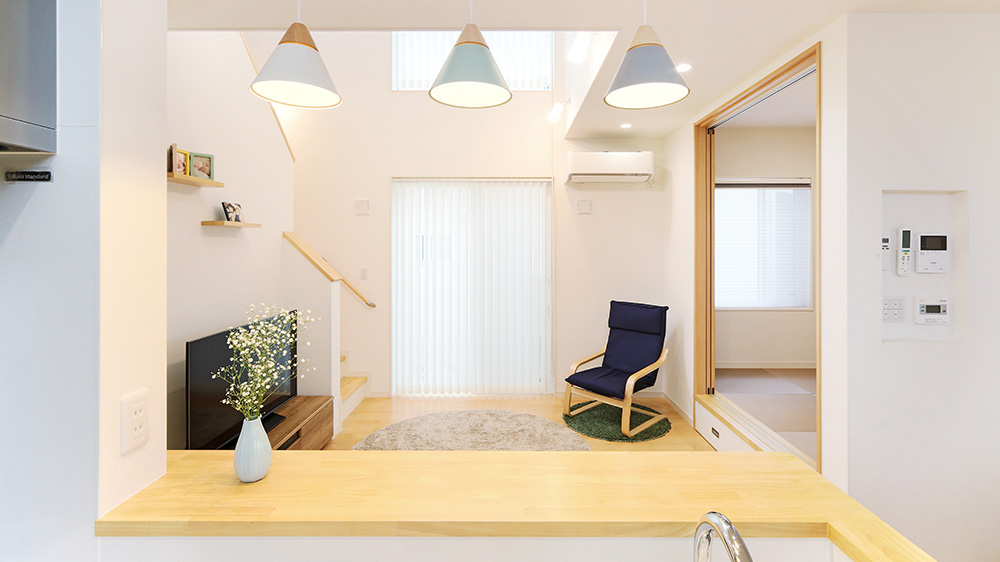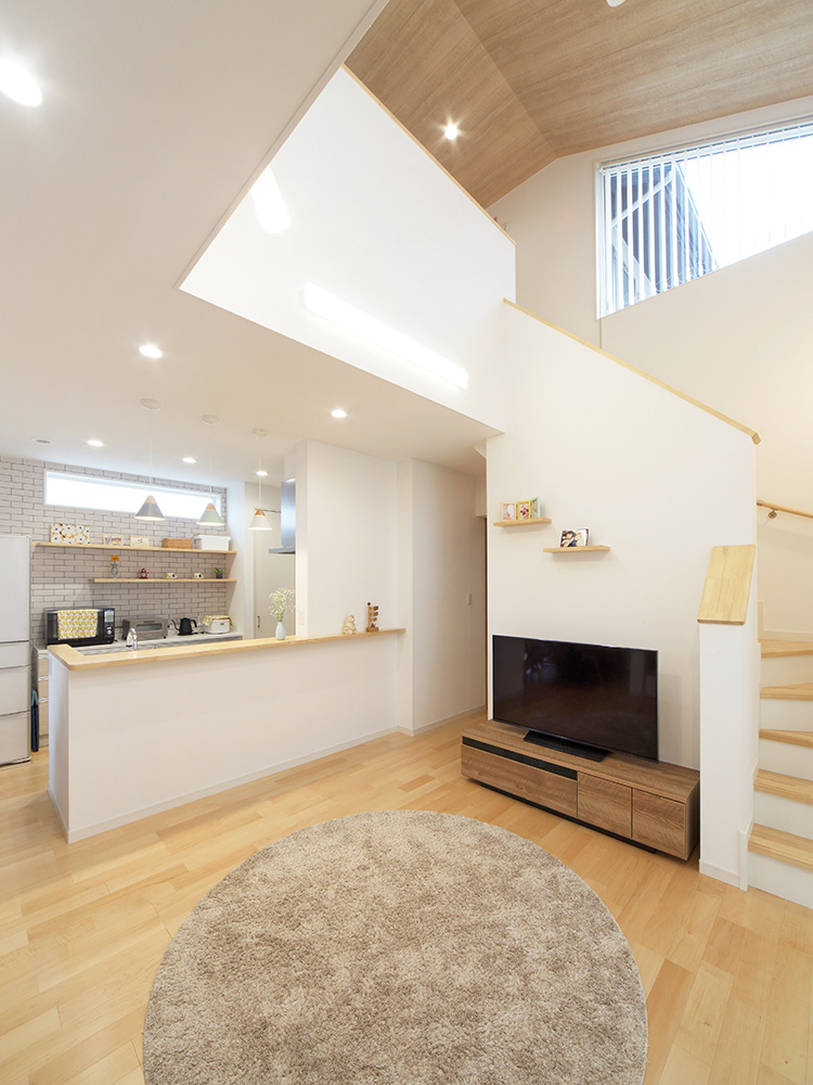 2 乱雑になりがちな玄関は、靴や外出グッズを仕舞えるSCLと引き戸で隔ててすっきりさせました。 3 階段下のデッドスペースを生かし、玄関わきには防災グッズなどを置ける便利な収納庫を設置。 4 大きな吹き抜けが創出する開放感抜群のリビング。自然の光を集めた明るいフロアに、家族も自然と集います。