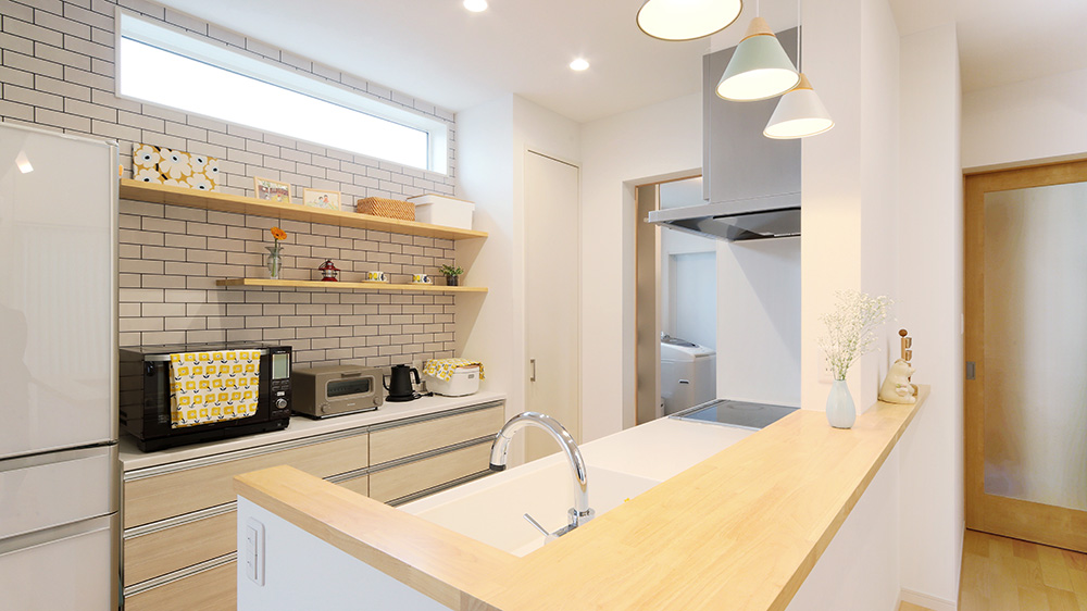 5 開放感と明るさを重視したキッチンは、タイル柄のアクセントクロスでカフェのようなおしゃれな雰囲気に。