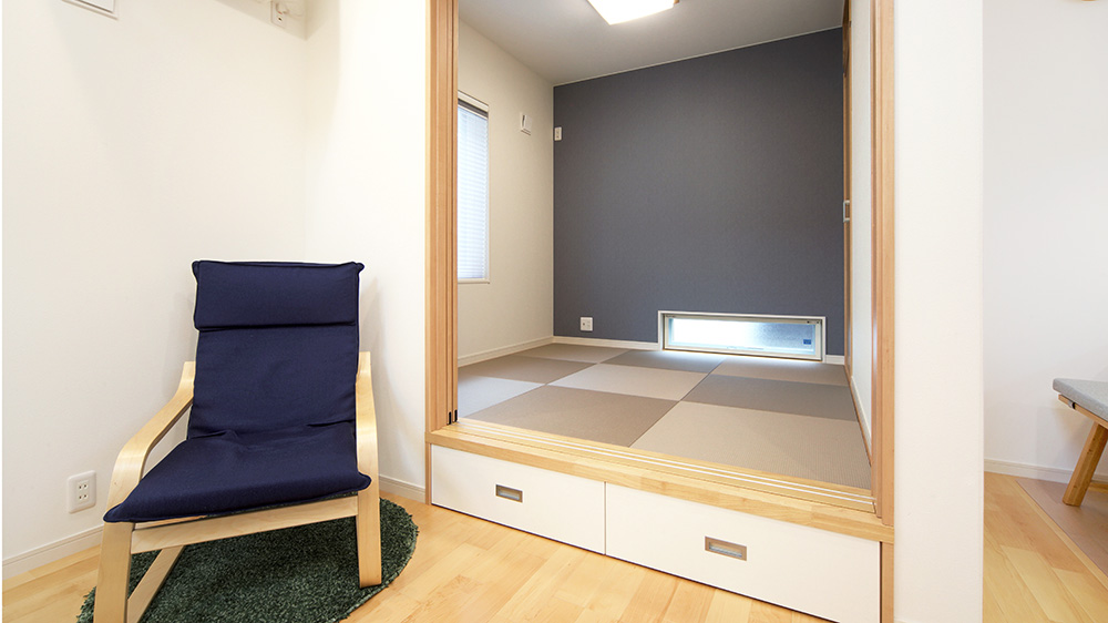 7 地窓からの優しい光が差し込む和室は小上がりにして、収納スペースを確保。ソファがわりに腰掛けられるのも便利です。