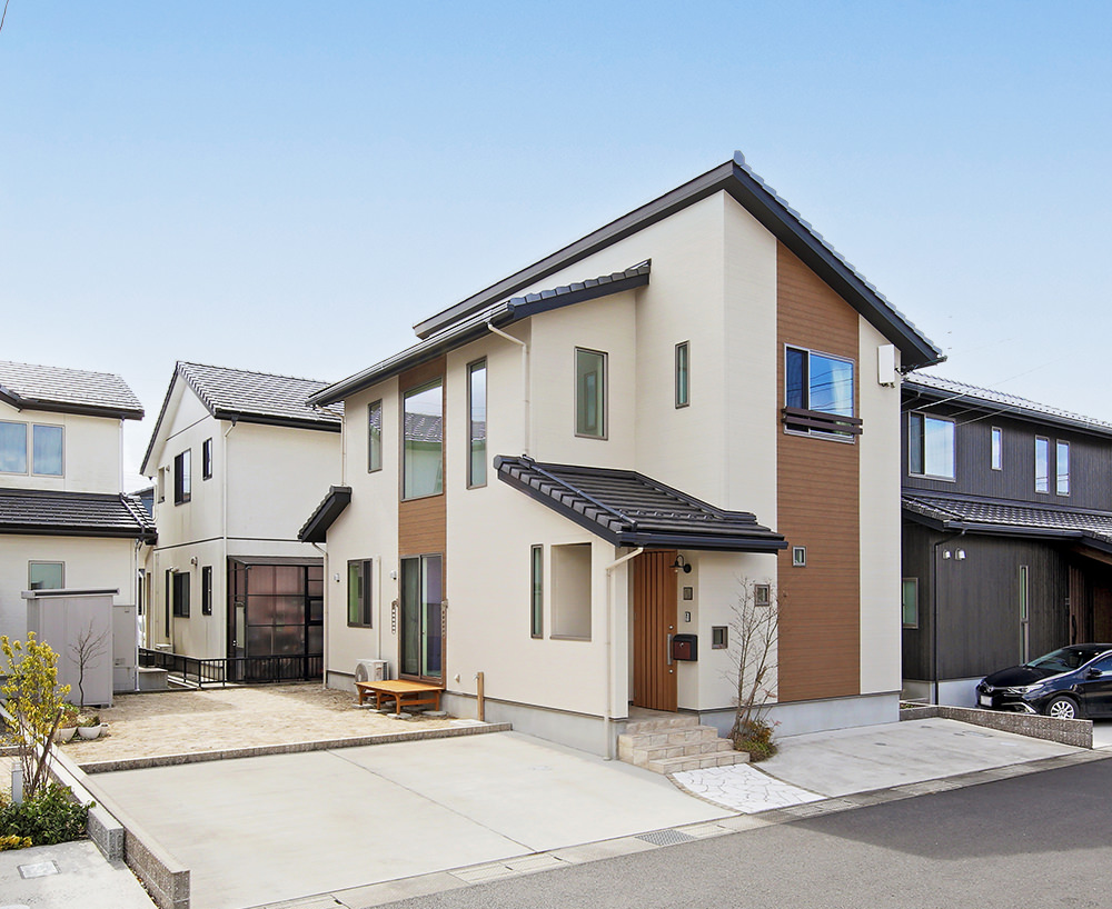 1 アシンメトリーさが印象的な招き屋根。アイボリー系の外壁をブラウンのサイディングが引き締めます。