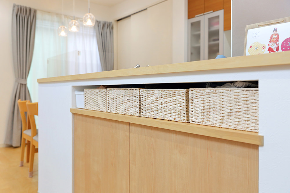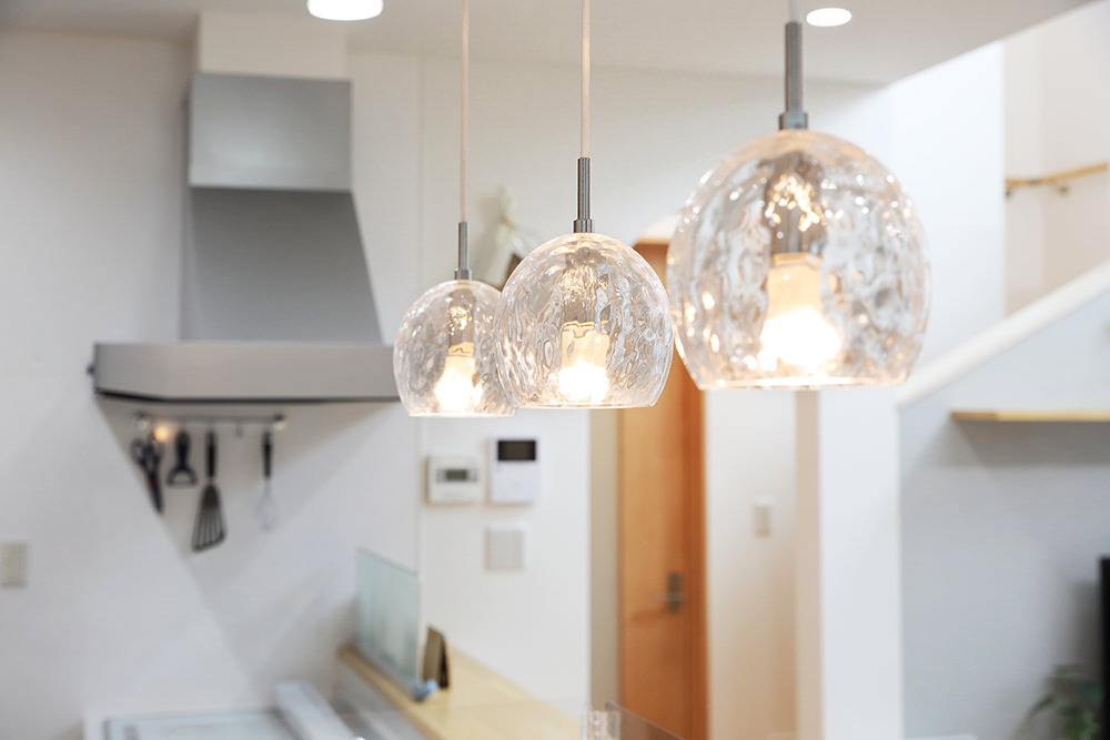 8 吹き抜けと大きな窓が光あふれる空間を生み出します。床は明るいサクラ材で、強度が高く遊び盛りのお子さんも安心。 9 カウンターのリビング側に収納を設置。「生活用品などをまとめて入れられるので、部屋がスッキリします」と奥様。 10 照明にこだわりのある施主様。キッチンは作業しやすい白色系、ダイニングは暖色系のペンダントをチョイス。