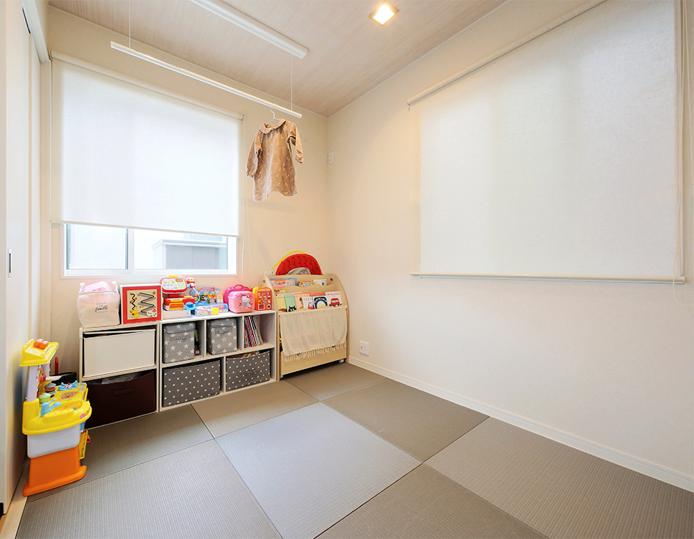 12 和紙のような質感のクロスで仕上げたリビング和室は、現在はお子さんの遊び場に。布団一式も収納できる余裕の押入れ付き。