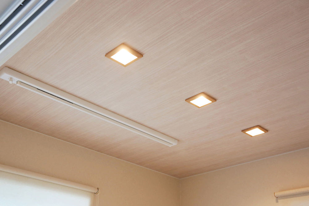 13 和室の天井に昇降式の室内干しのバーを設置。「戸を閉めて除湿器をかけると洗濯物があっという間に乾きます」と奥様。