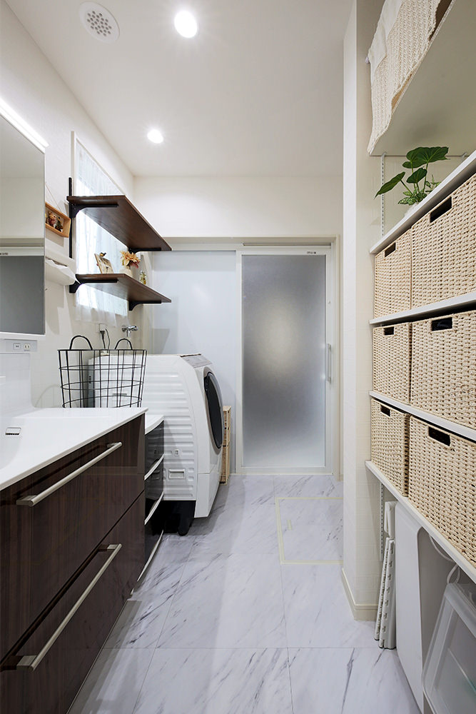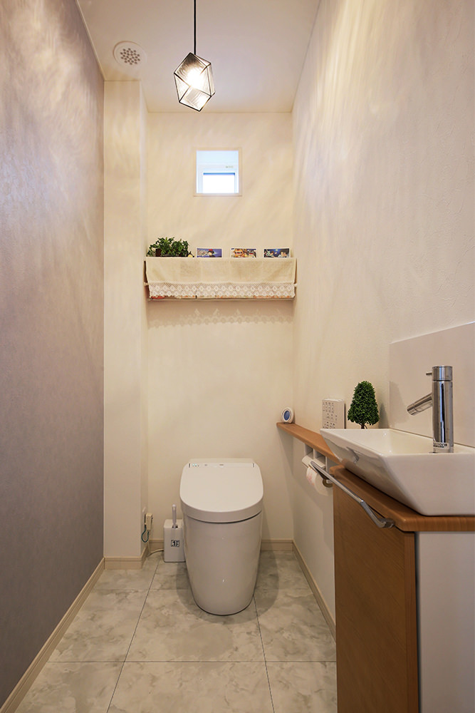 14 ランドリーに容量と自由度を兼ね備えた可動棚を設置。洗濯機の上の棚は洗剤などのちょっと置きに便利です。 15 トイレはグレー系の床材とアクセントクロスで落ち着いた雰囲気。ステンドグラス調の照明が安らぎを添えます。