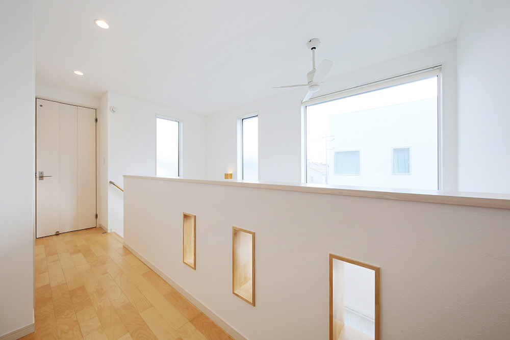 16 吹き抜けに面した2階ホールはLDKと連続性を持ち、吹き抜けの高窓と壁面にある小窓から明るい日差しが入ります。