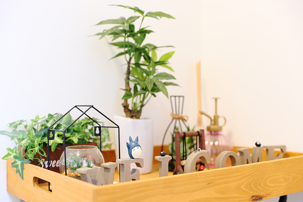 3 玄関は三輪車や釣り道具も置けるゆとりの空間。お気に入りの観葉植物や小物を飾っておもてなしの雰囲気作りも。