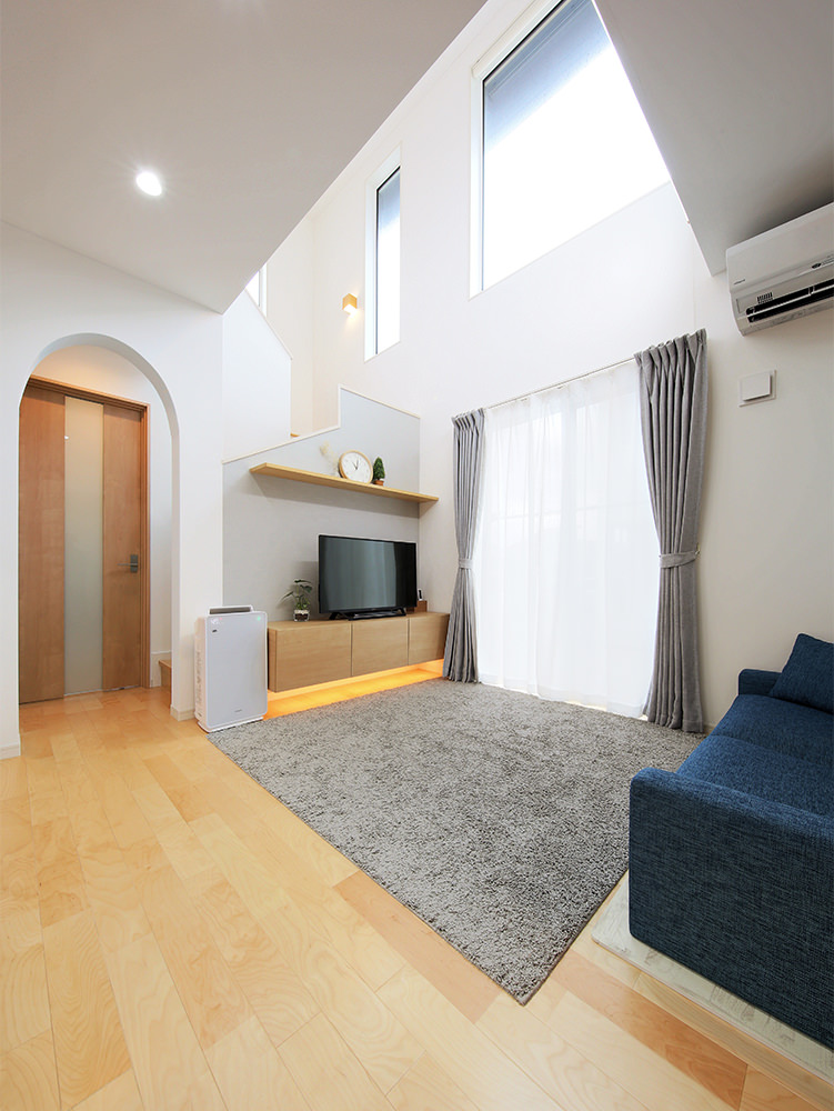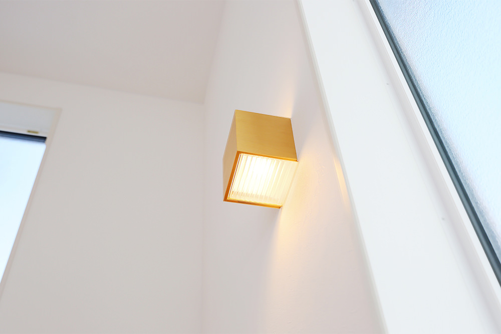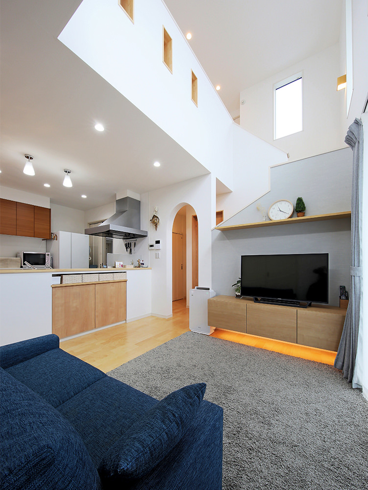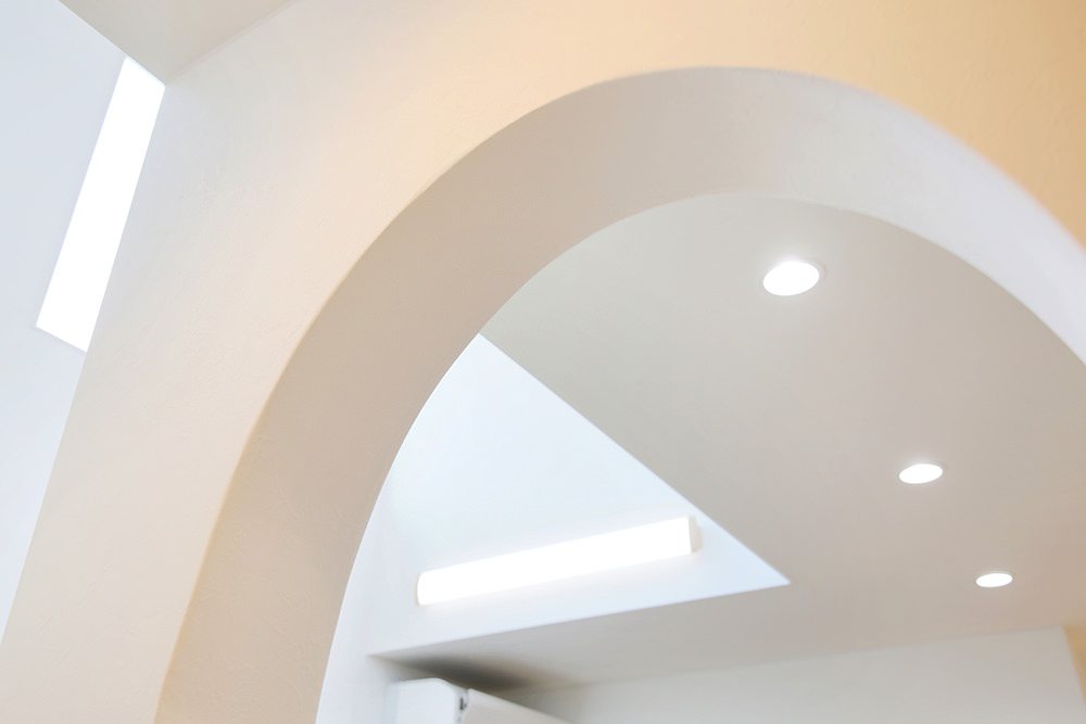 4 廊下とリビングを結ぶ出入り口は、優しい曲線のアーチ型。ちょっとした工夫が住まい全体の印象を変えます。 5 施主様がモデルハウスで気に入ったブラケットライトを、ひらぎのがバランス良くコーディネートして設置。 6 施主様お気に入りのリビング階段のデザインはひらぎのの提案。吹き抜けの開放感を高めながら可愛らしさをプラス。