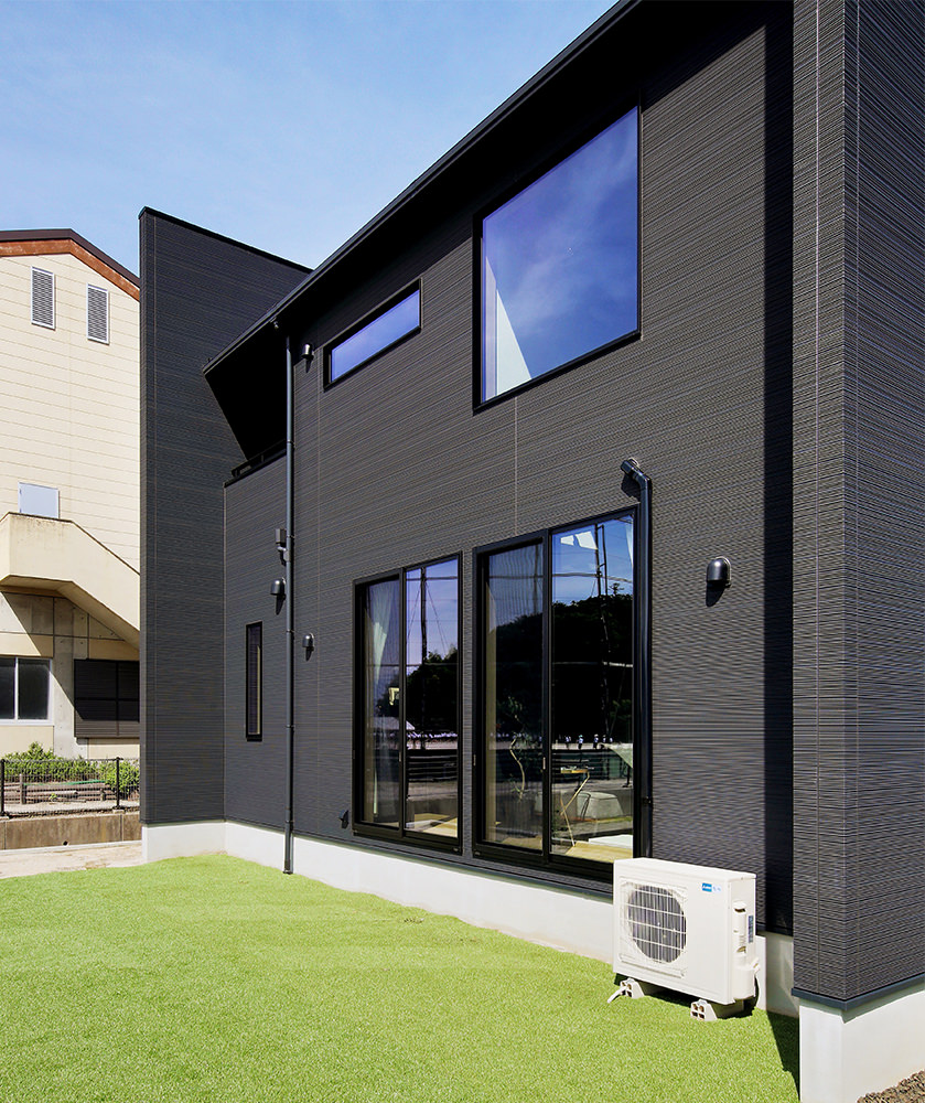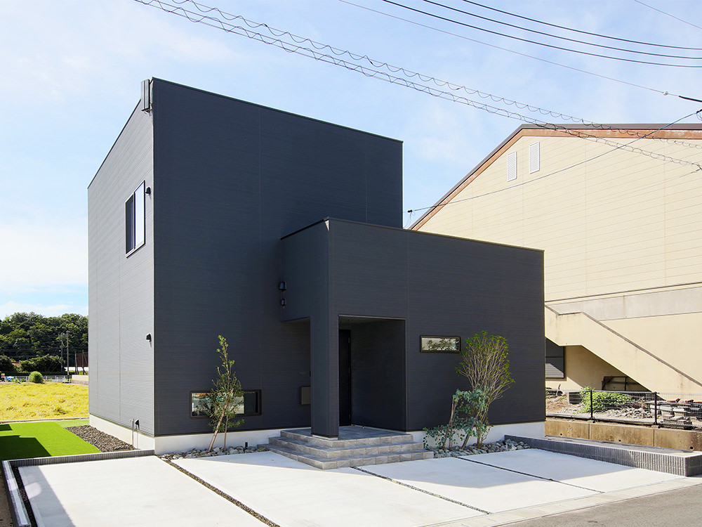 1 モダンなキューブ型の外観。表情のある外壁にはマックスチタンブラックを選んで。