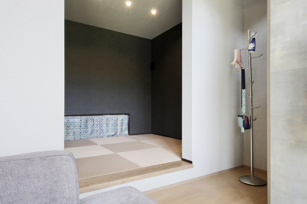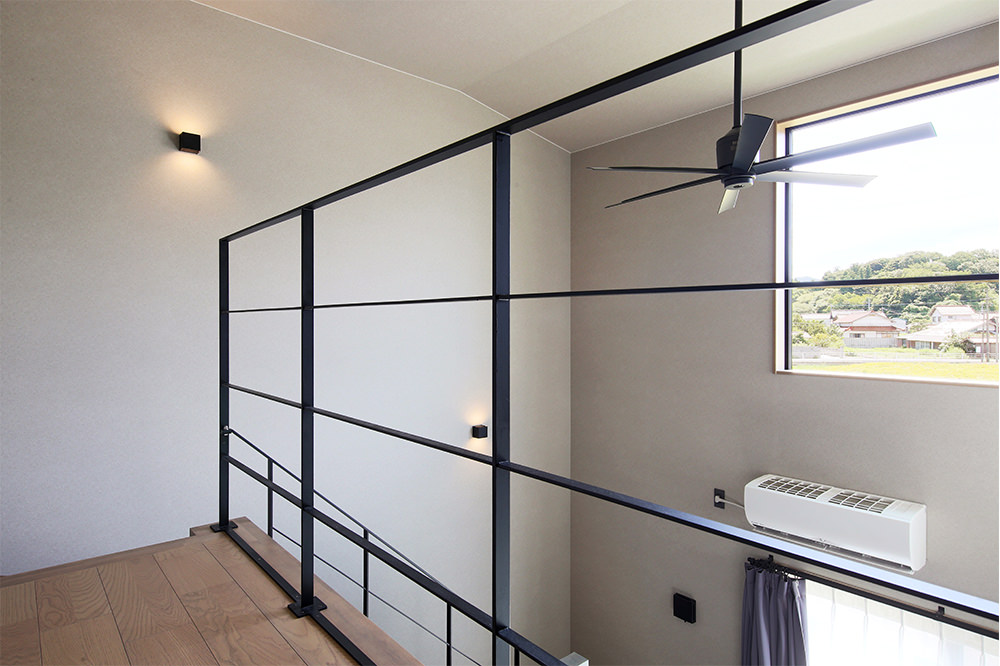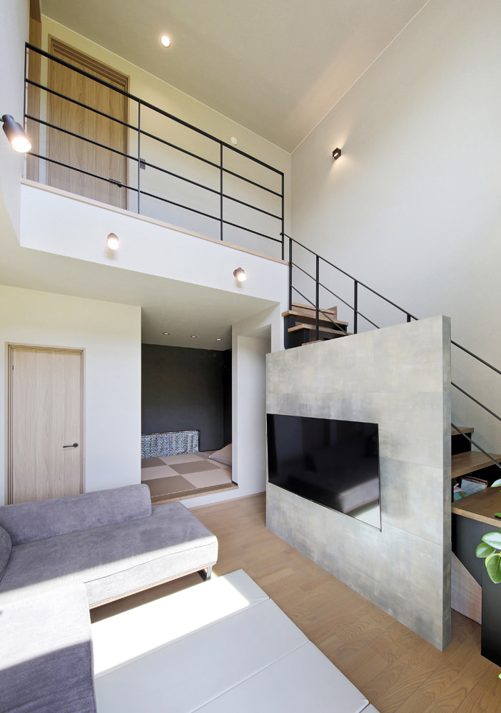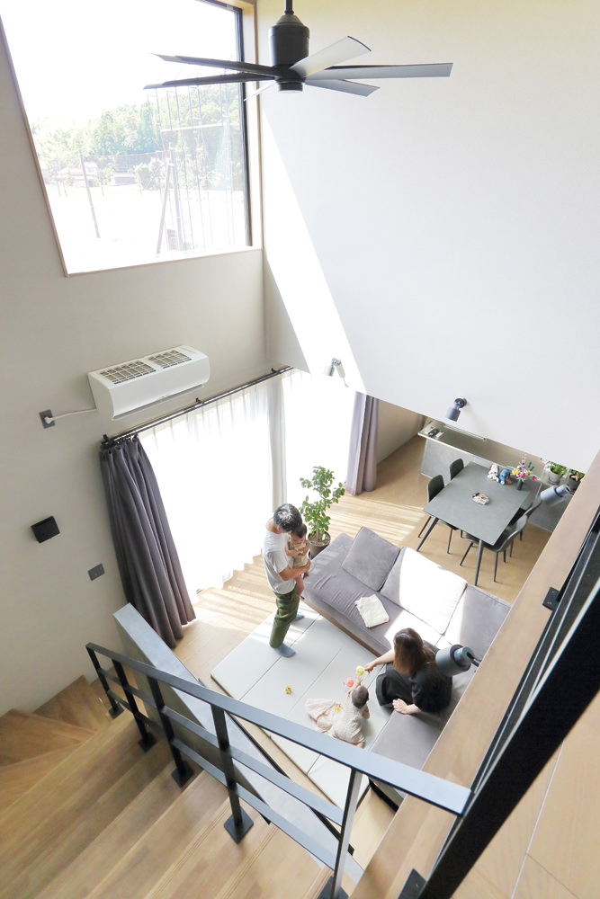 8 階段上から吹き抜けのリビングダイニングを見下ろして。 9 リビングからの続き間に小上がりの和室を設けて。畳の和み感は格別です。 10 階段から続く手すり、空気を循環させるシーリングファン、光を演出するブラケットライト…。細部までシックなアイアン調で統一させて。