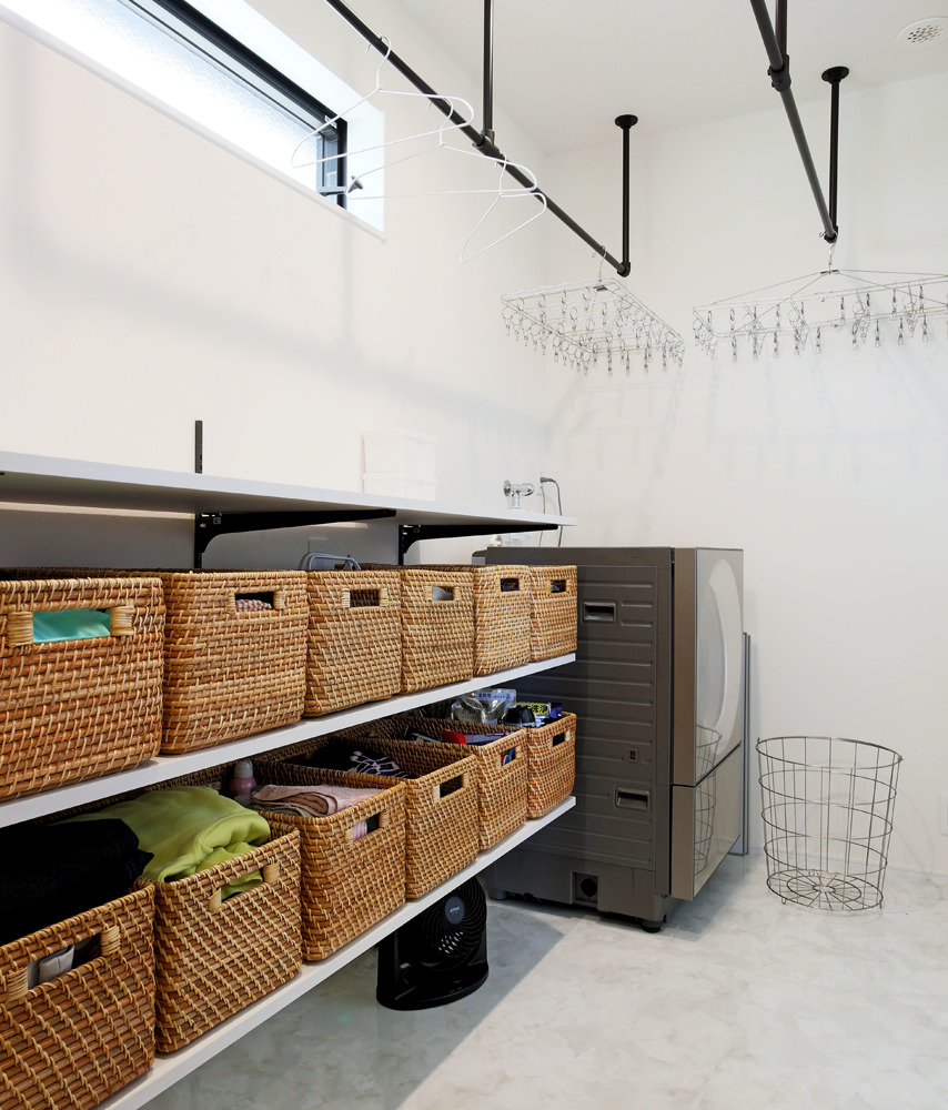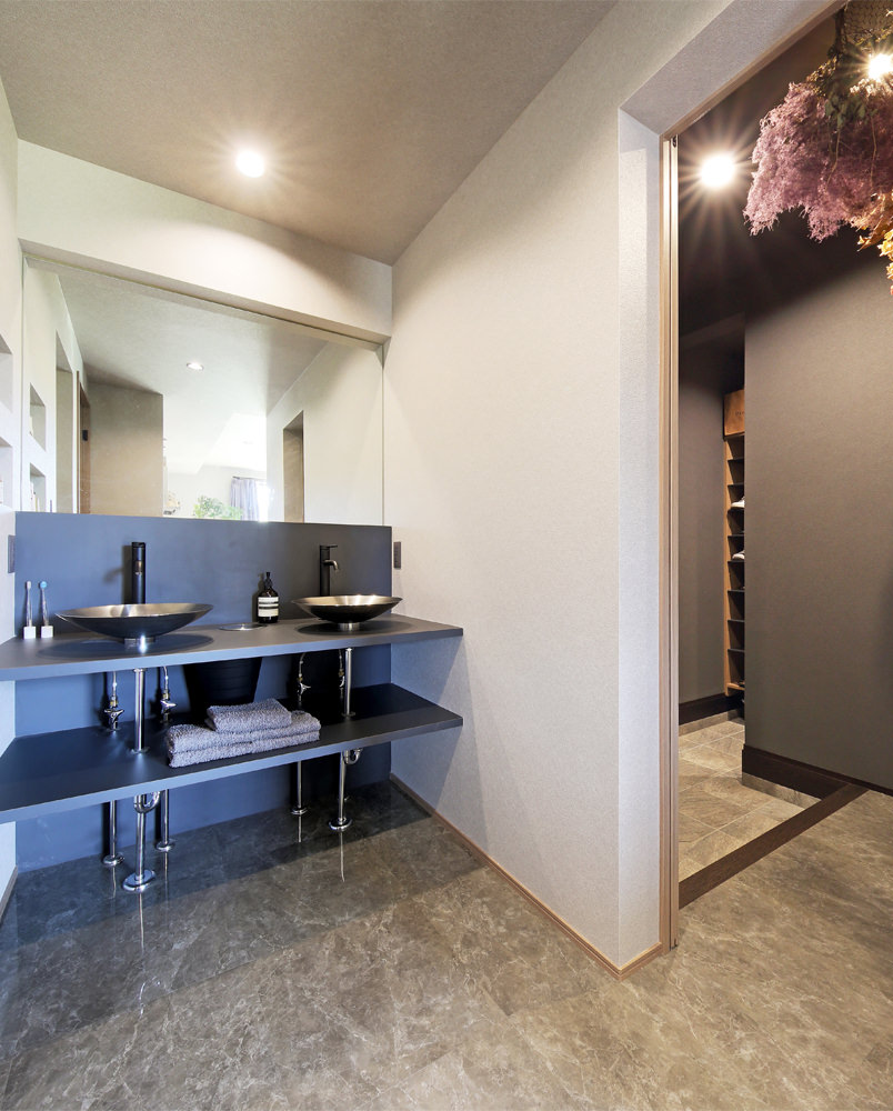11 洗面台には2ボウル、壁幅いっぱいに一枚鏡。「キレイに使おう」という意識も生まれるはず。 12 脱衣&ランドリー。3段の造作シェルフに大容量の衣類をバスケットで分類。