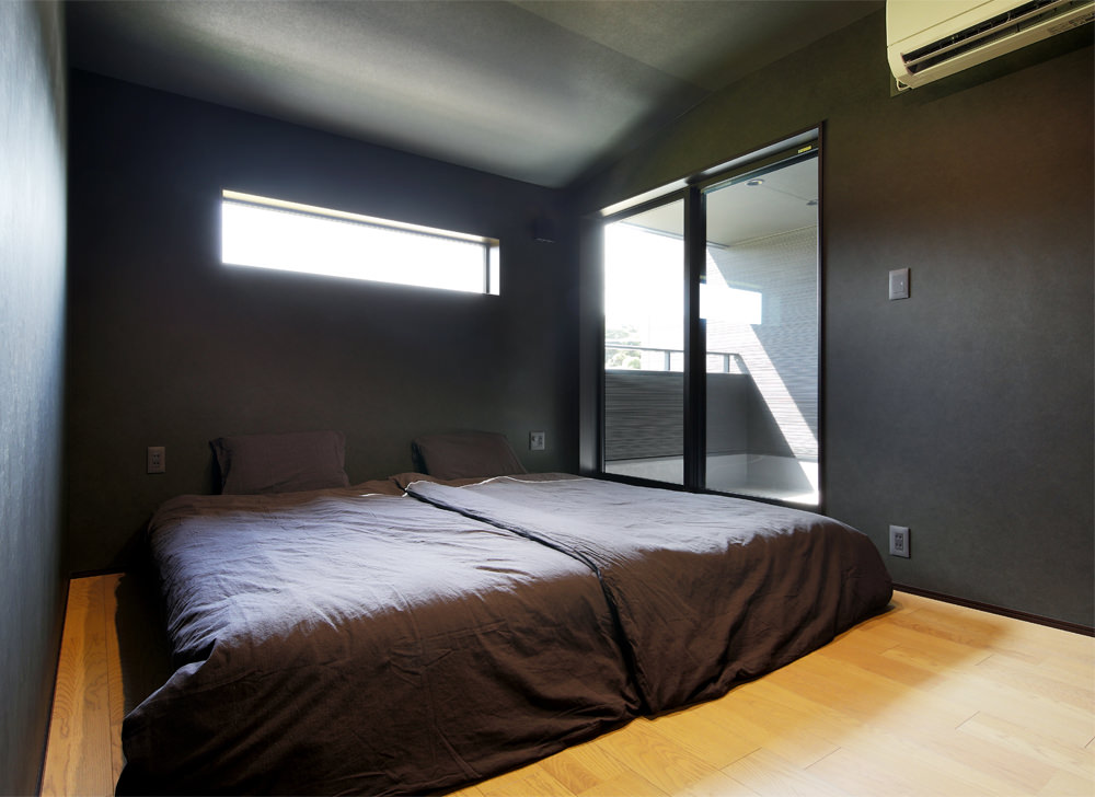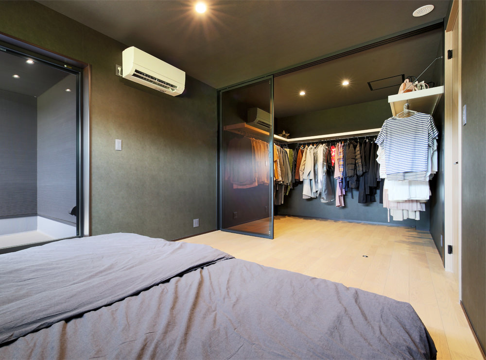13 2階ベッドルームのウォークインクローゼットは透明ガラスのスライドドア。圧迫感がなくいっそう広さを感じます。 14 2階ベッドルームにはリラックスできるチャコールグレーの壁紙を。横長のハイサイドライトも効果的。