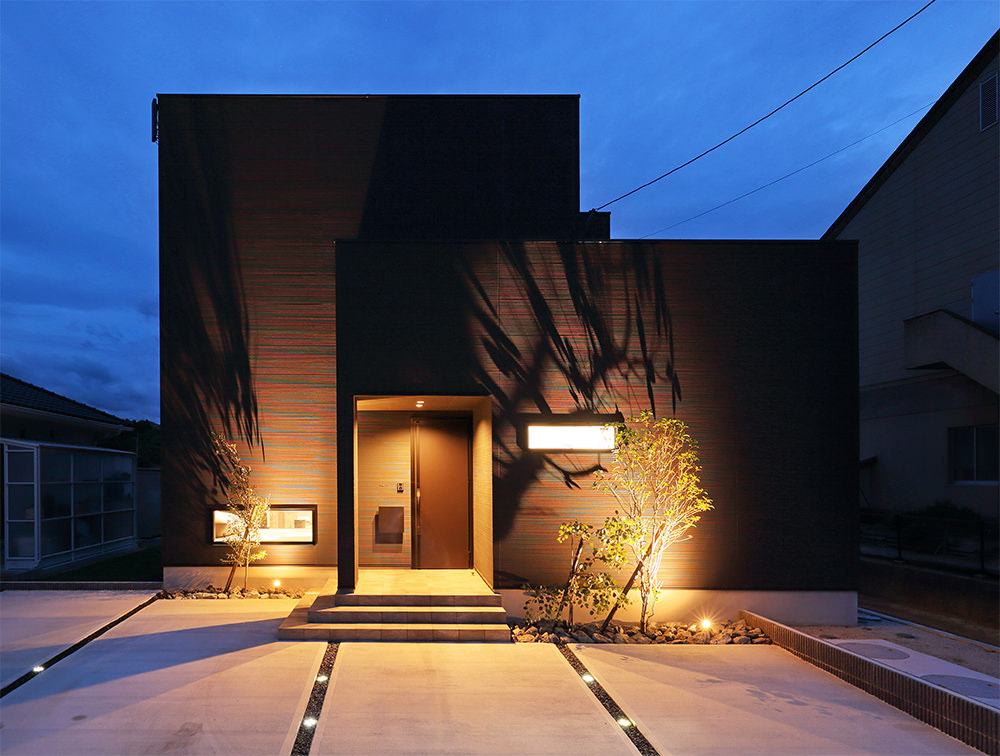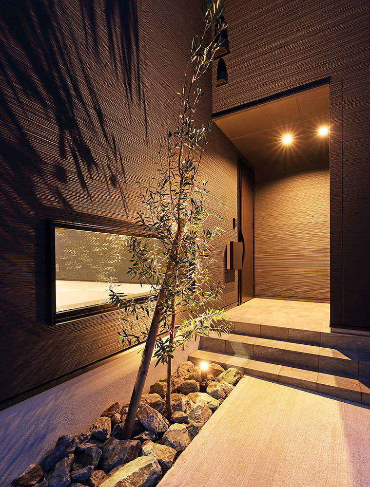 16 夜景も美しい玄関ポーチ。和室の地窓から漏れる灯りに安堵感が。 17 夜景までもがスタイリッシュ。地面に埋めたグラウンドライトが夜の駐車にもやさしい。